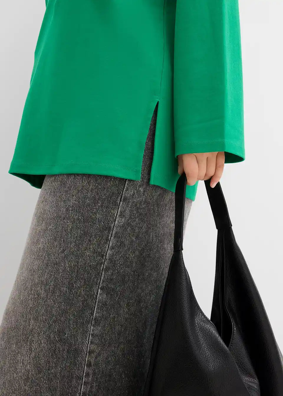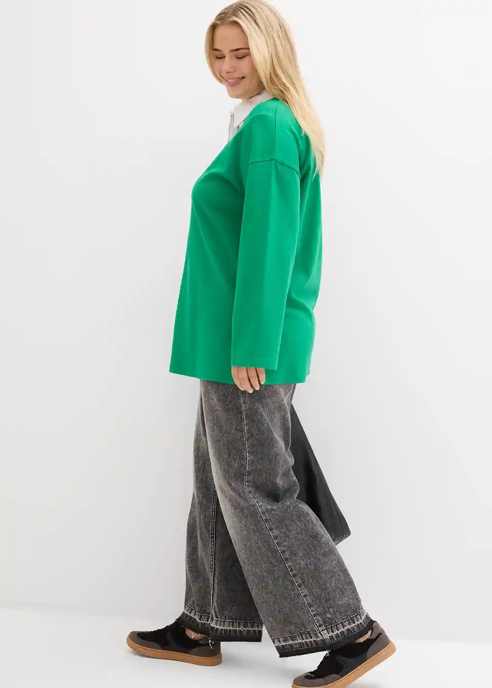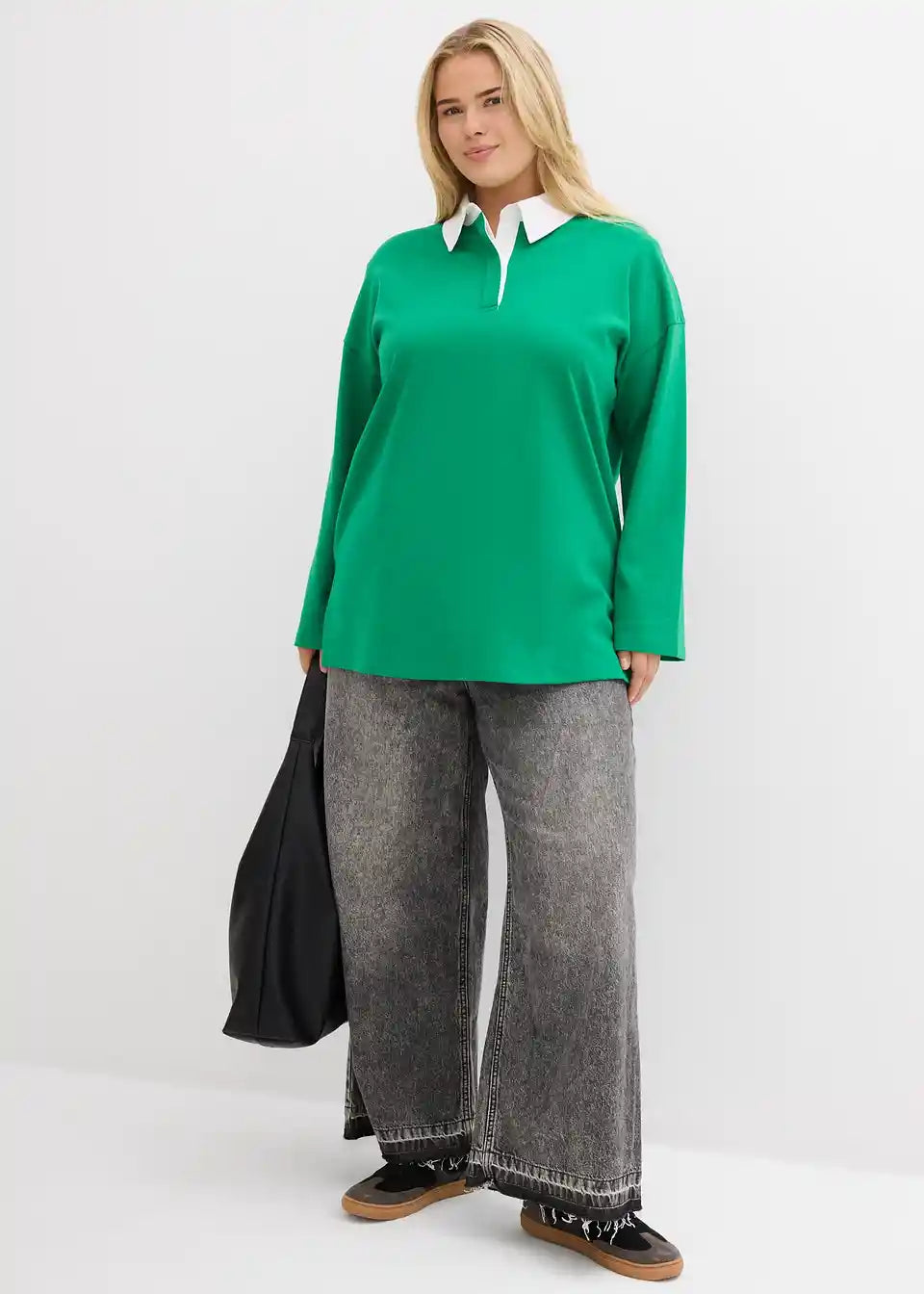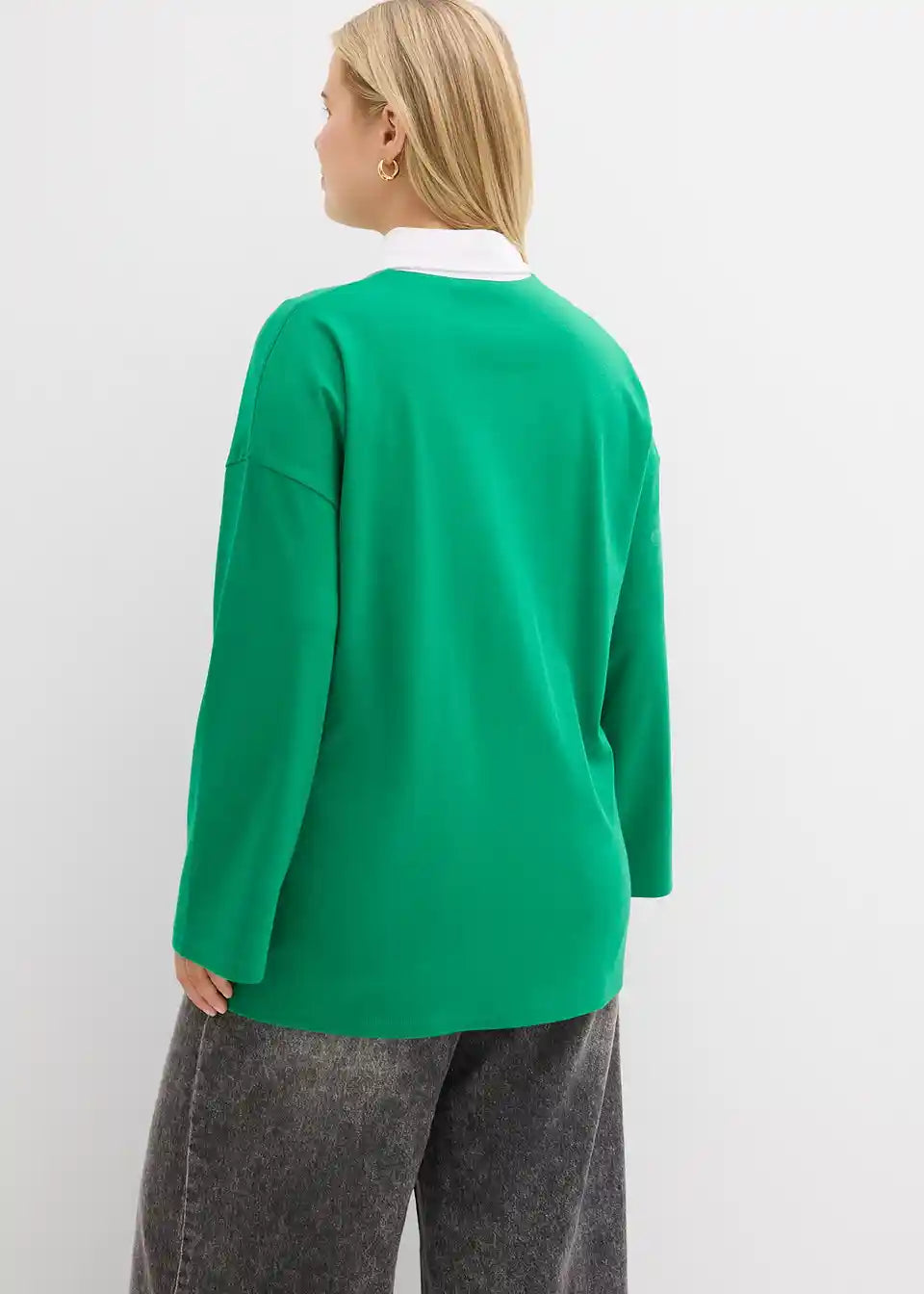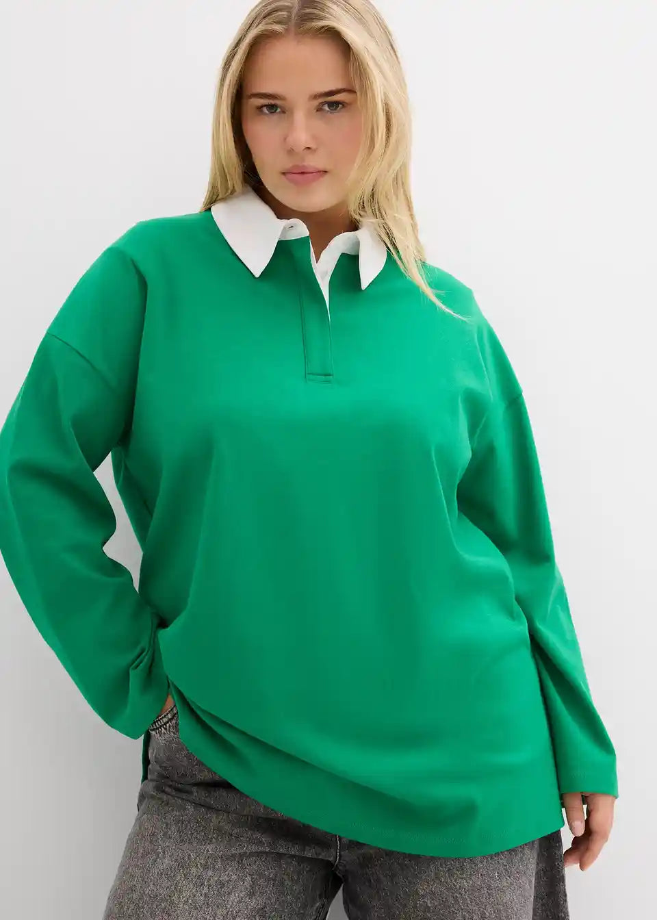 Oversize poloshirt z dolgimi rokavi in kontrastnim ovratnikom. S skrito zapenjanjem na gumbe in stranskimi razporki.