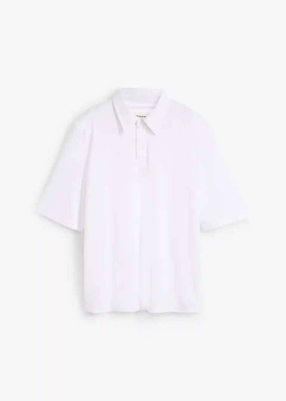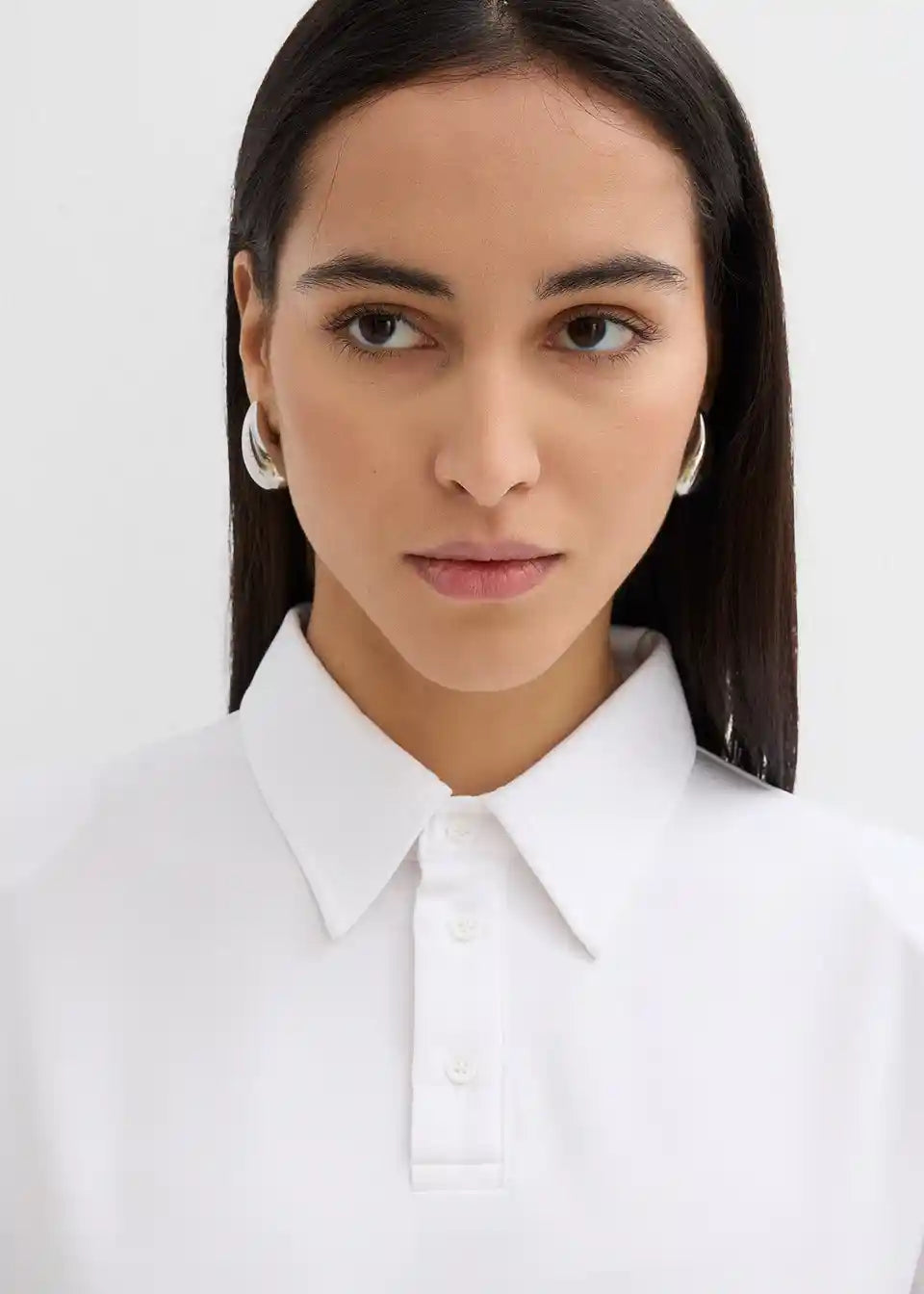 Kratek rokav s podloženimi rameni, klasično razprt ovratnik in kratka gumbnica pri izrezu