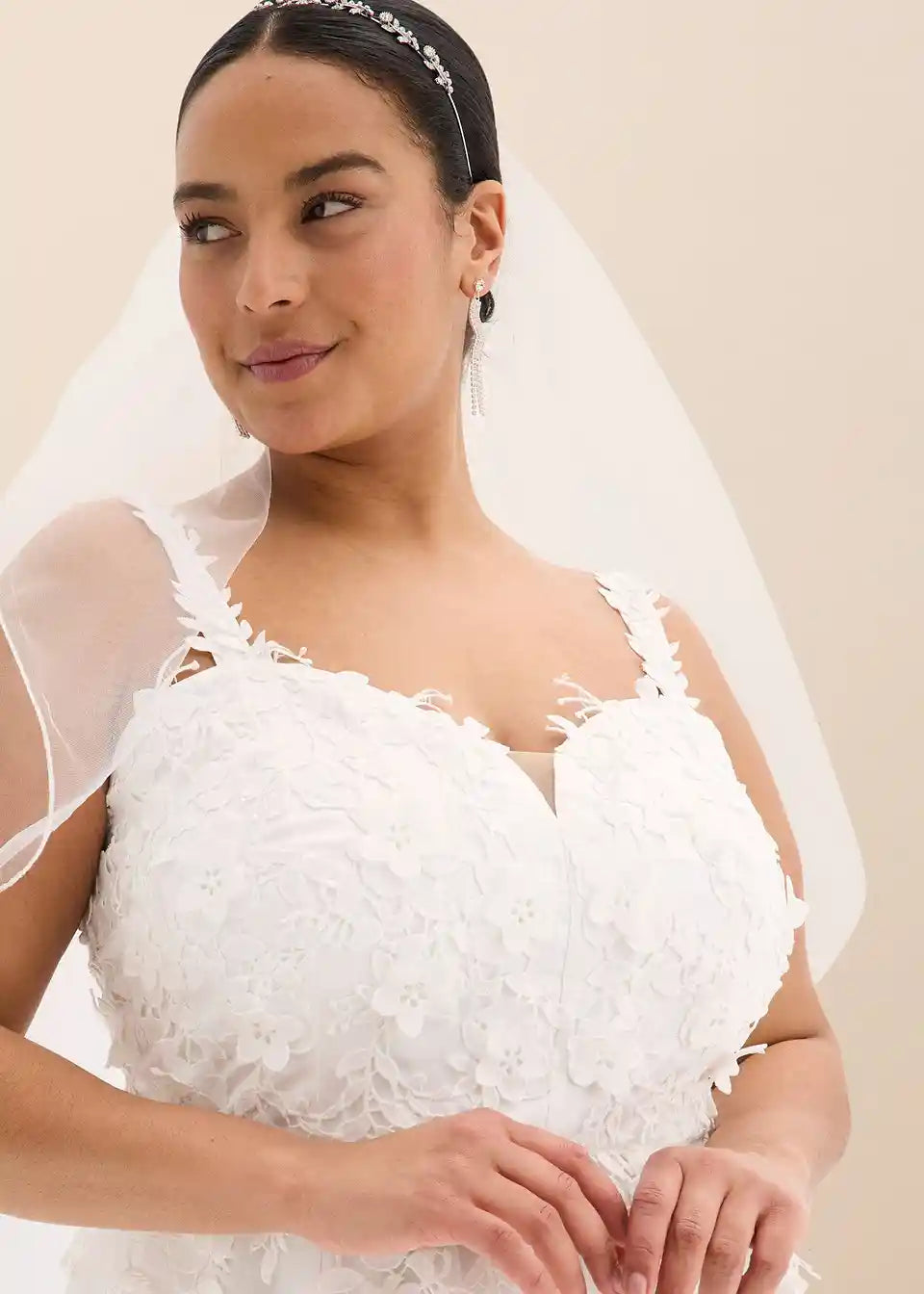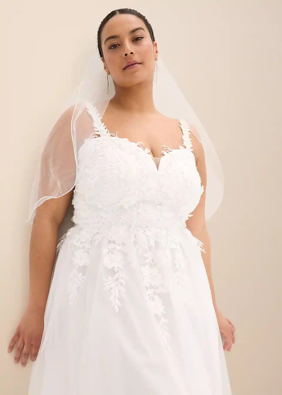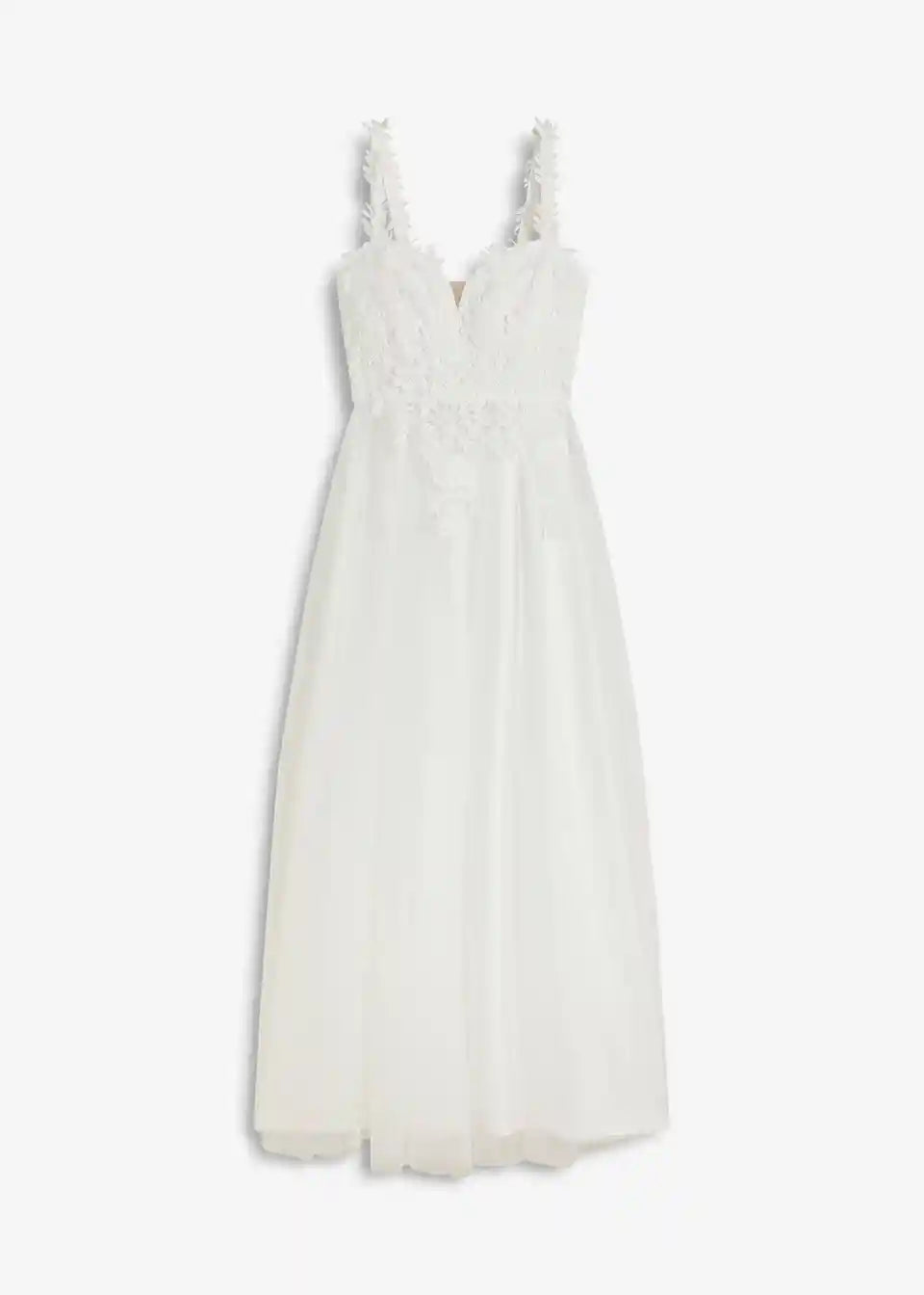 Romantična in sodobna: poročna obleka iz nežnega tila z očarljivo čipko na zgornjem delu in naramnicami z okrasjem iz čipke
