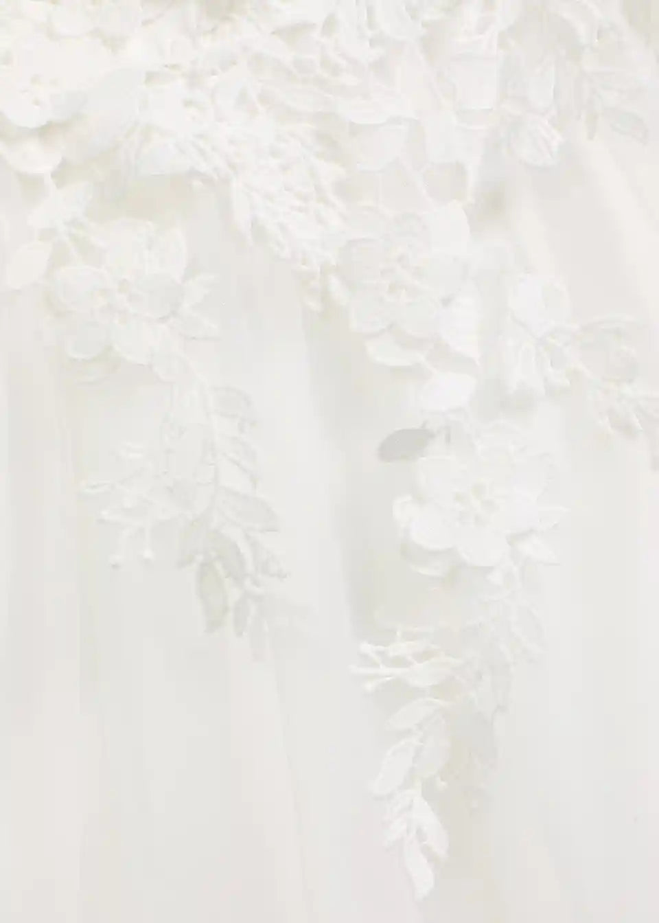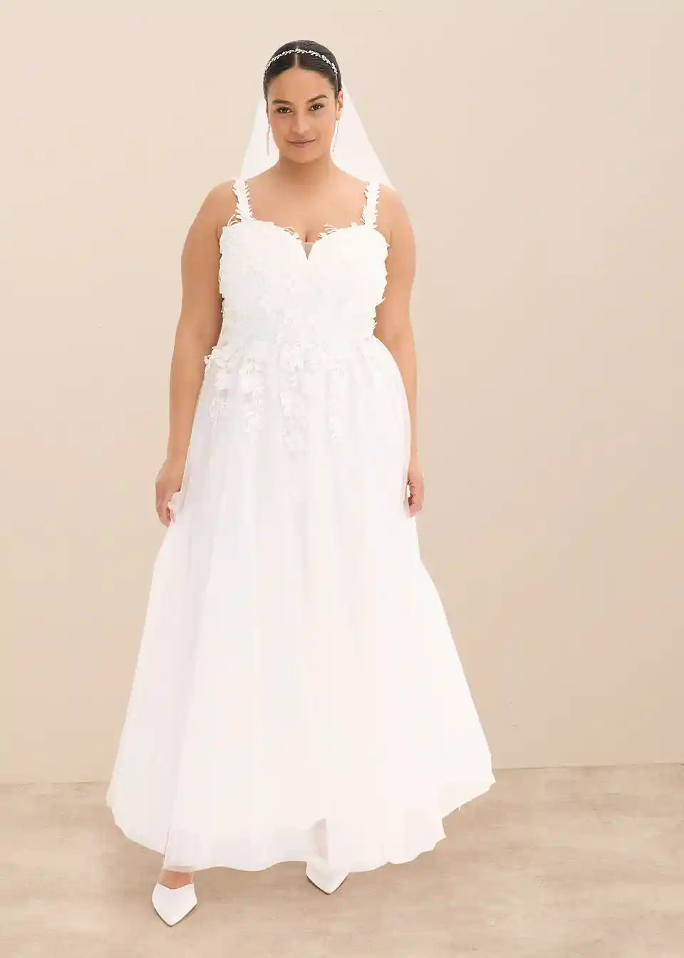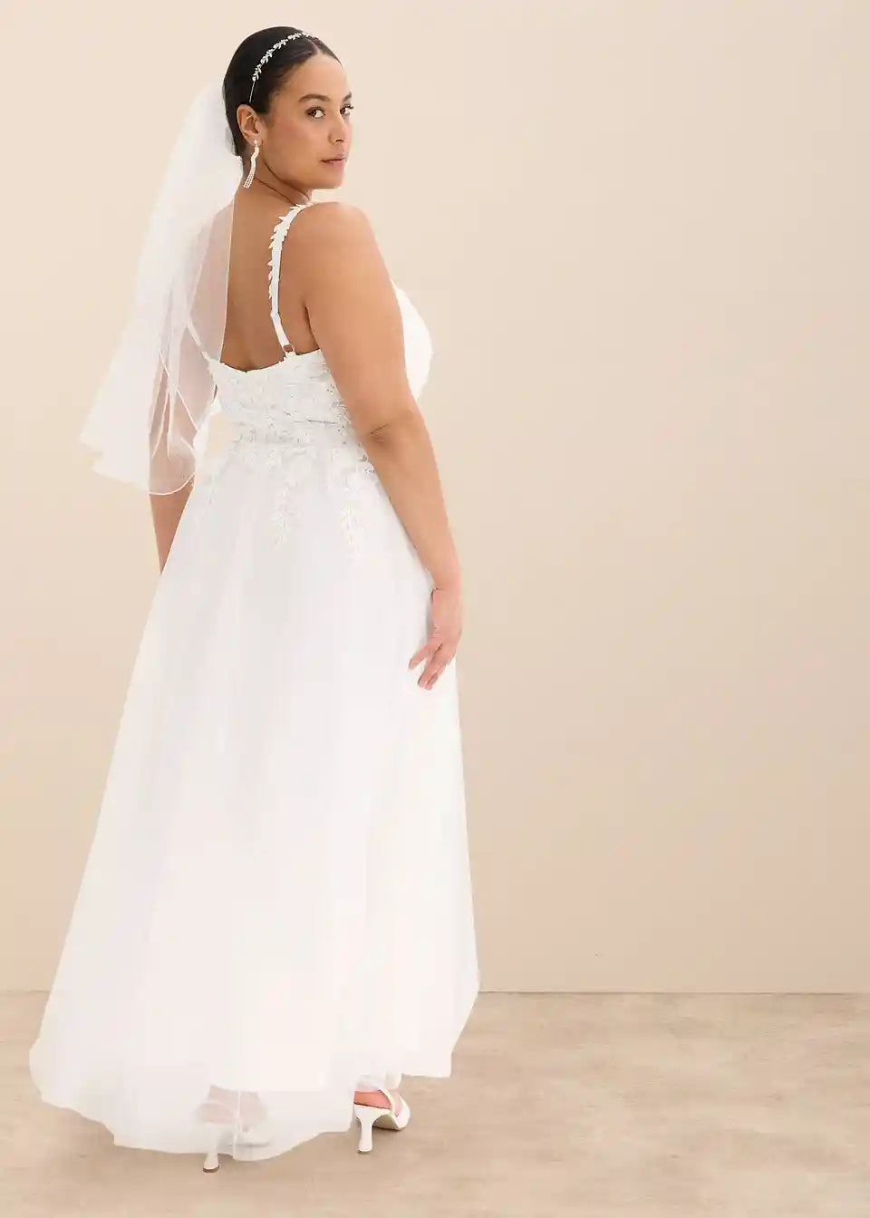 Romantična in sodobna: poročna obleka iz nežnega tila z očarljivo čipko na zgornjem delu in naramnicami z okrasjem iz čipke