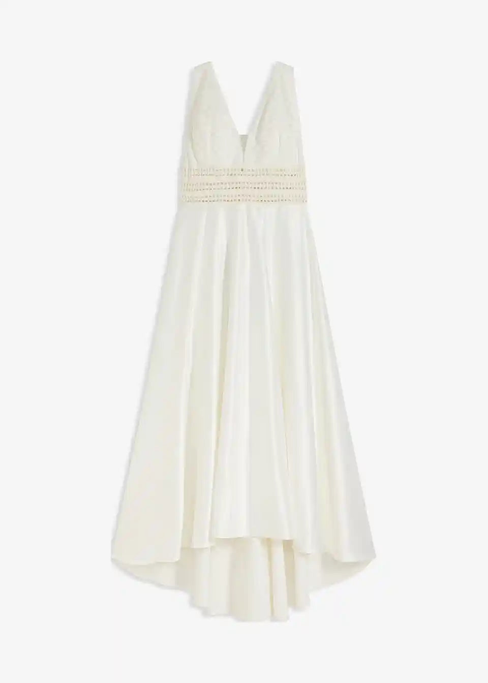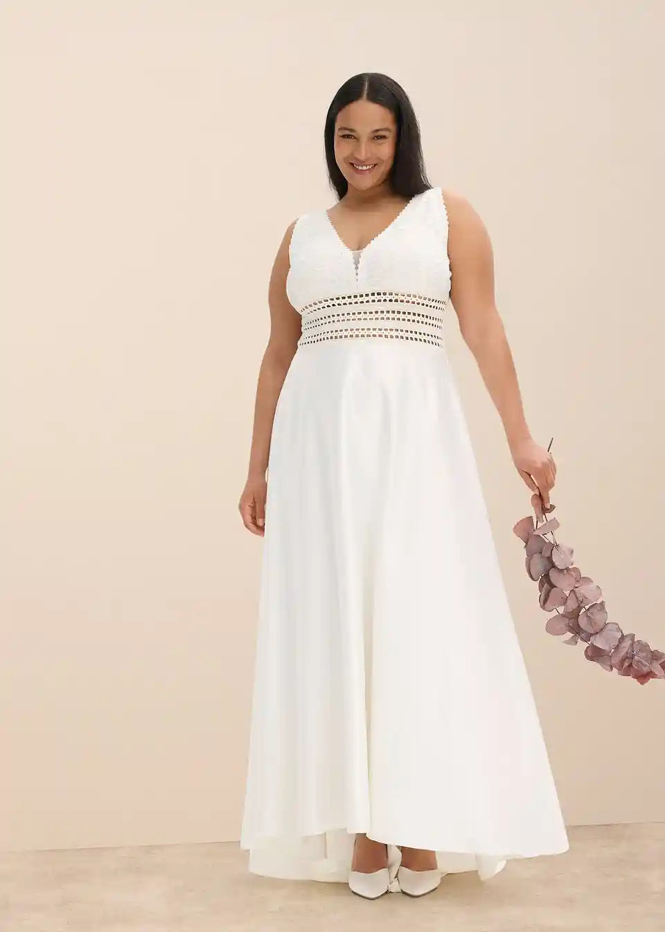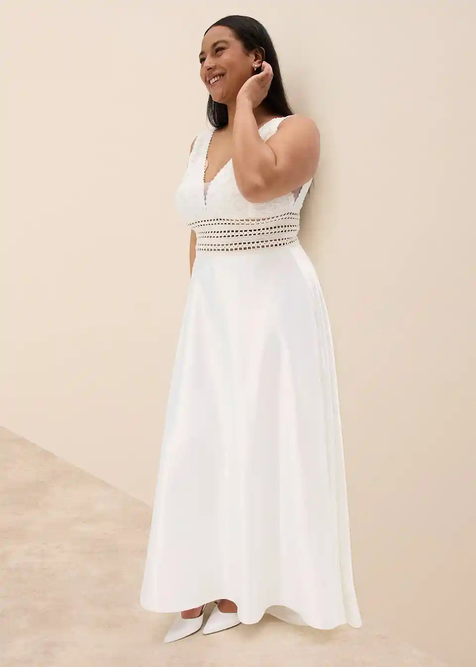 Moderna in ženstvena: Dolga poročna obleka iz sijočega satena s čipko na zgornjem delu in kvačkanim vložkom v pasu