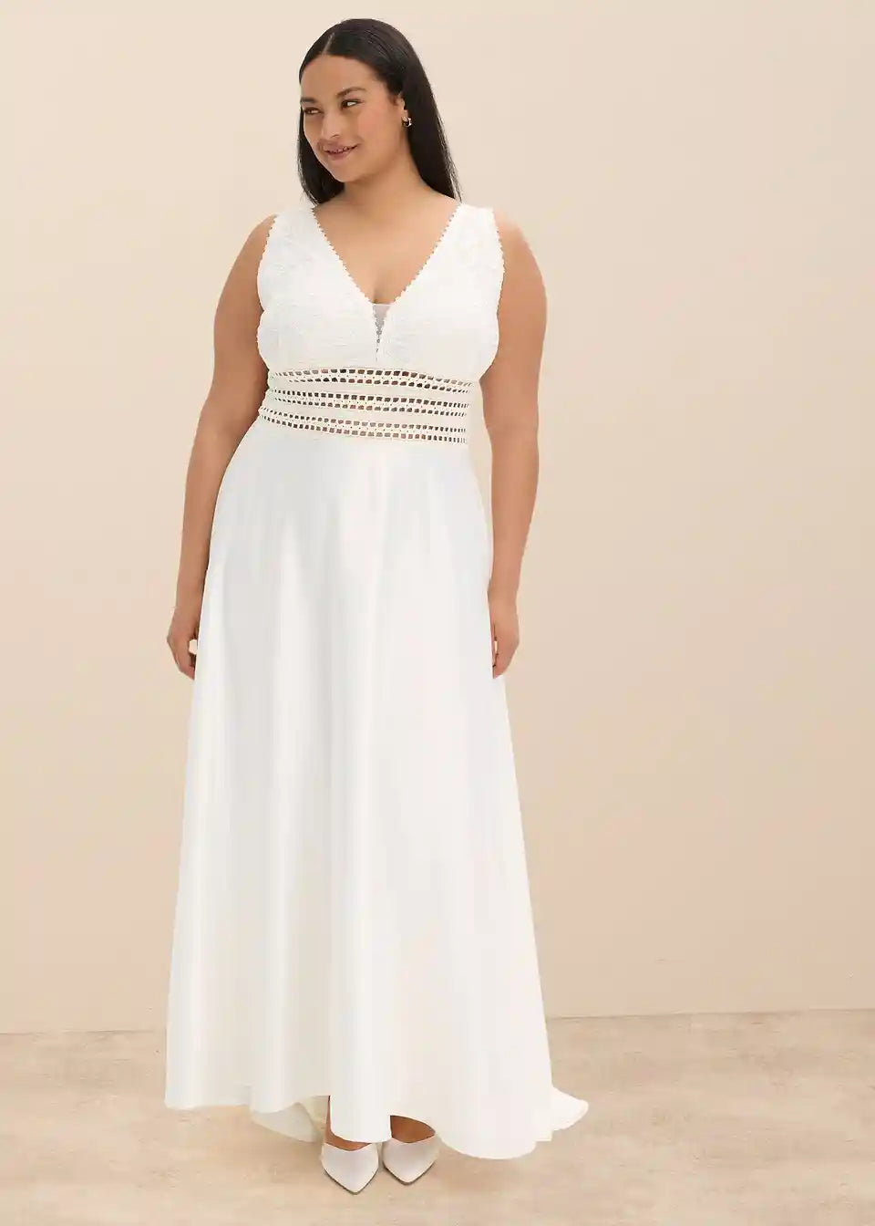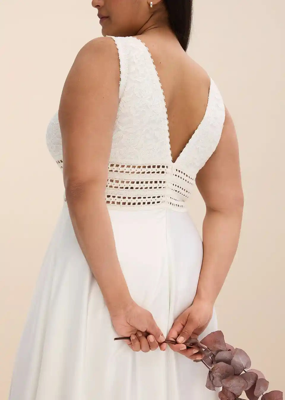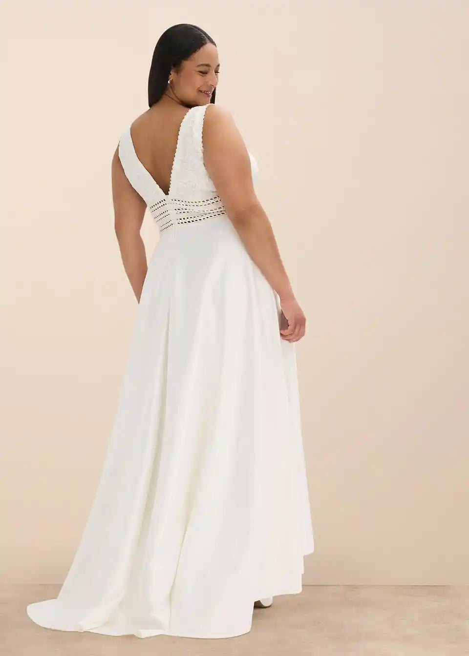 Moderna in ženstvena: Dolga poročna obleka iz sijočega satena s čipko na zgornjem delu in kvačkanim vložkom v pasu