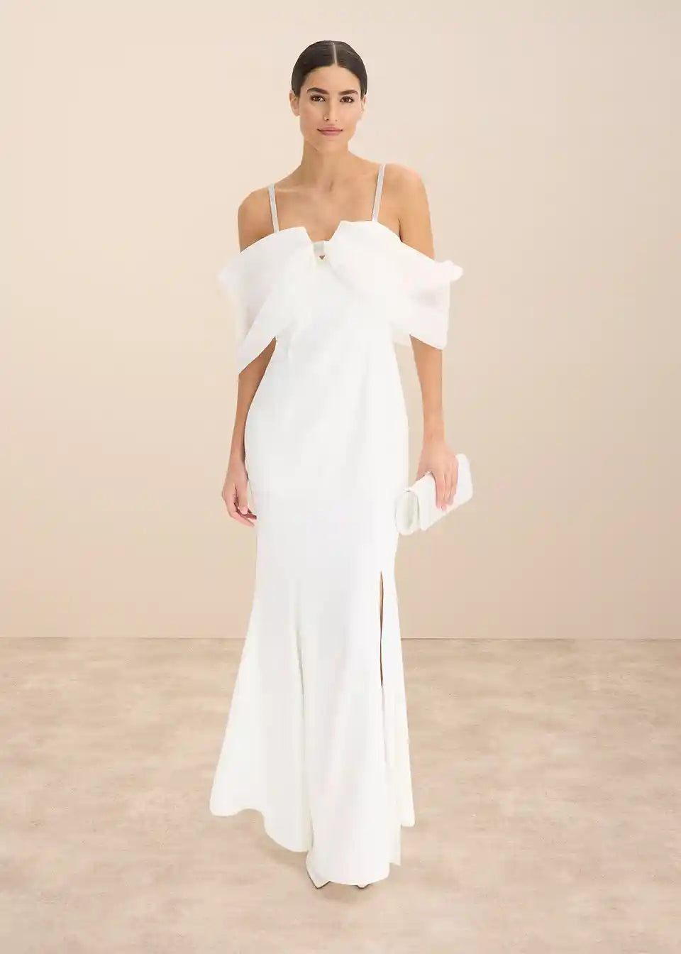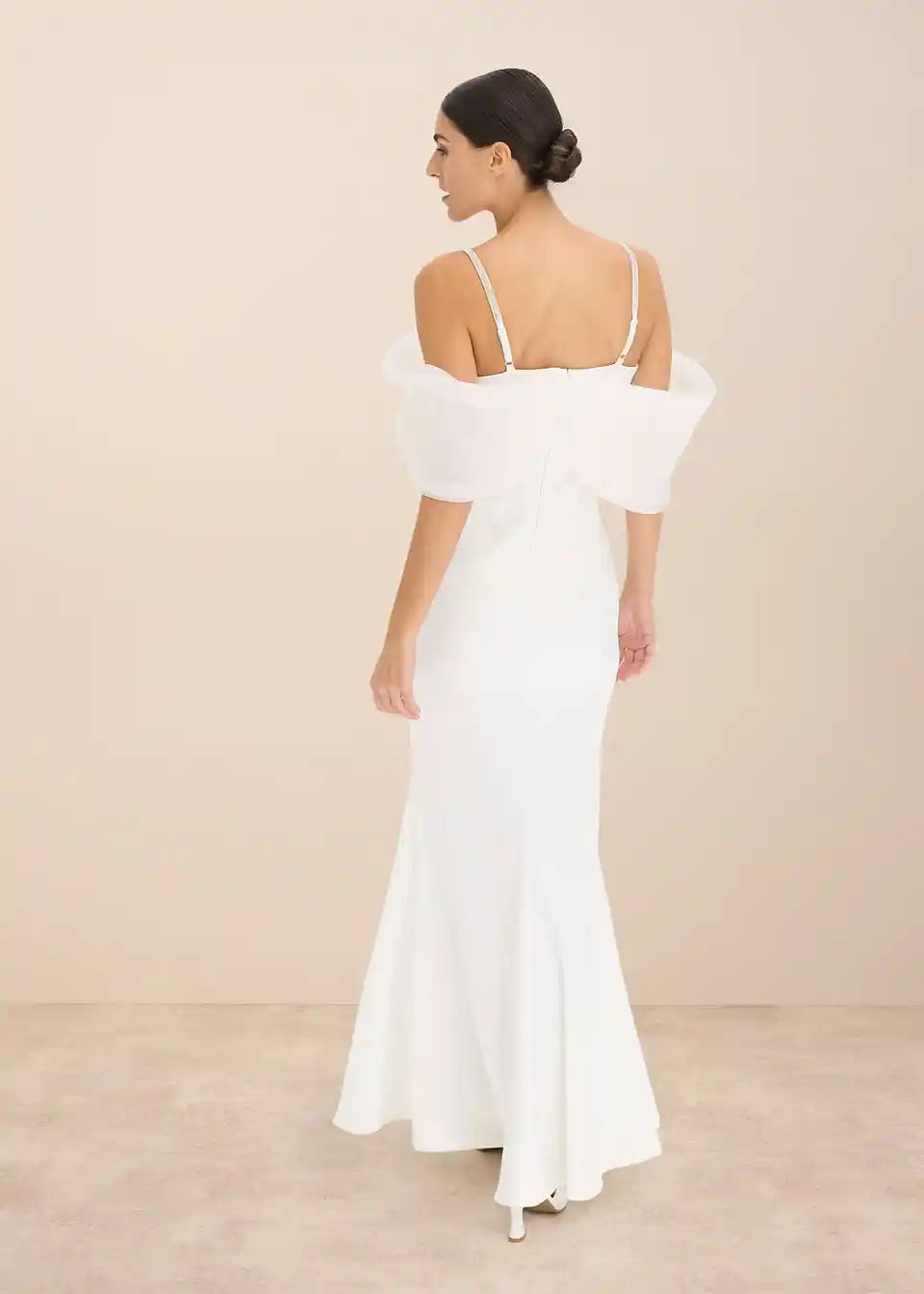 Moderna in ženstvena: dolga poročna obleka iz sijočega satena s pentljo iz nežnega tila in naramnicami z okrasnimi kamenčki