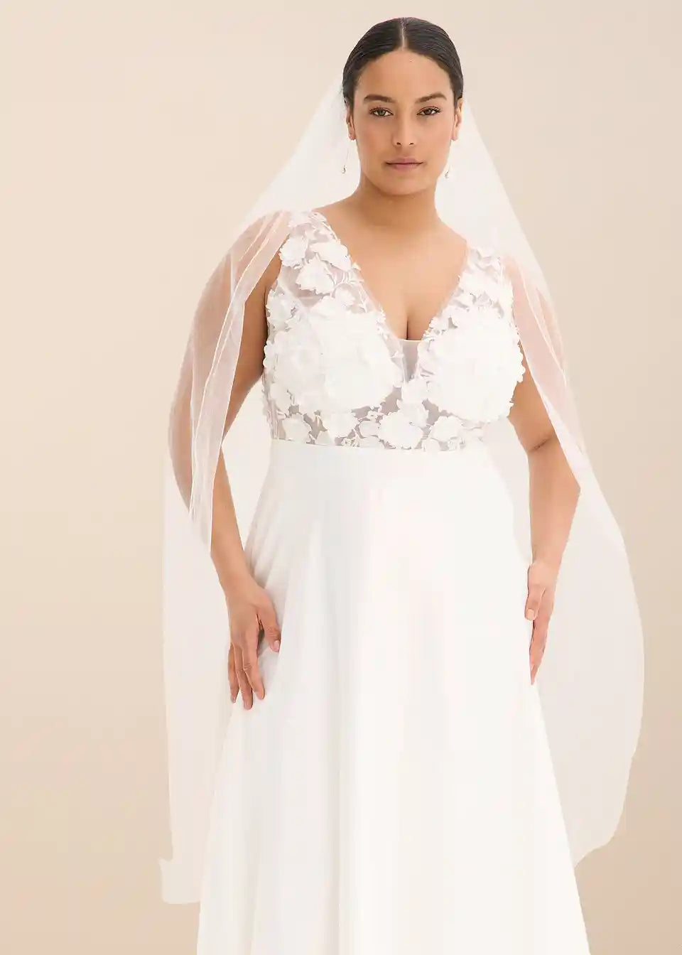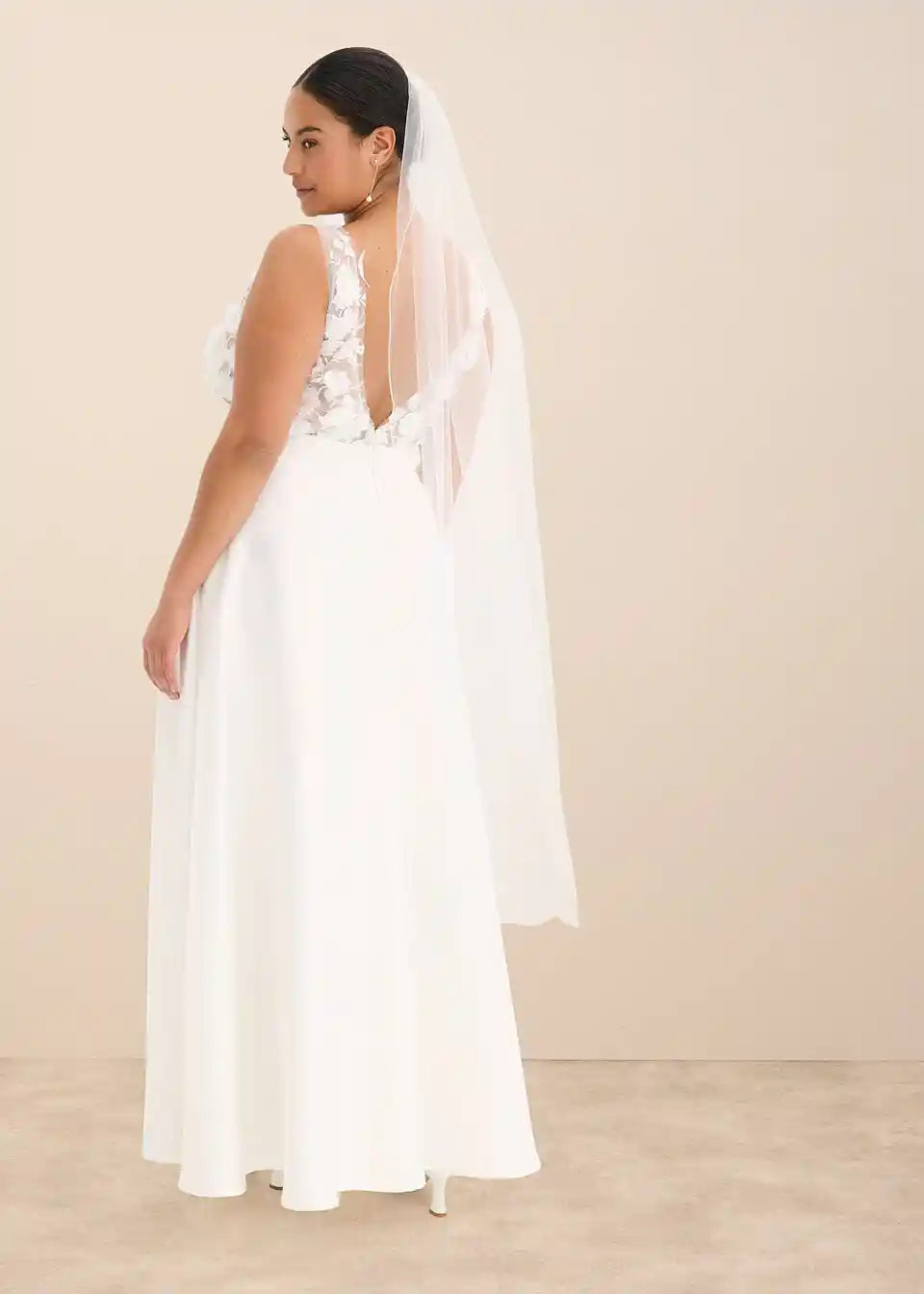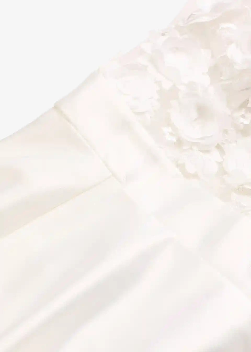 Poročna obleka iz sijočega satena s cvetlično aplikacijo