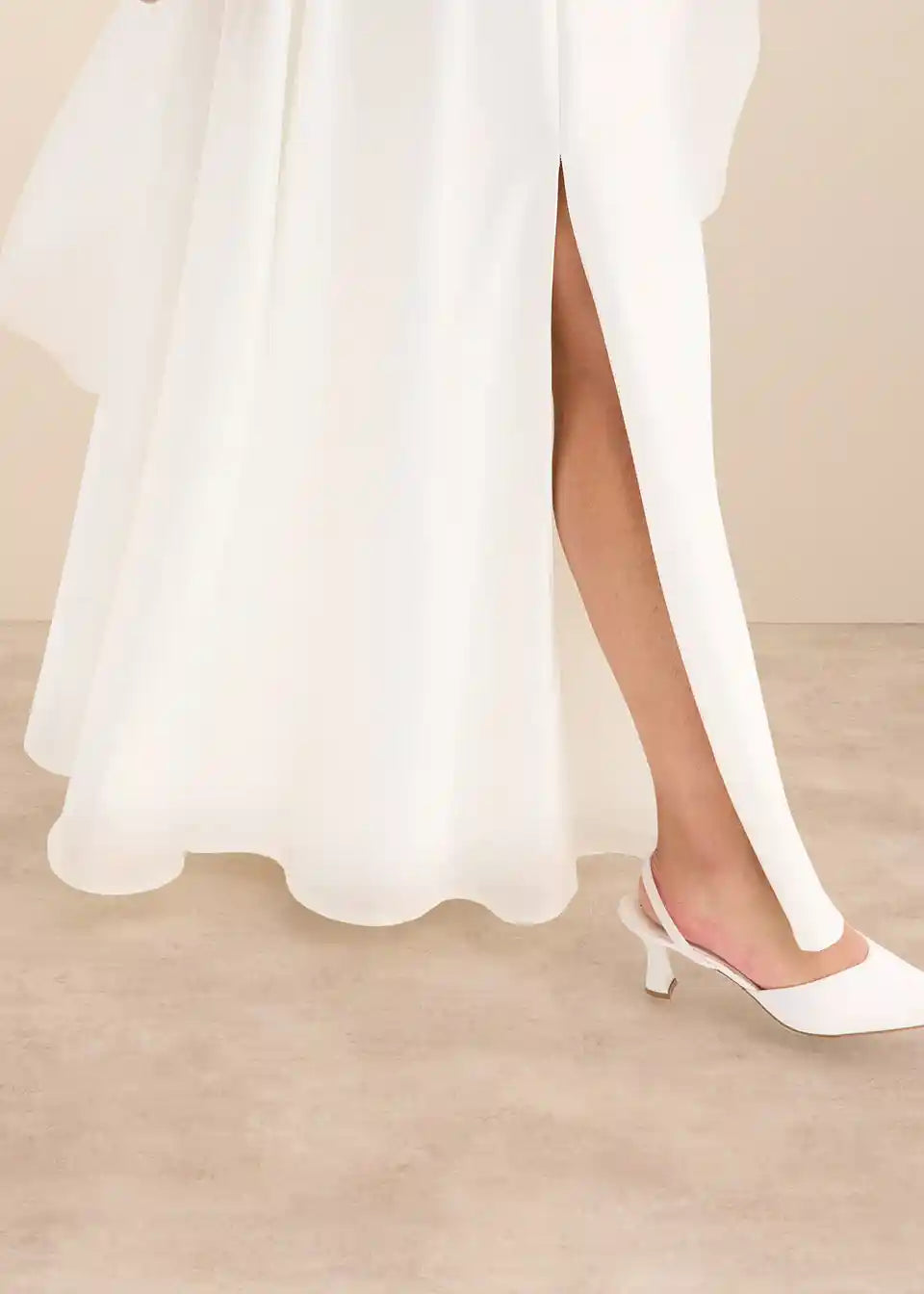 Moderna in ženstvena: Dolga poročna obleka iz sijočega satena z visokim razporkom in rožnim aplikacijam na zgornjem delu