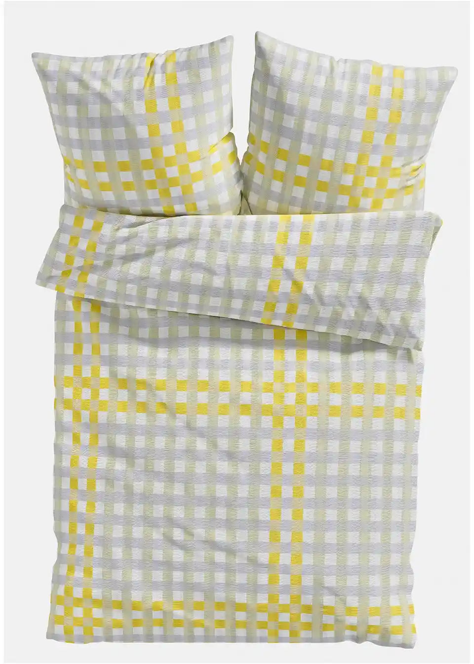 Posteljnina z modernim karirastim dizajnom v nežnih sivih tonih, dopolnjena z živahnimi rumenimi poudarki