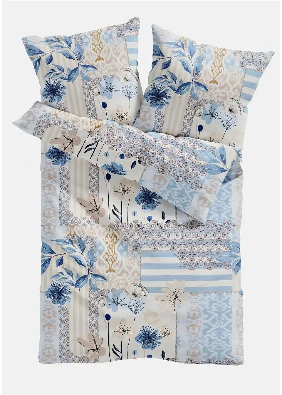 Živahen patchwork dizajn v modrih in kremnih tonih, ki združuje cvetlične motive z geometrijskimi vzorci.