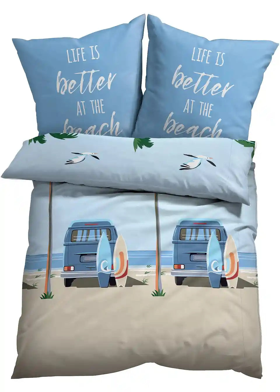 Posteljnina z avtomobilom in palmami na plaži, deska za surfanje, kampiranje