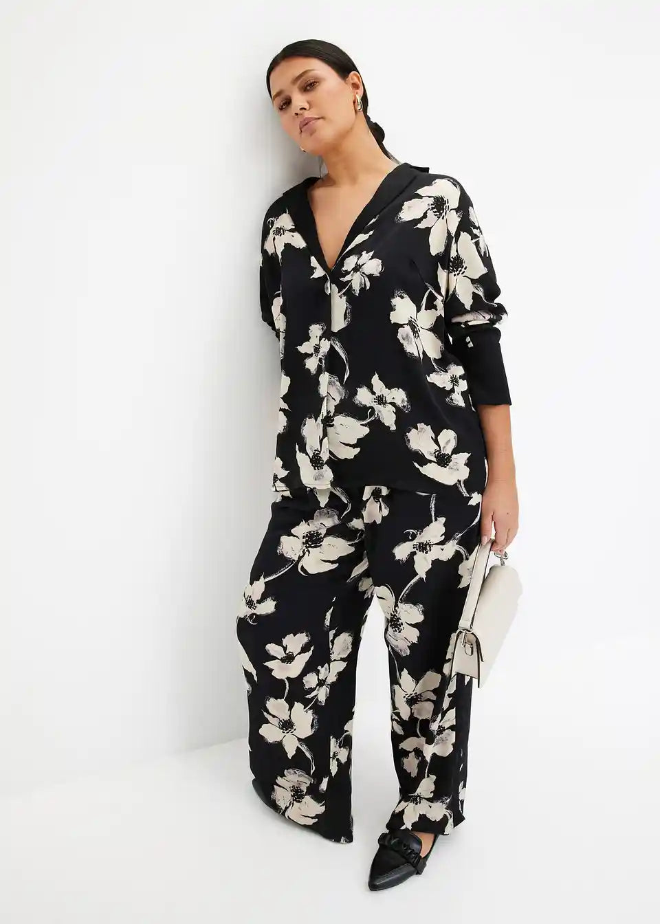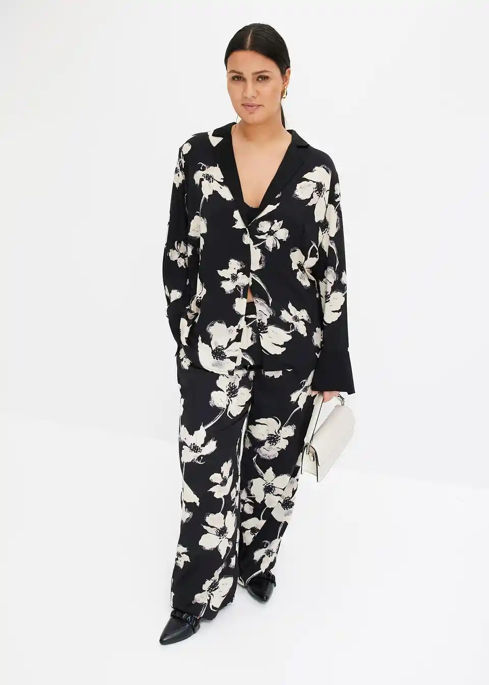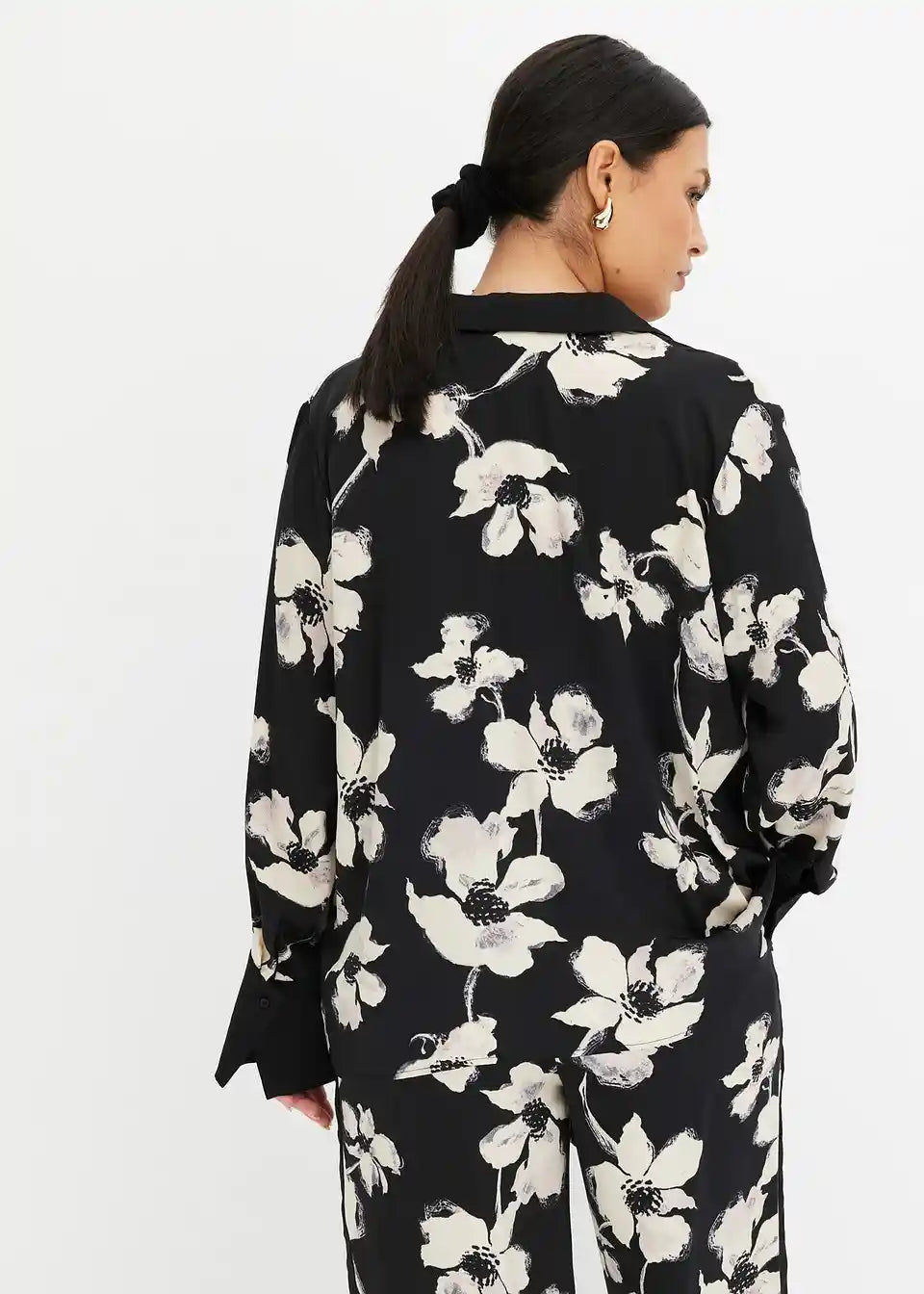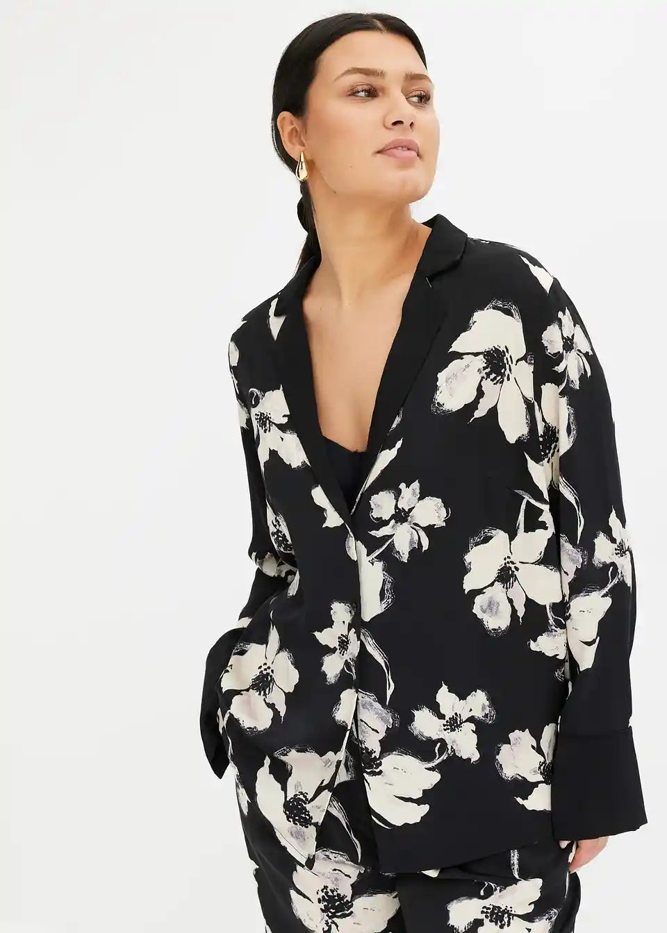 modna satenska bluza s cvetličnim potiskom in rever ovratnikom