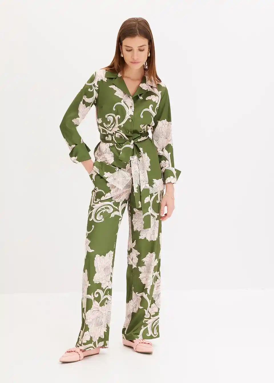ženska bluza iz tekočega satena z modnim cvetličnim potiskom