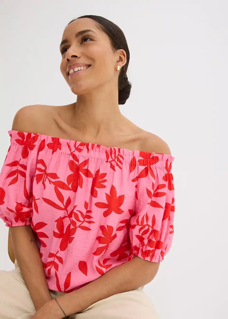 Potiskana bluza s carmen izrezom iz fine viskozne mešanice