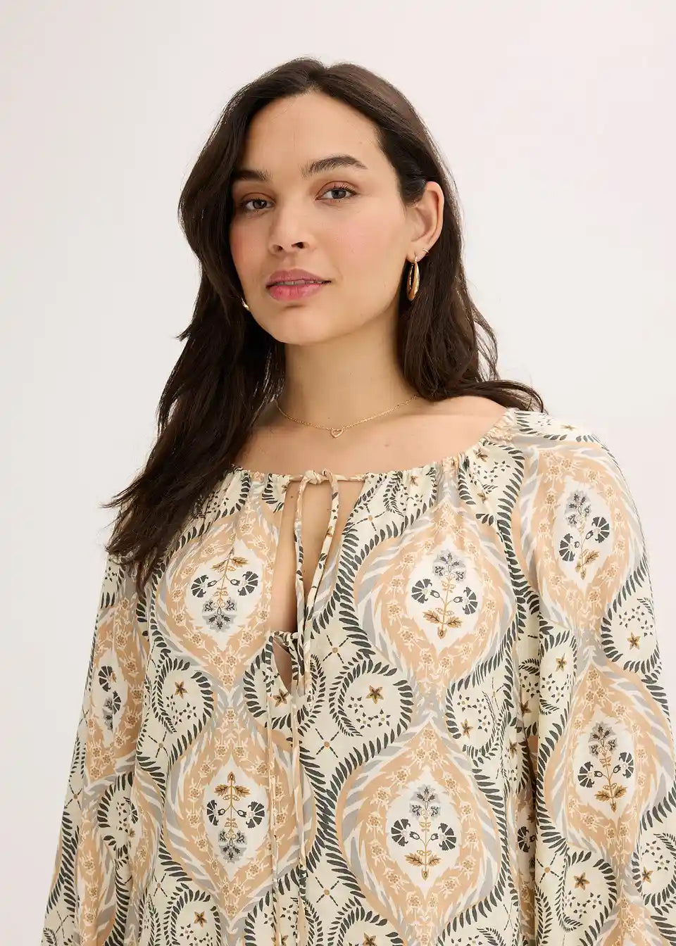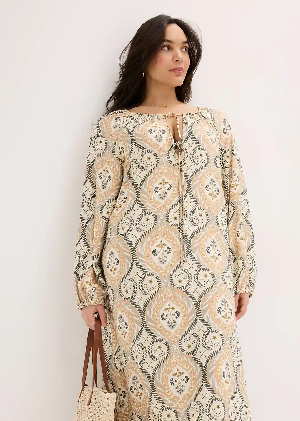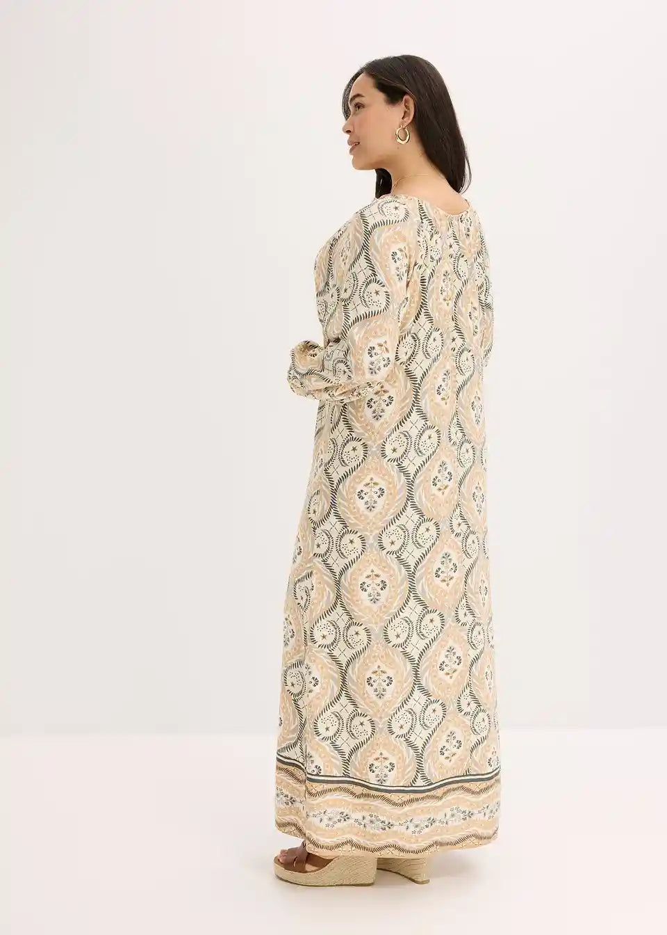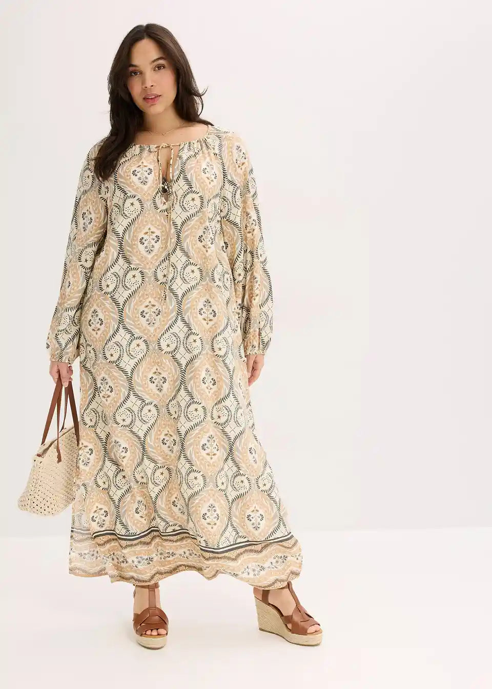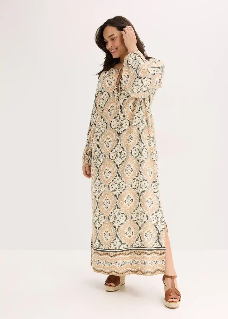 poletna kaftanska obleka v maksi dolžini iz tekoče viskoze z dvema majhnima vrvicama za vezanje spredaj pri izrezu
