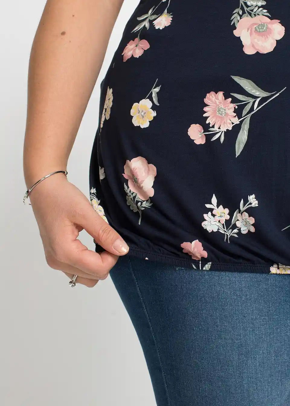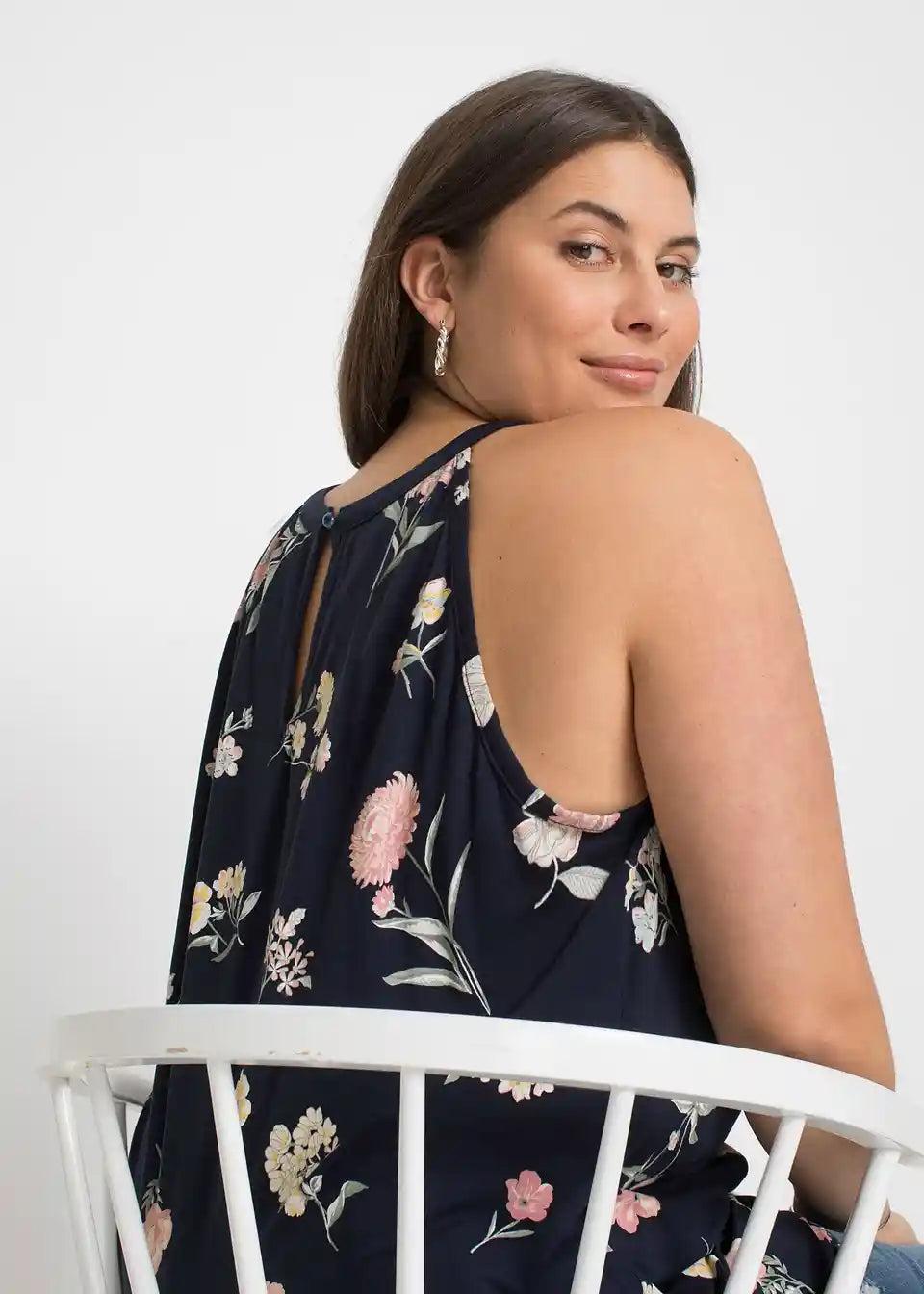 Čudovit shirt-top znamke BODYFLIRT z atraktivnim cvetličnim potiskom ob straneh in na izrezu. Rob omogoča sproščen padajoč kroj, ki se nežno prilagaja postavi. Na zadnji strani z zarezo in trakcem za zavezovanje, rahlo prosojen. Dolžina pri velikosti 36/38 je približno 64 cm.