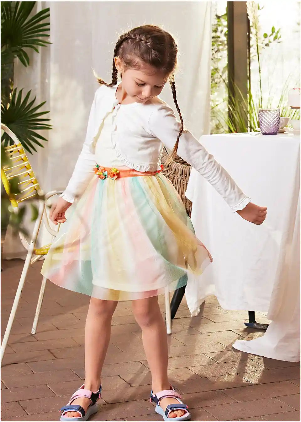 Prelepa praznična obleka za dekleta z zavezovalnim trakom na hrbtu. Čudovit barvni preliv na krilu in čipkast zgornji del naredita obleko posebno.
