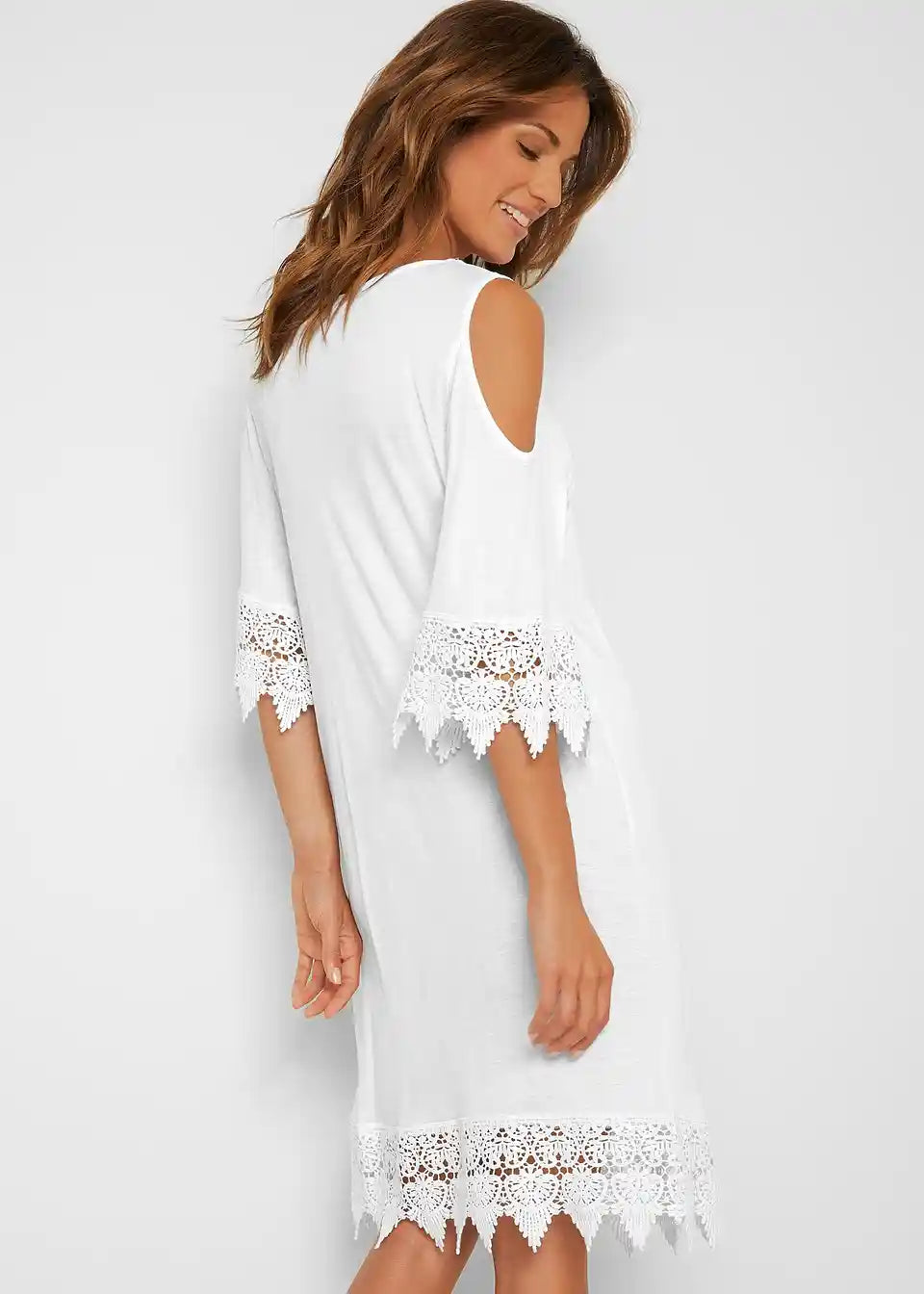 Oversized majica za plažo iz jerseya s čipkastim robom. Oprta na ramena. Rahlo prosojna.