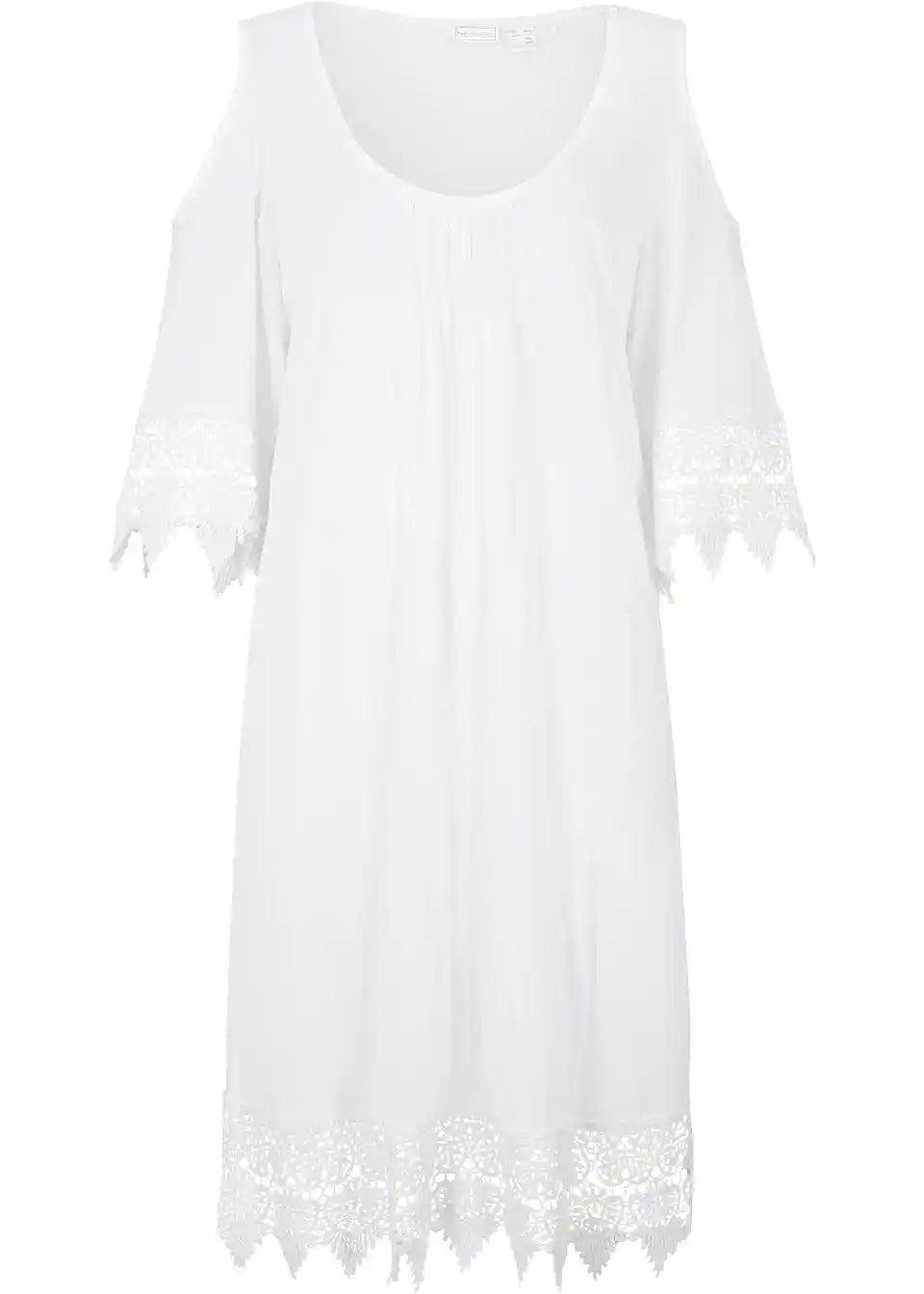 Prevelika majica za plažo iz jerseya s čipkastim robom. Odkrita ramena. Rahlo prosojna.