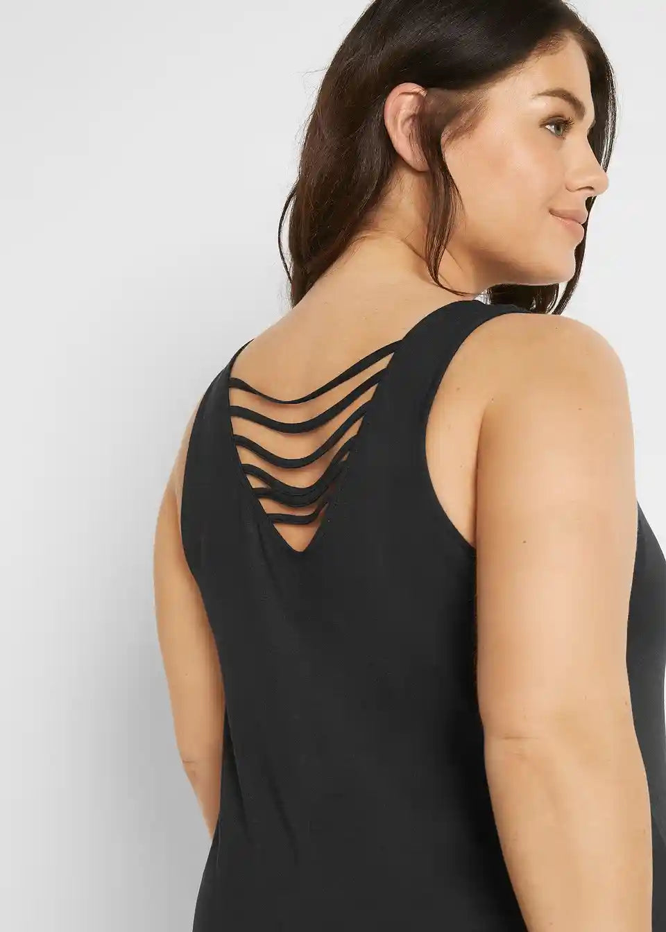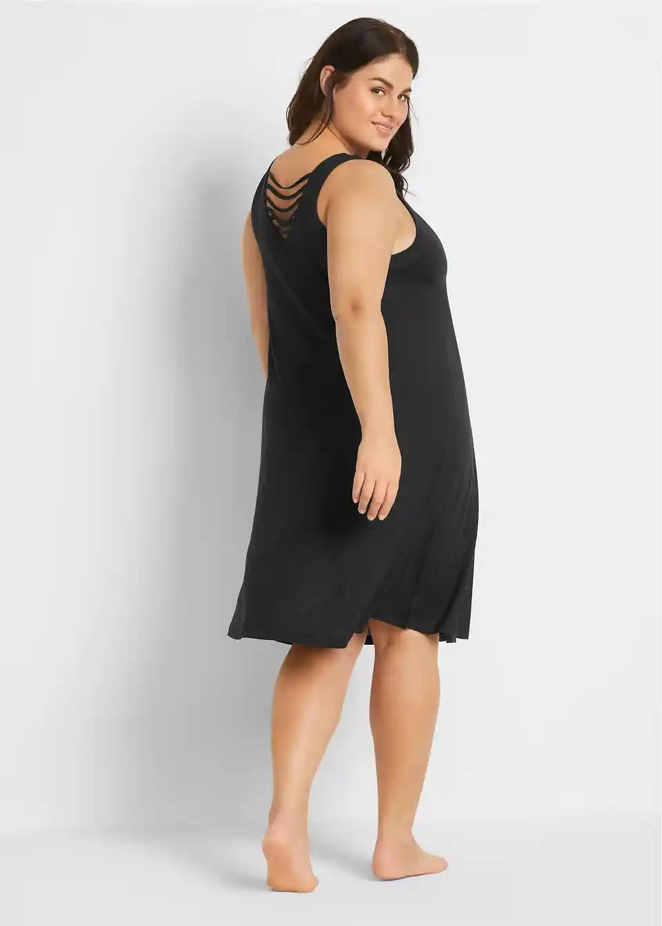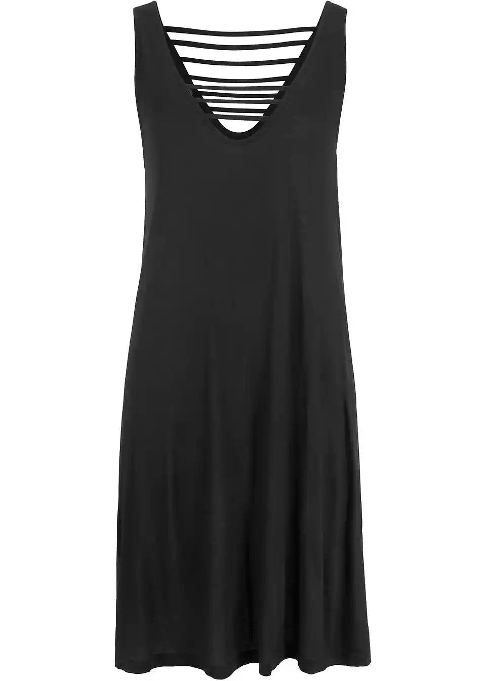 Brezrokavna plažna obleka z V-izrezom spredaj in zadaj.
