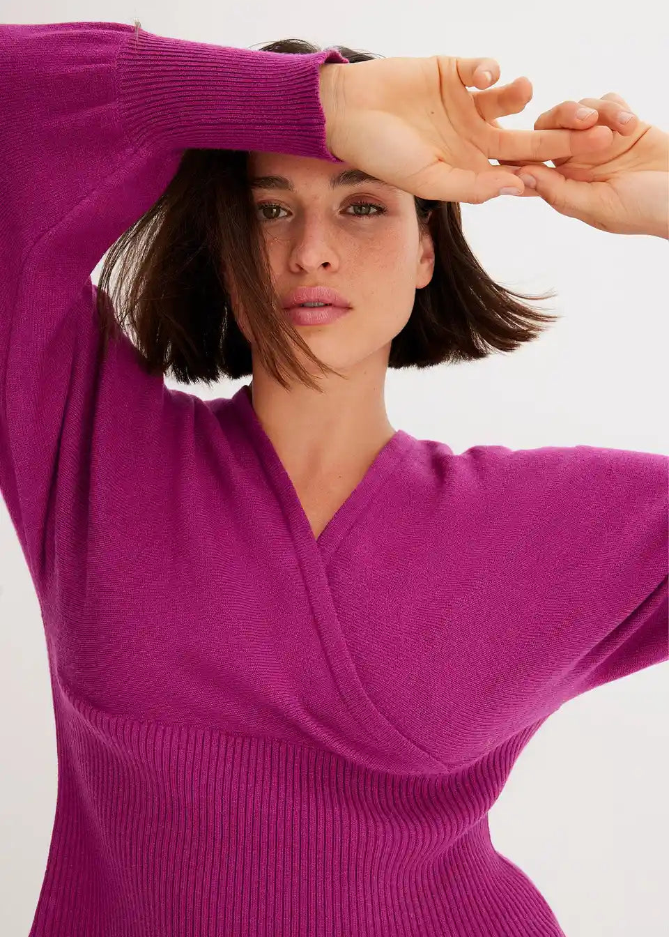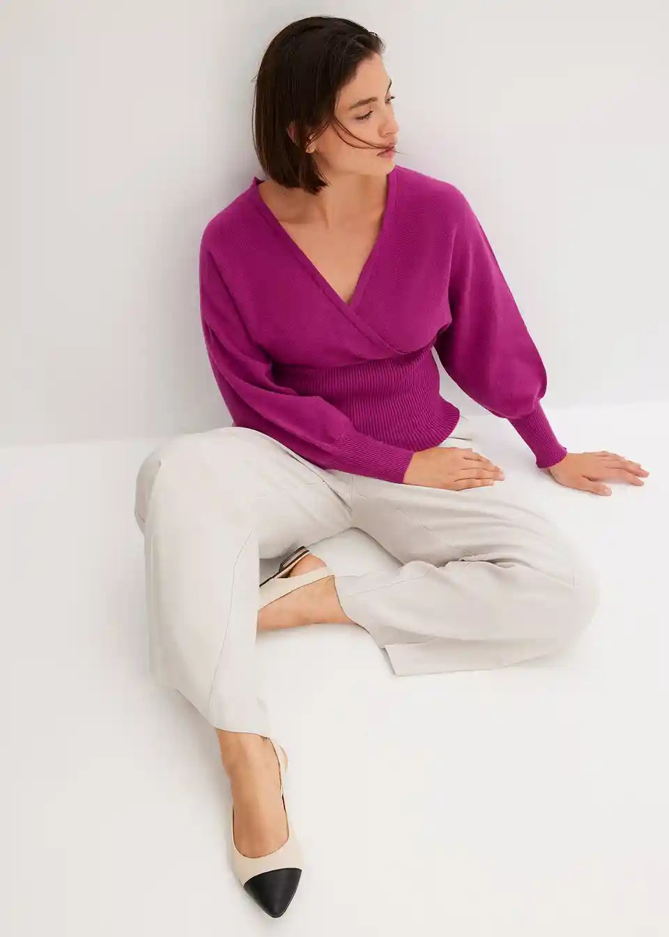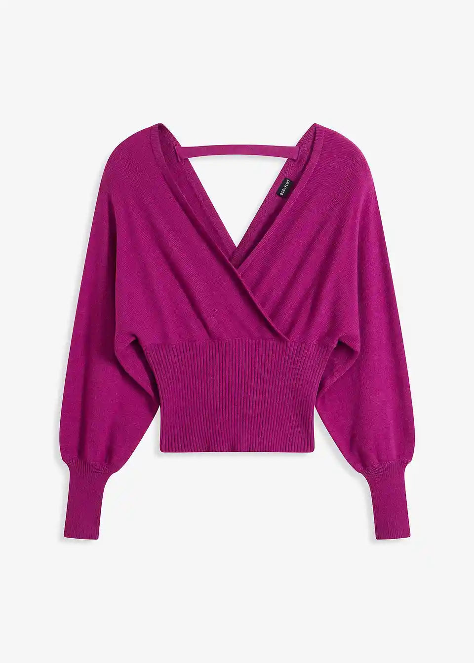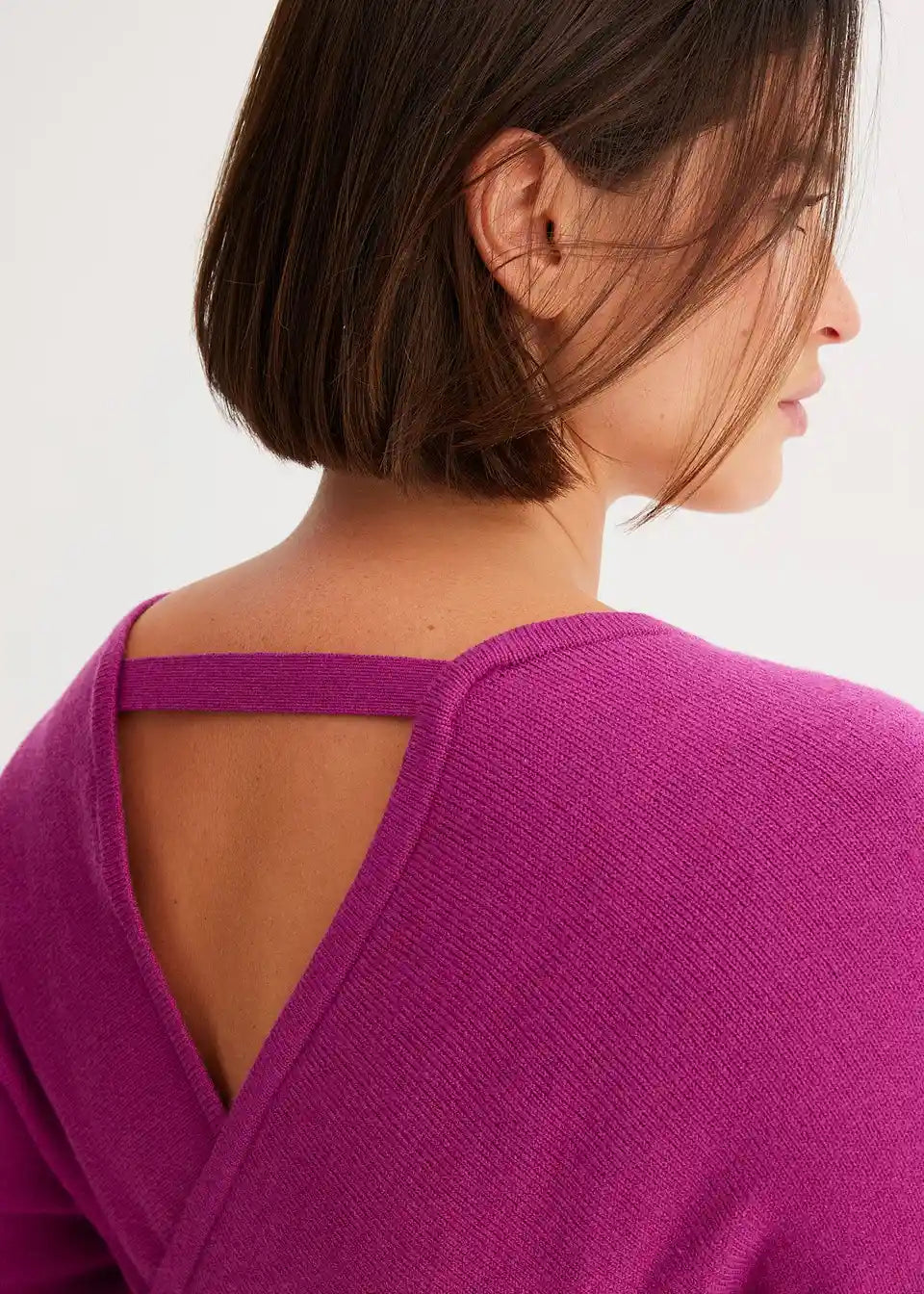 ženstven pulover z netopirskimi rokavi in izrezom na hrbtu