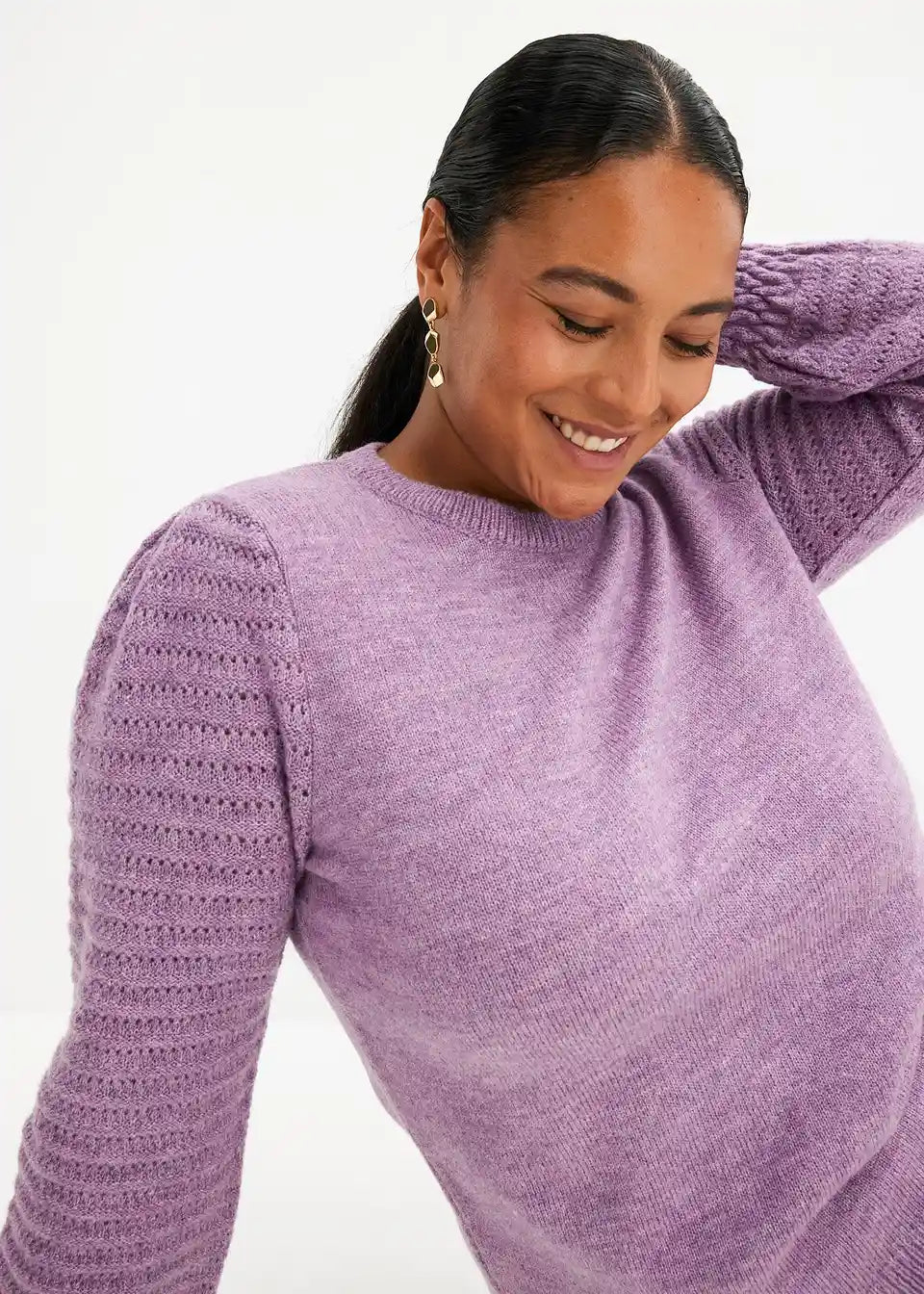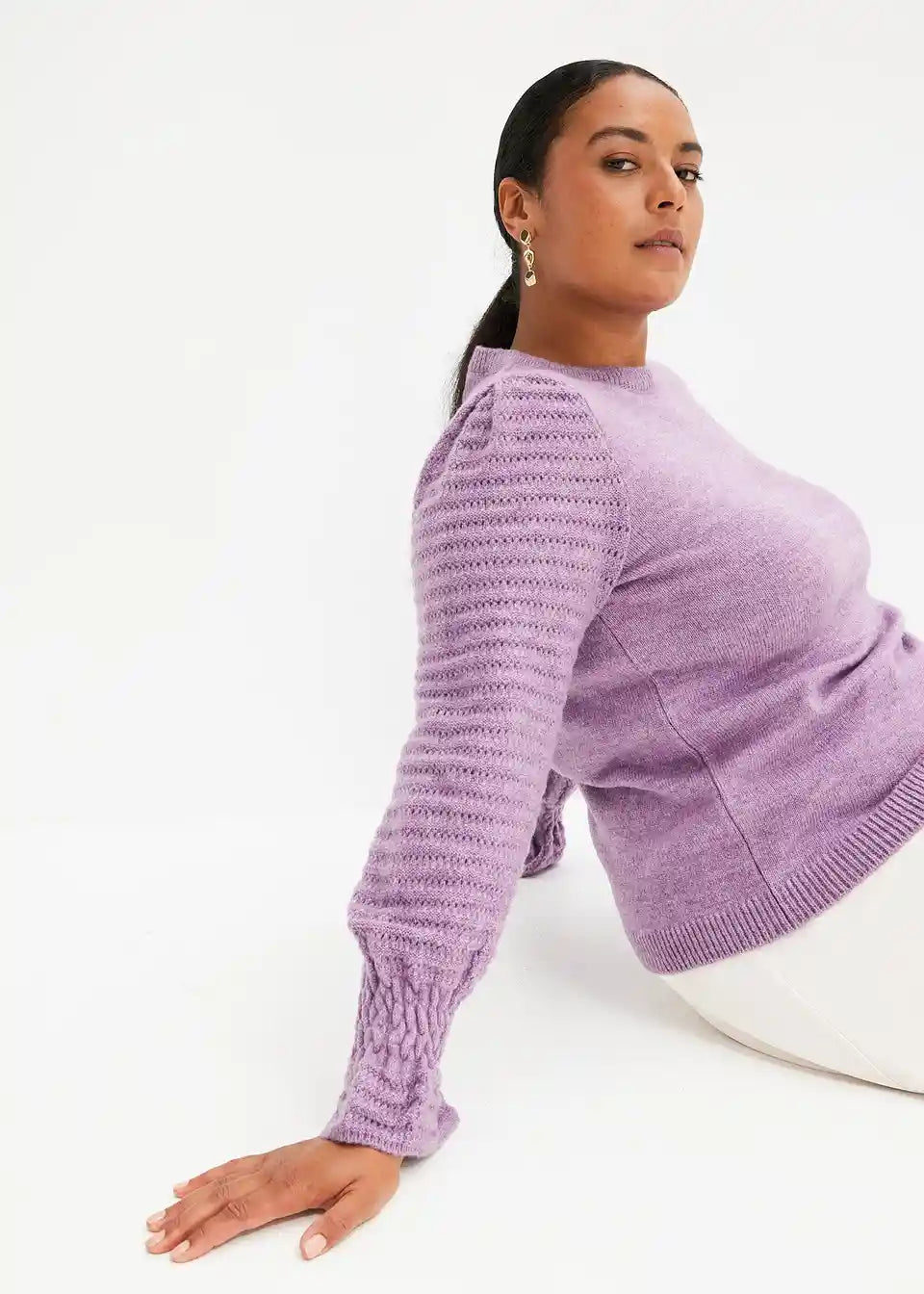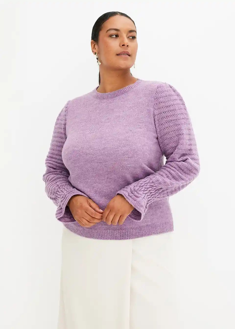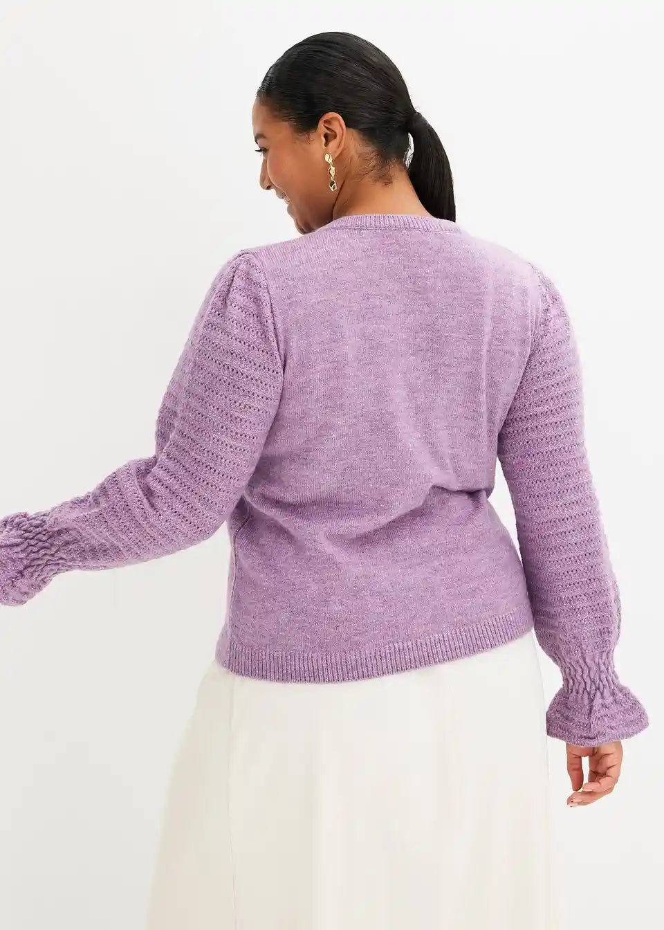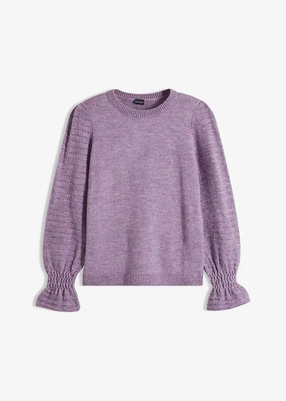 ženski pulover z volančki na zaključkih rokavov
