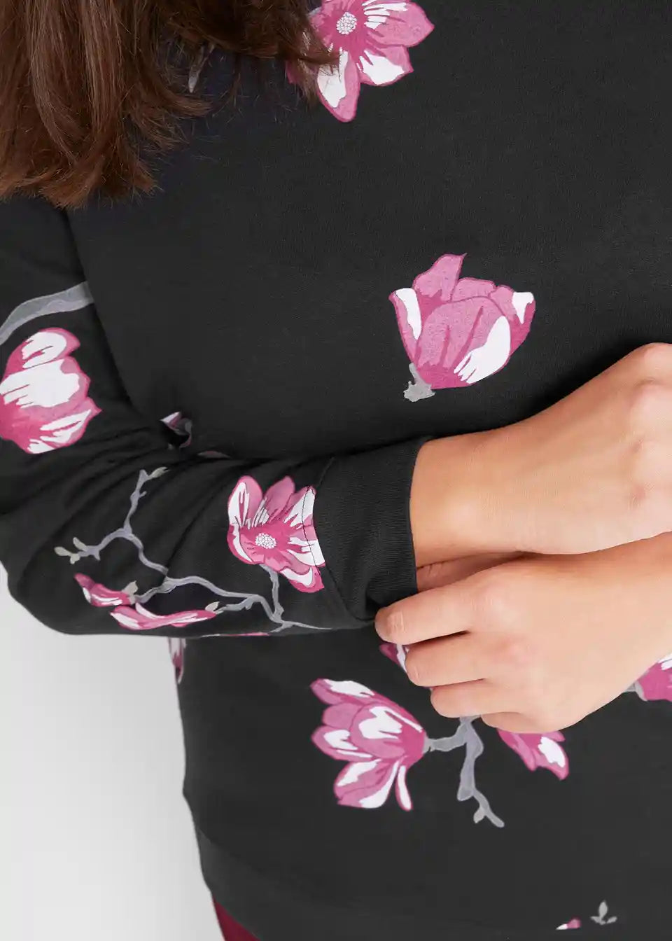 Udoben pulover s cvetličnim potiskom in okroglim izrezom