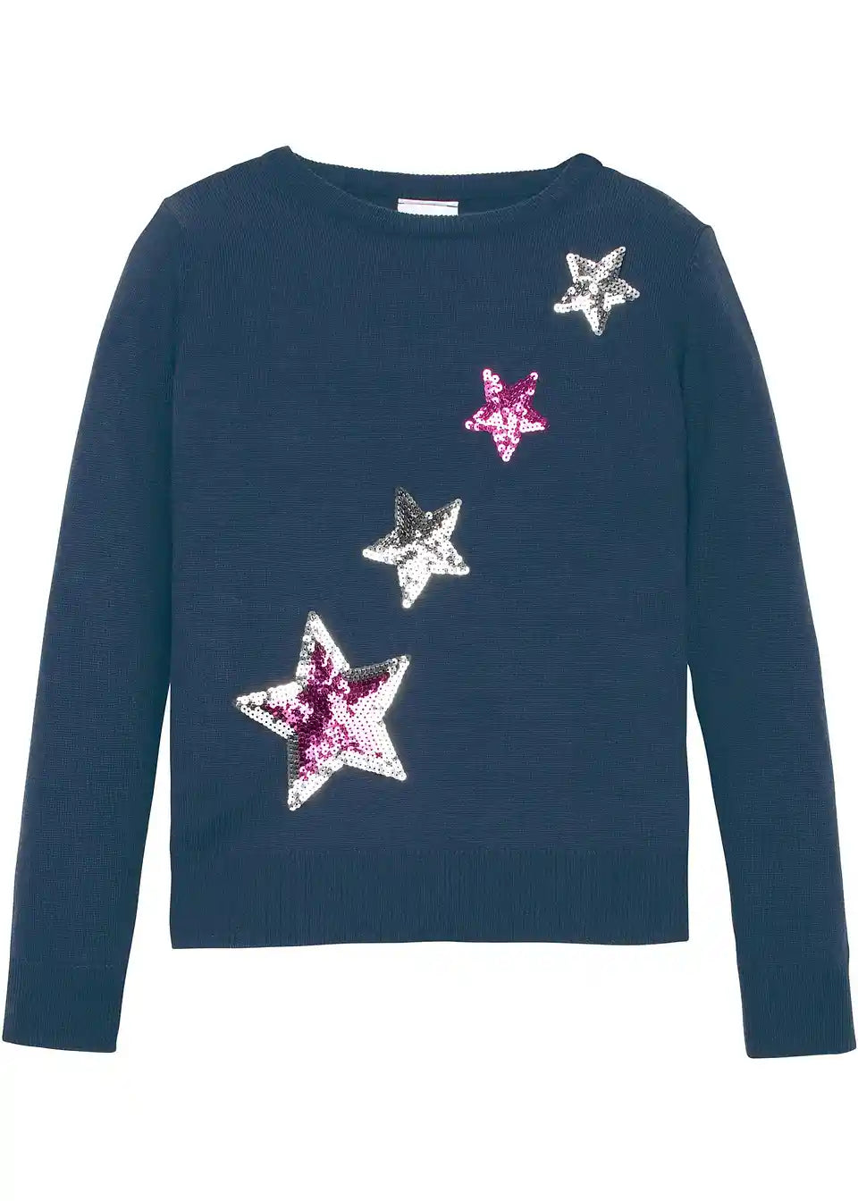 S tem priljubljenim pletenim puloverjem s pailletten so dekleta modno oblečena. Dolgrokavni pulover navdušuje z velikimi aplikacijami zvezd iz barvnih paillett na sprednji strani. Izdelan je z nežnimi patentnimi robovi in ima ohlapen kroj. Lep okrogel pulover blagovne znamke bpc je primeren za številne priložnosti in se odlično kombinira s kavbojkami ali krili.