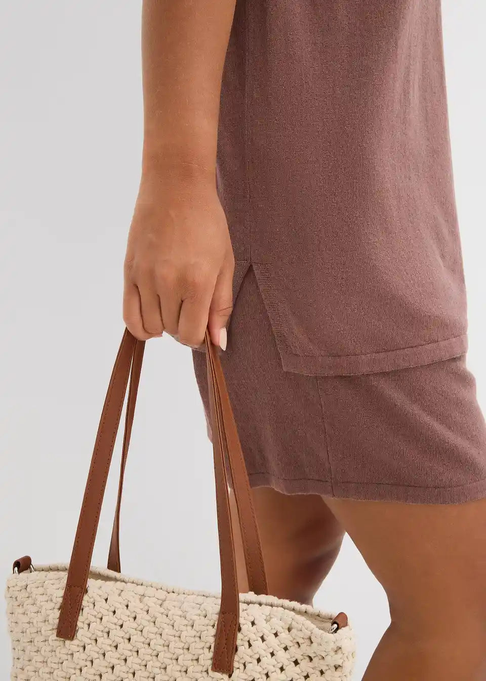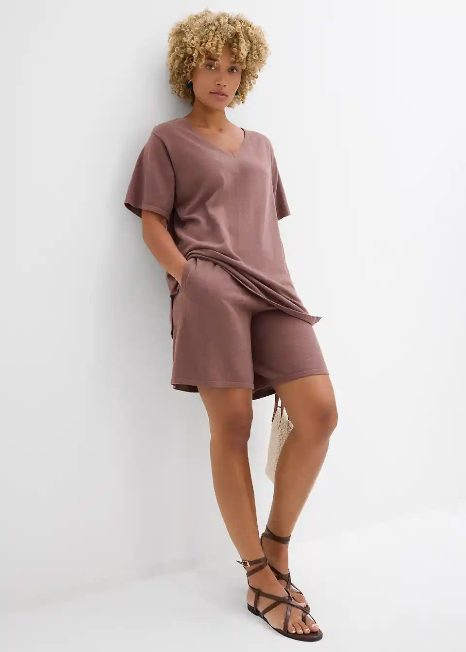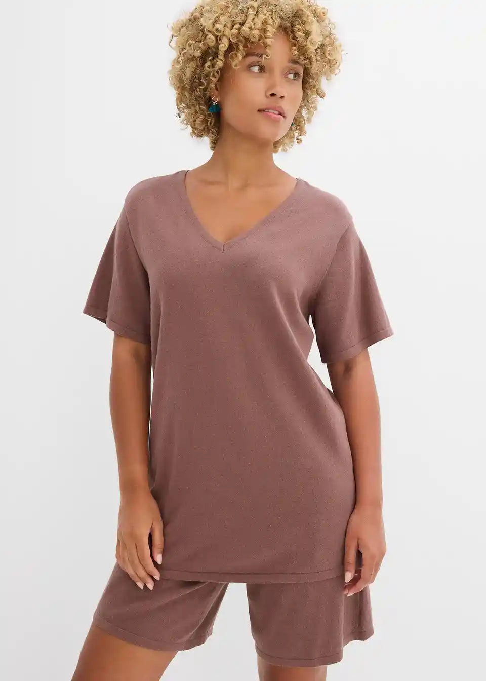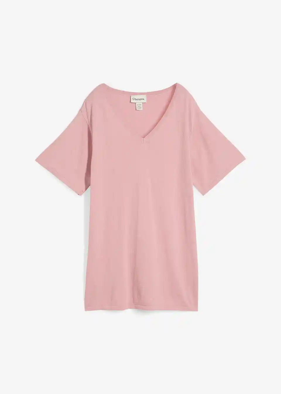 Feinstrick majica iz mešanice bombaža. Kratki rokavi v širšem kroju, V-izrez in stranski razporki.