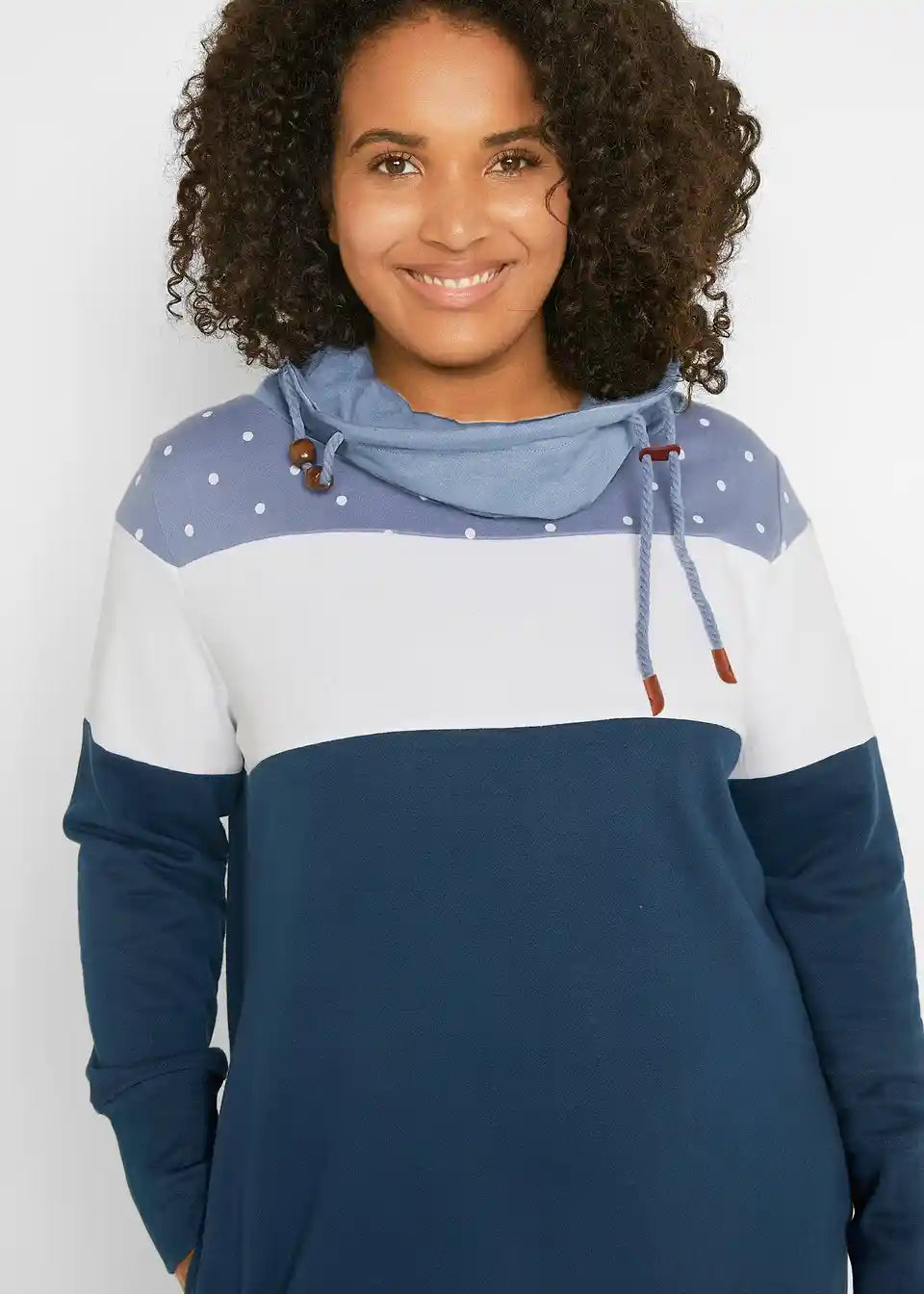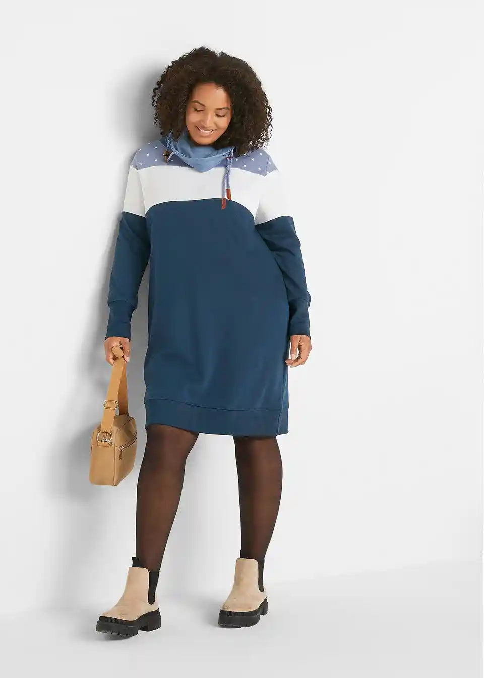 Udobna pulover obleka v večbarvni izvedbi z velikim ovratnikom