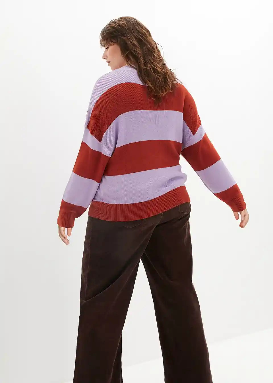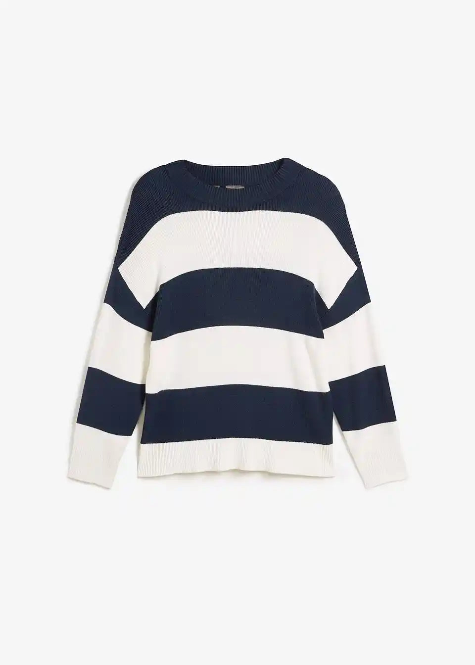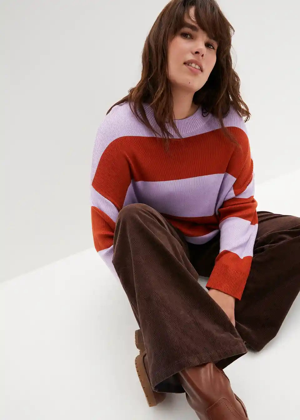 Fino pleten pulover s kontrastnimi črtami in okroglim izrezom
