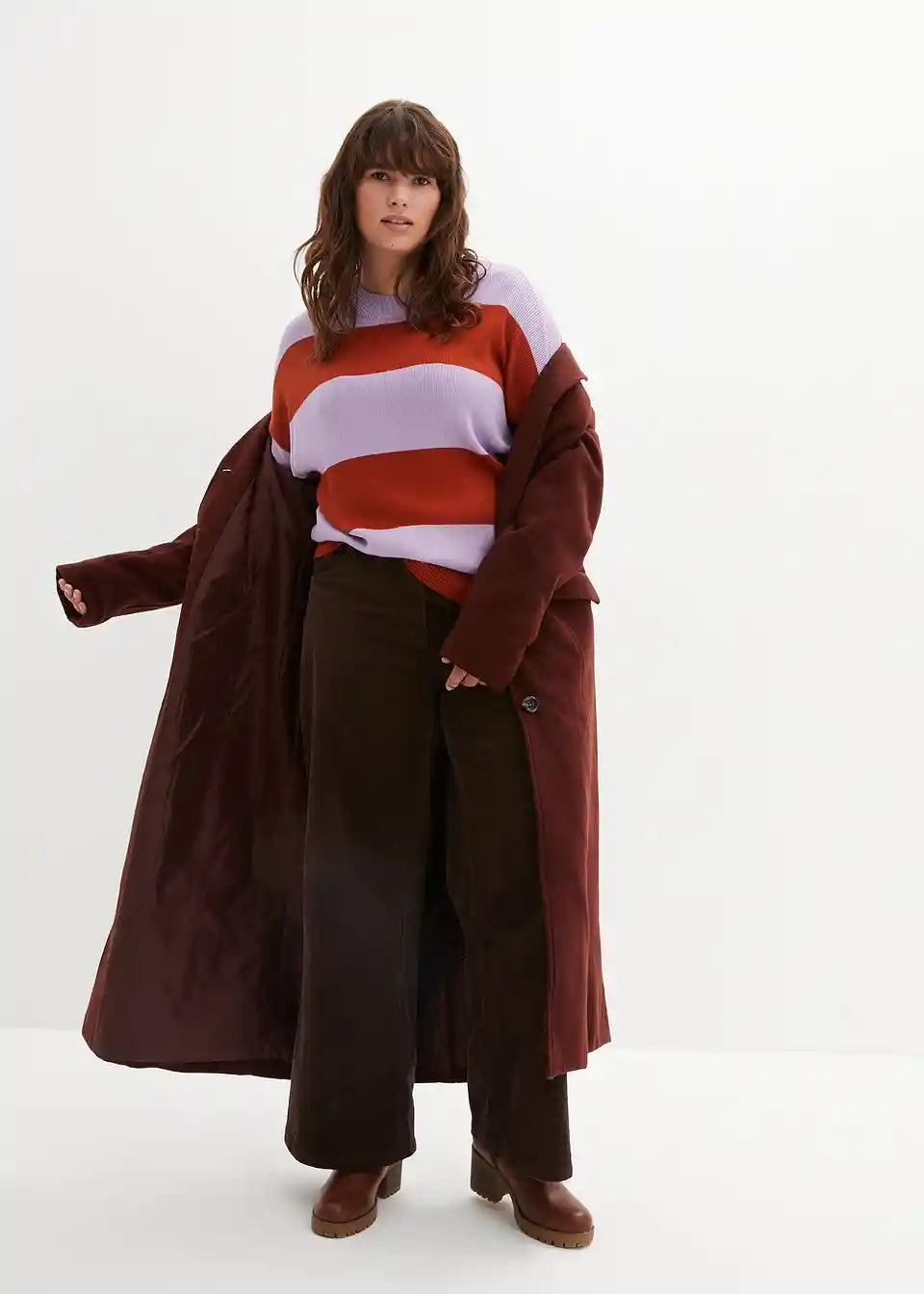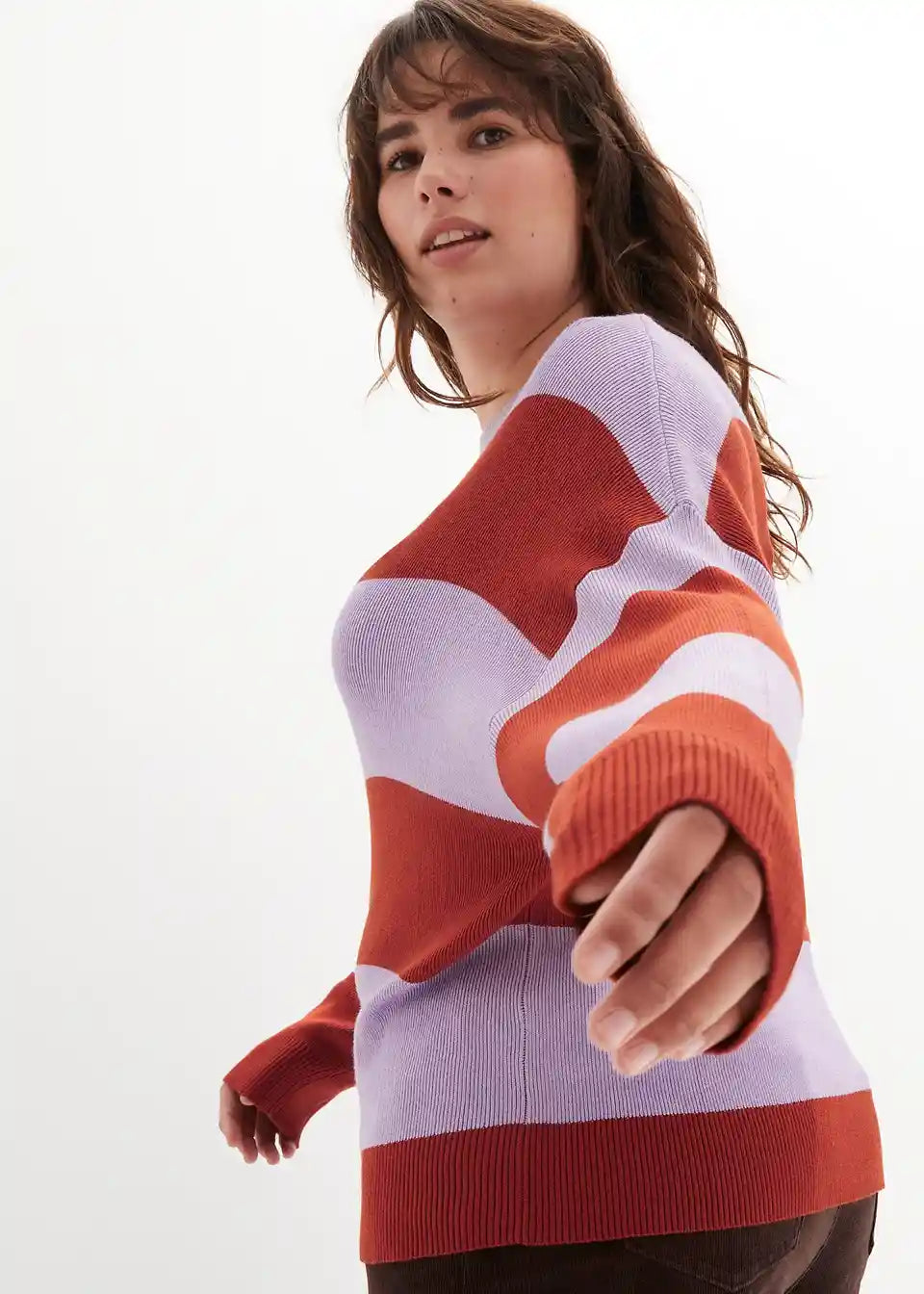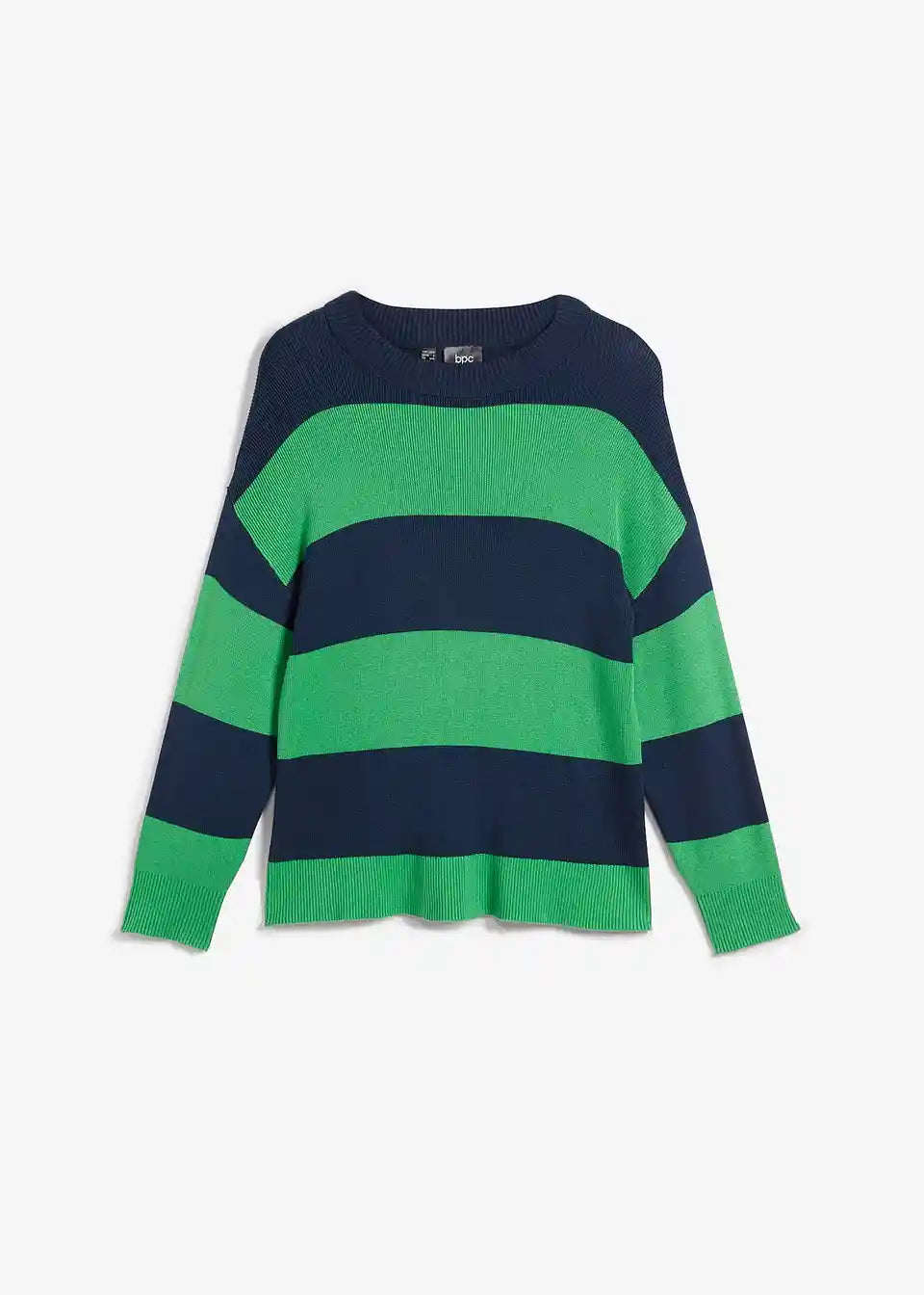 Fino pleten pulover s kontrastnimi črtami in okroglim izrezom
