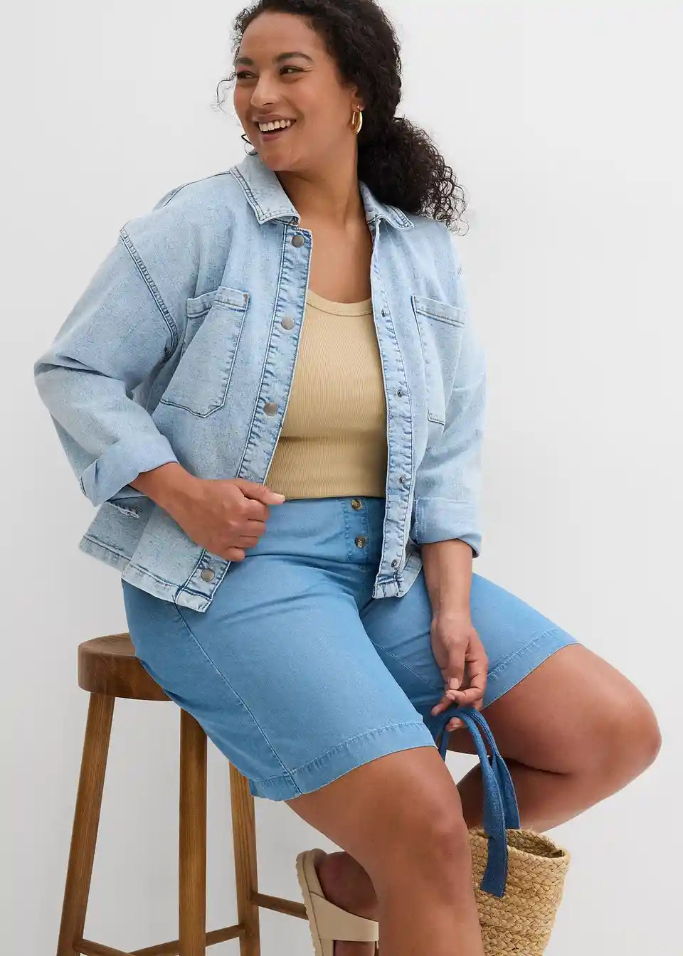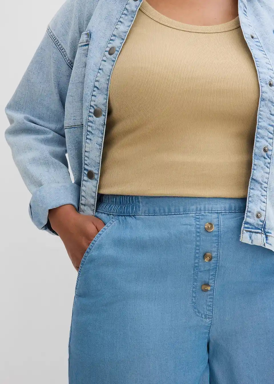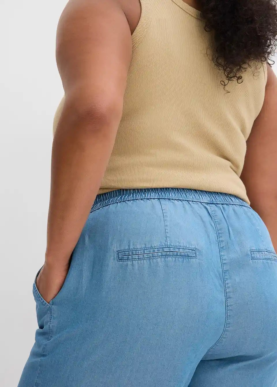 Posebnosti kroja:za veliko udobja pri nošenju, z elastičnimi všitki za večjo svobodo pri gibanju, za zakriti trebušček, zadnjico in boke ter udobje na stegnih