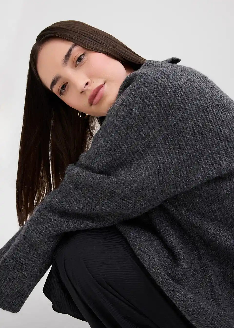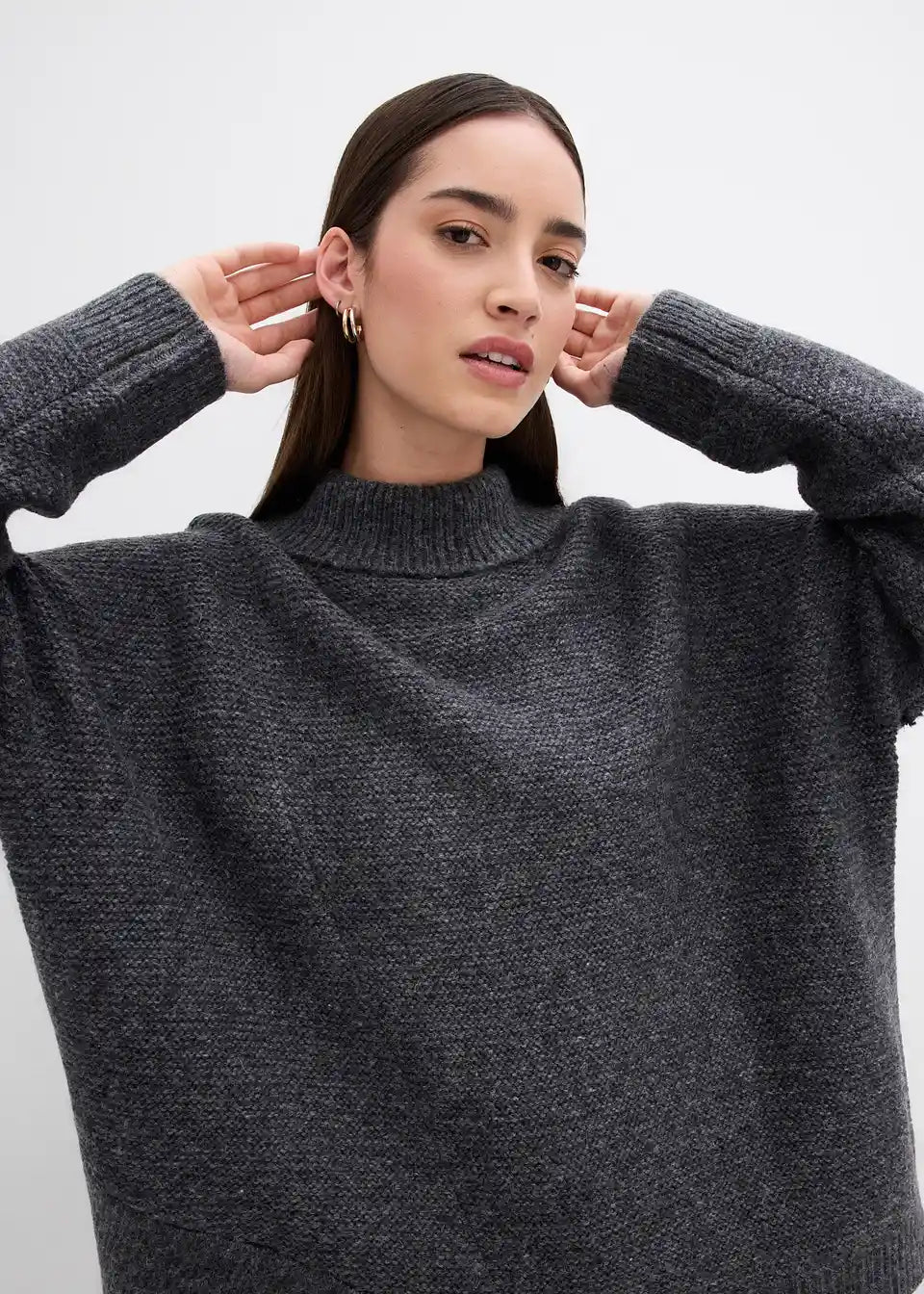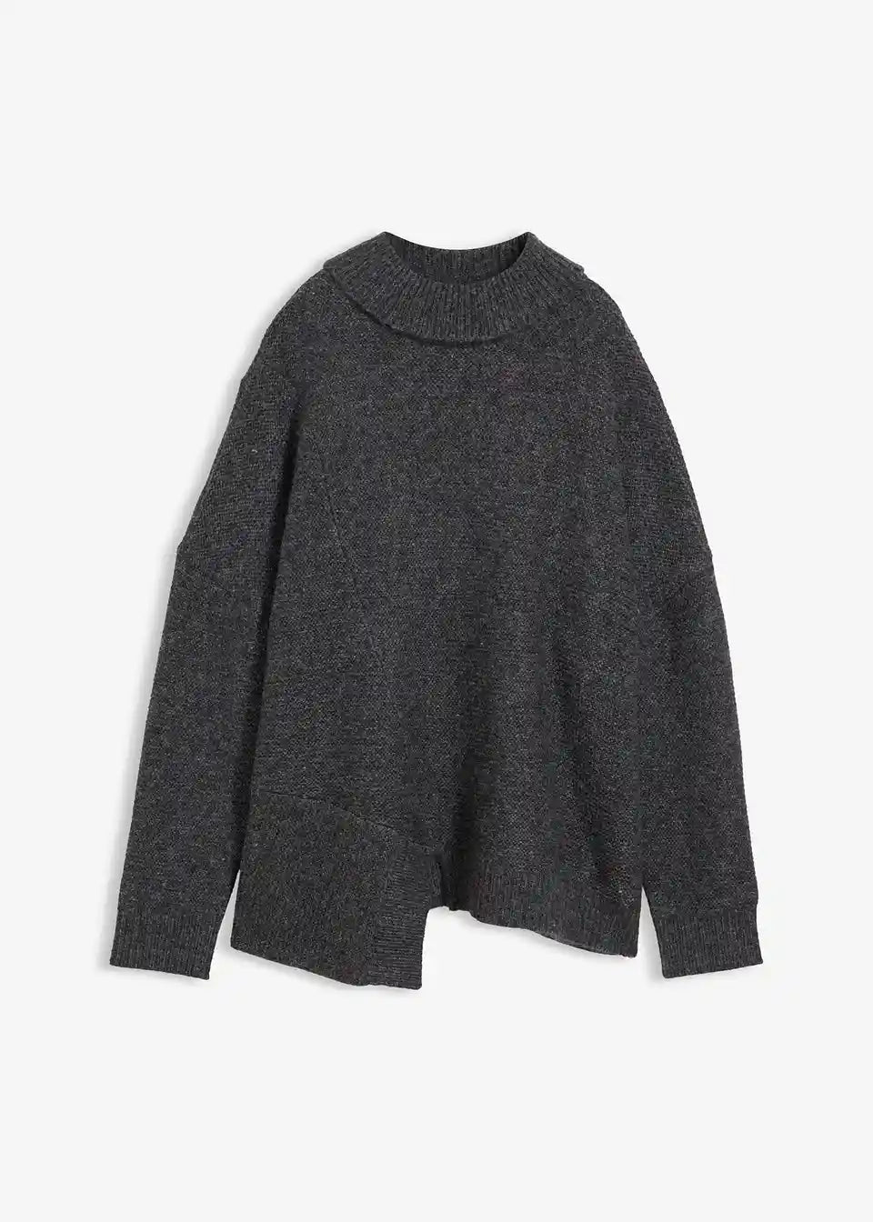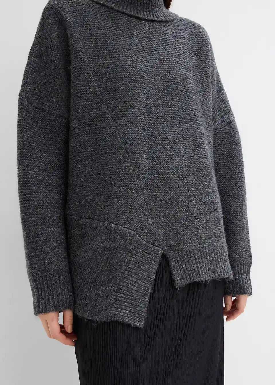 Pulover z asimetrično potekajočim spodnjim robom in deležem volne
