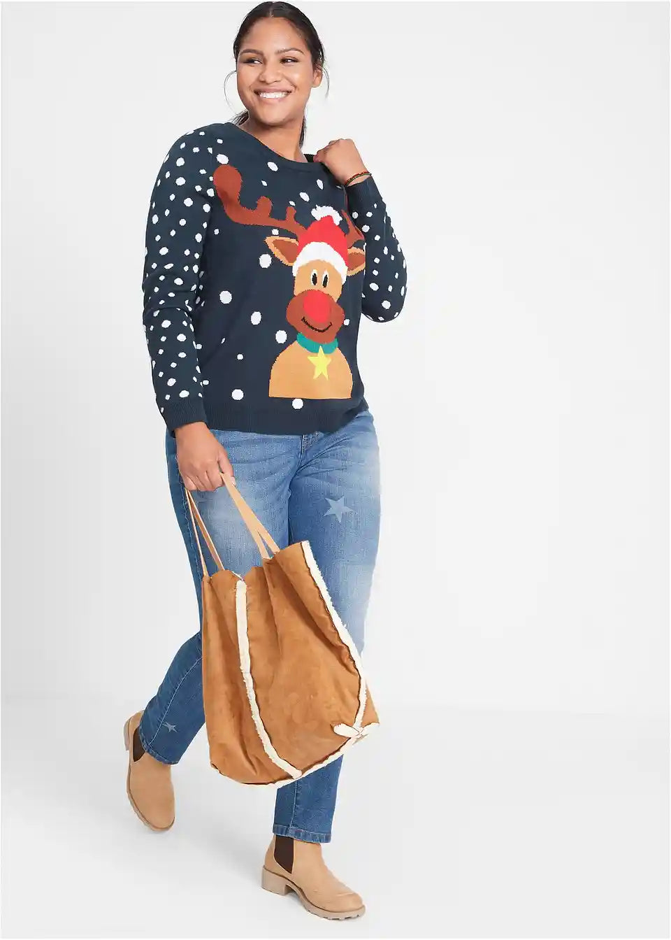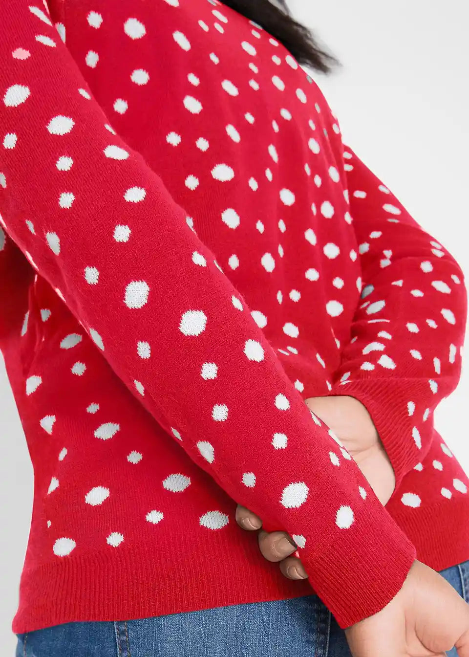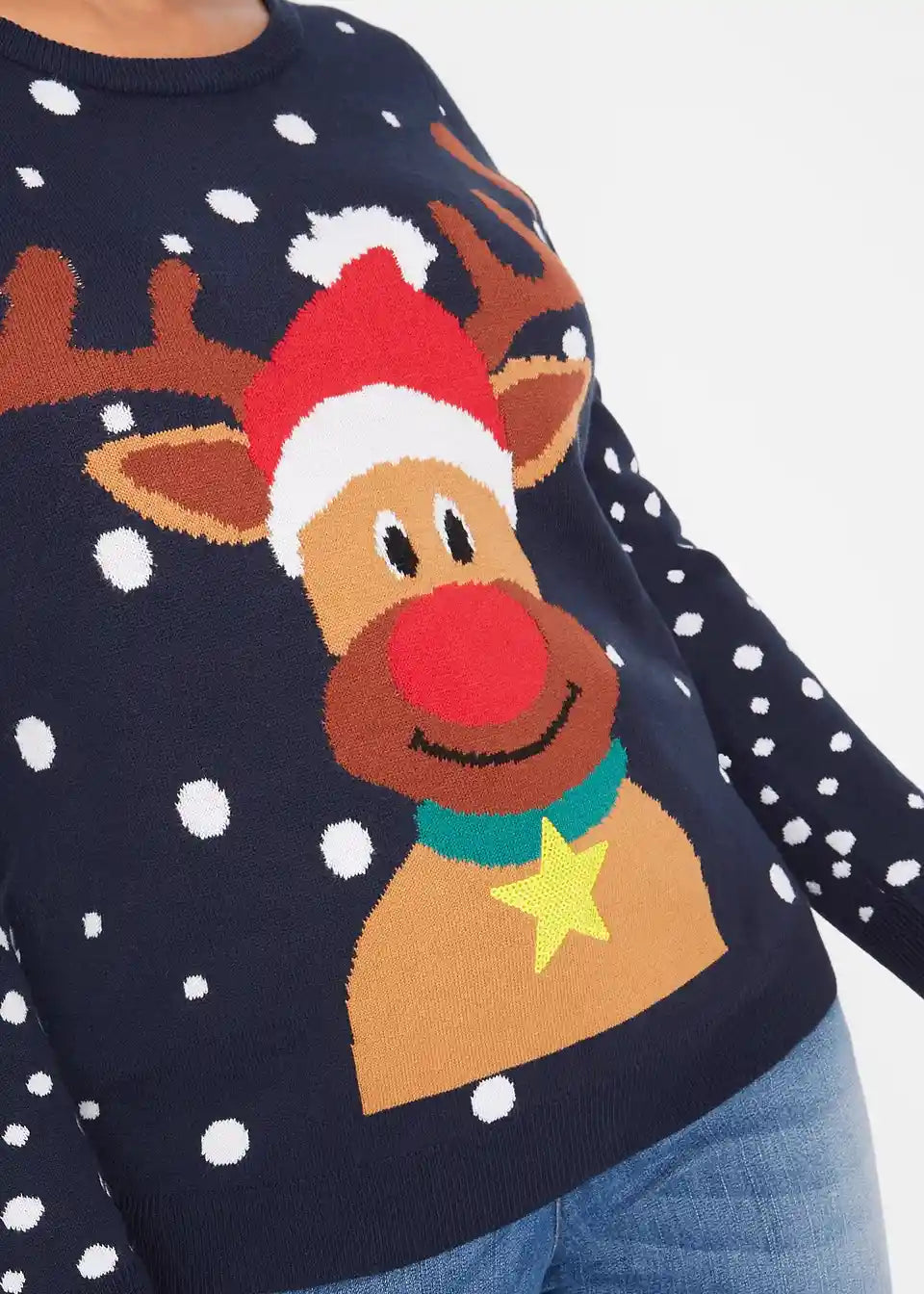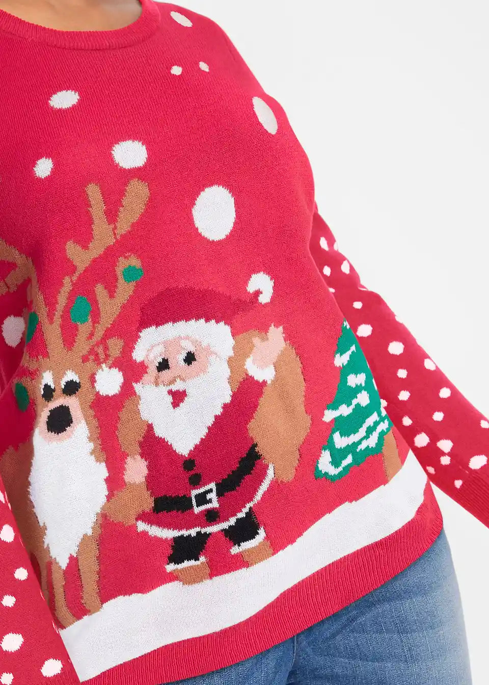 Pleten pulover z božičnim motivom in okroglim izrezom