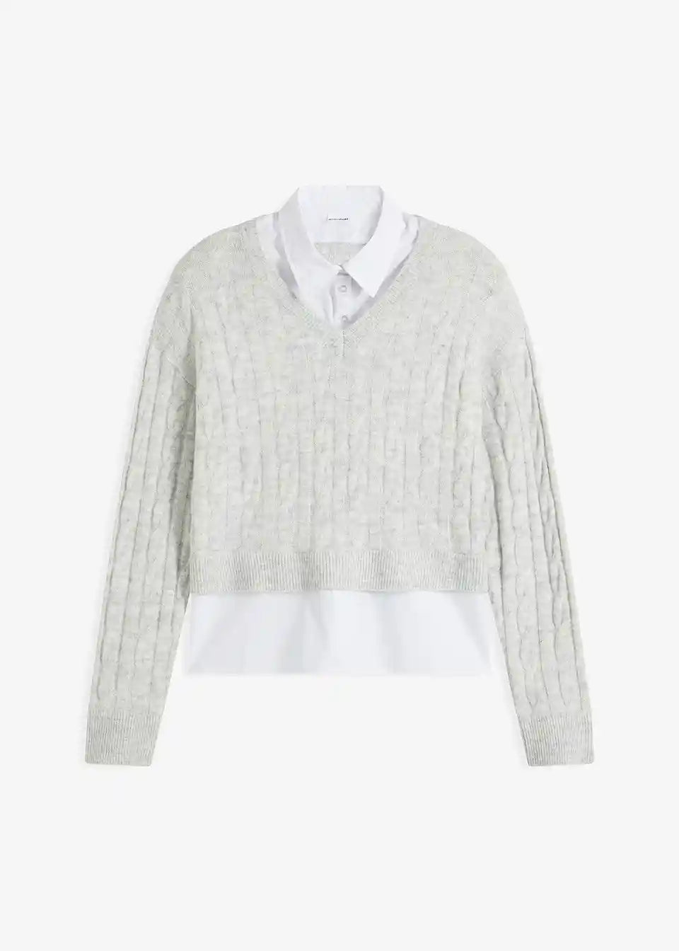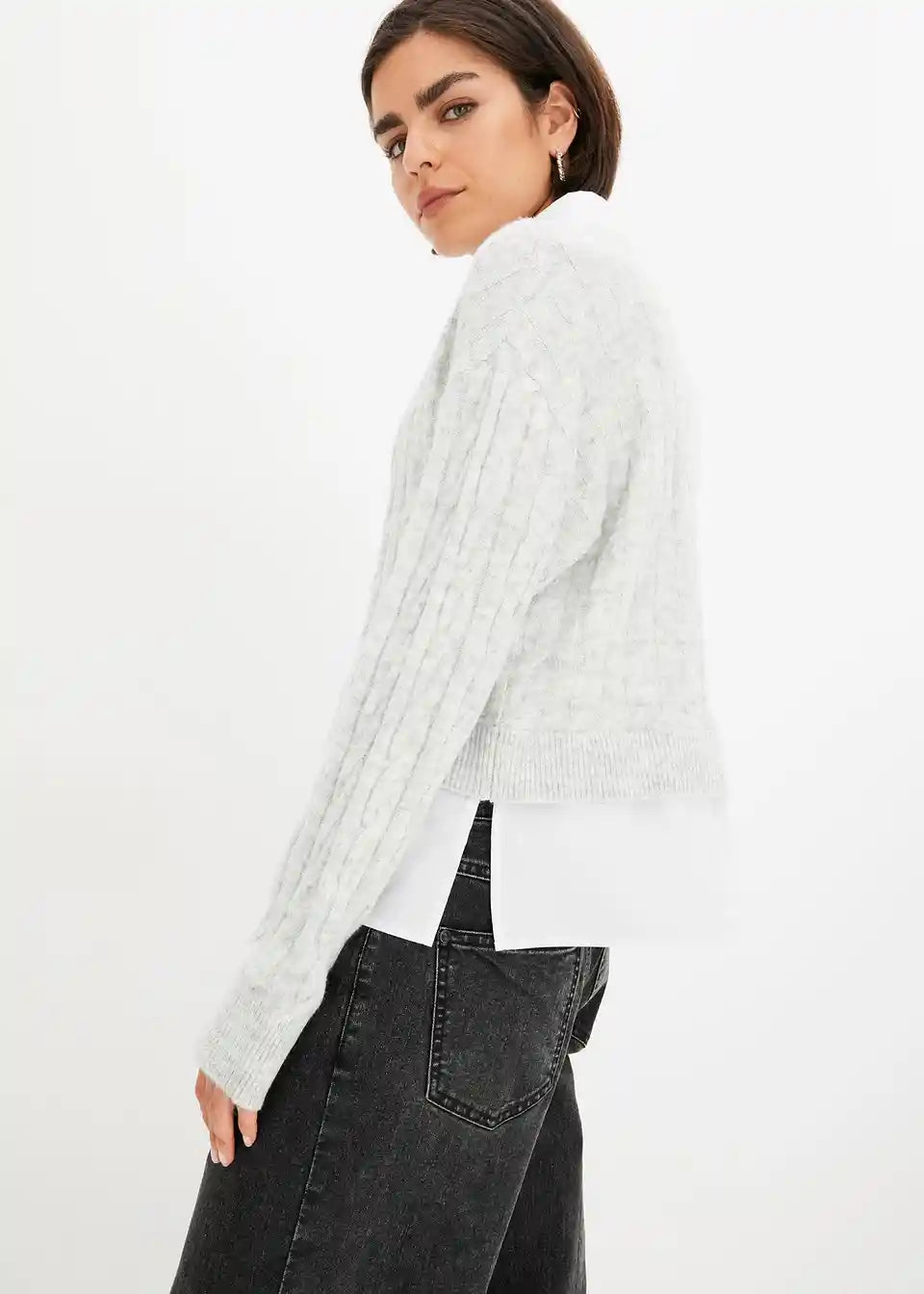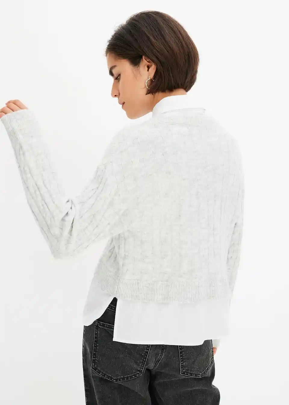ženstven pulover z bluznim vložkom in vzorcem pletenic