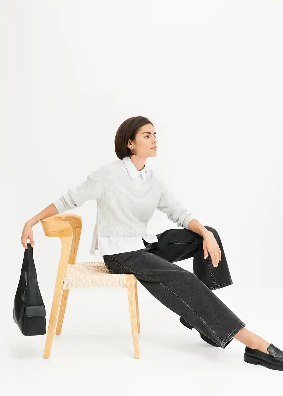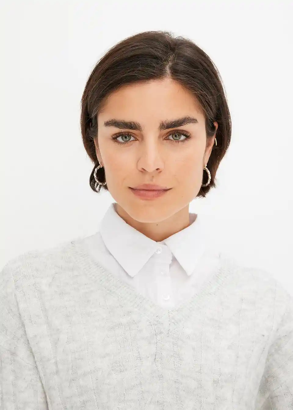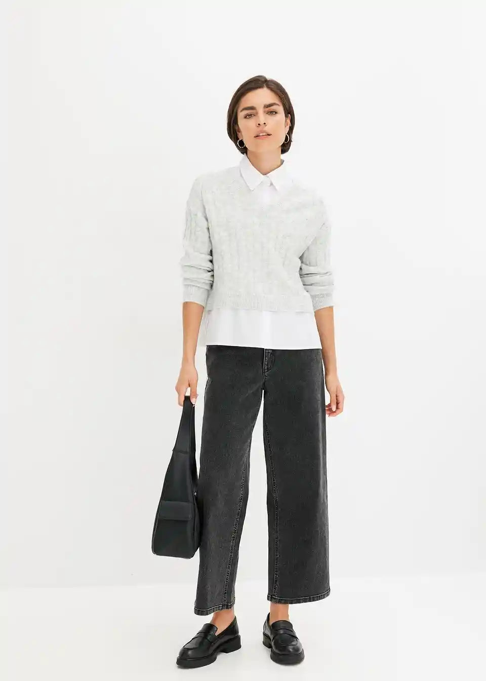 ženstven pulover z bluznim vložkom in vzorcem pletenic