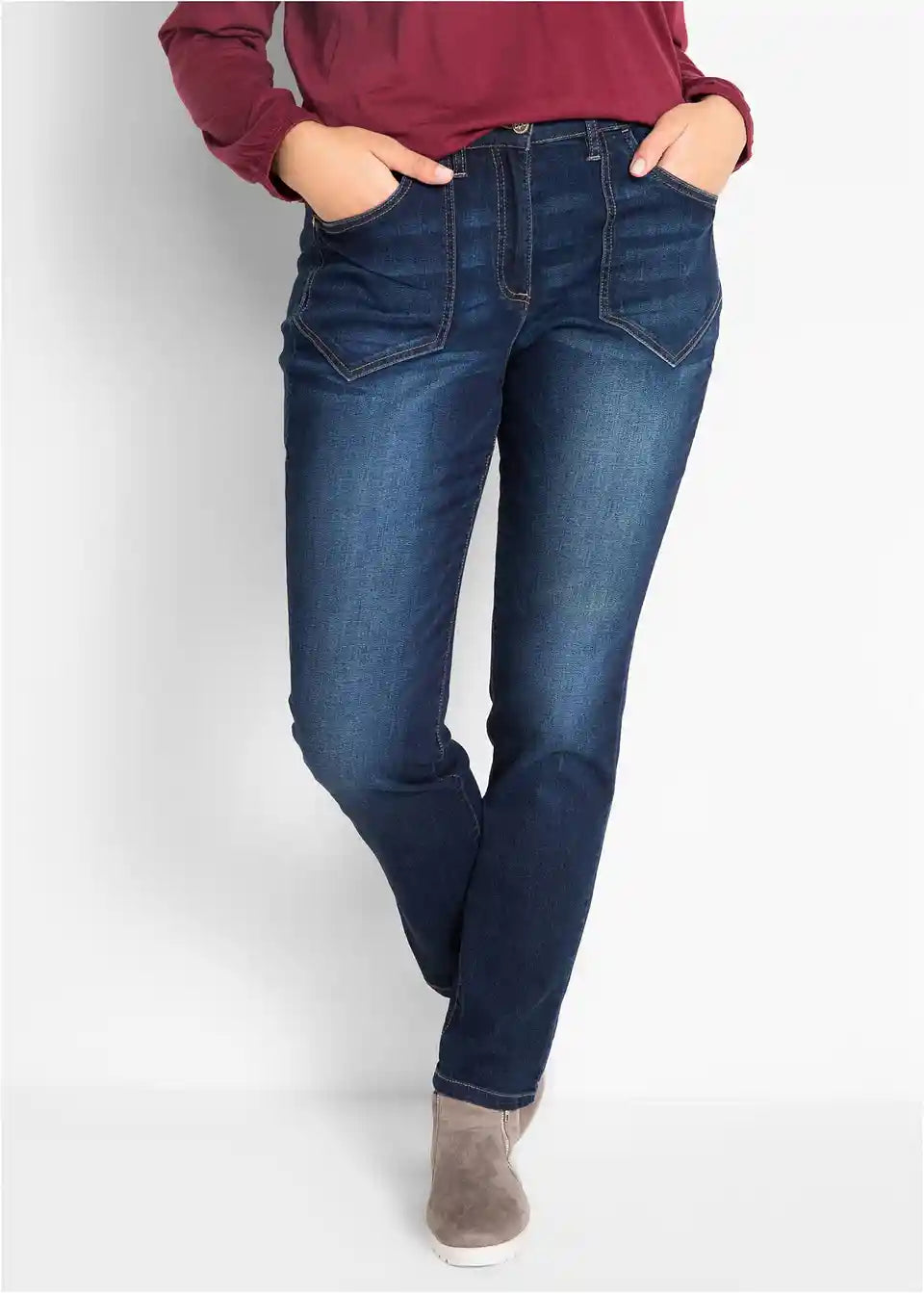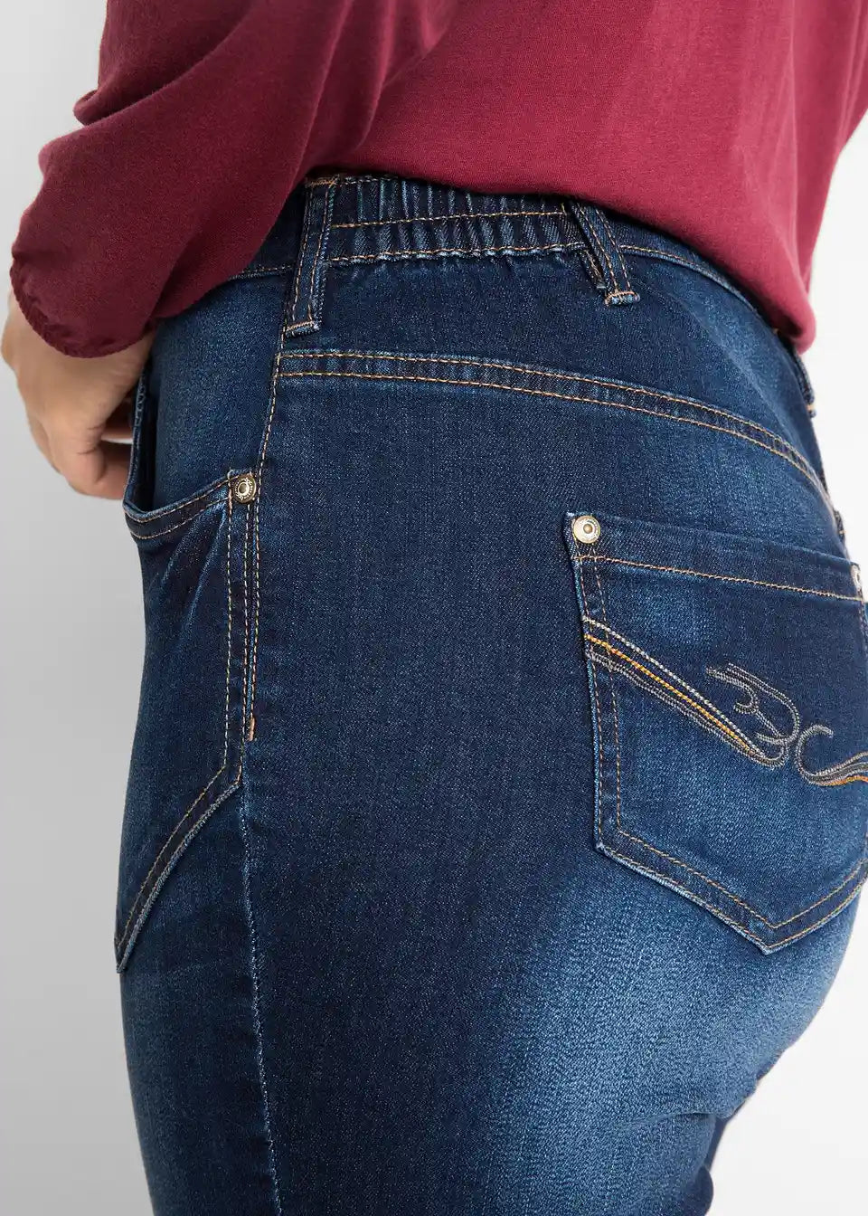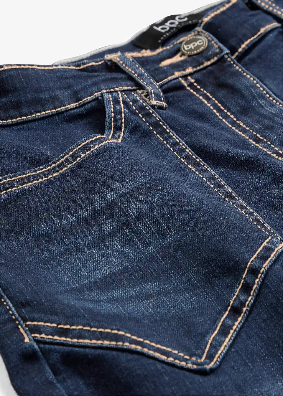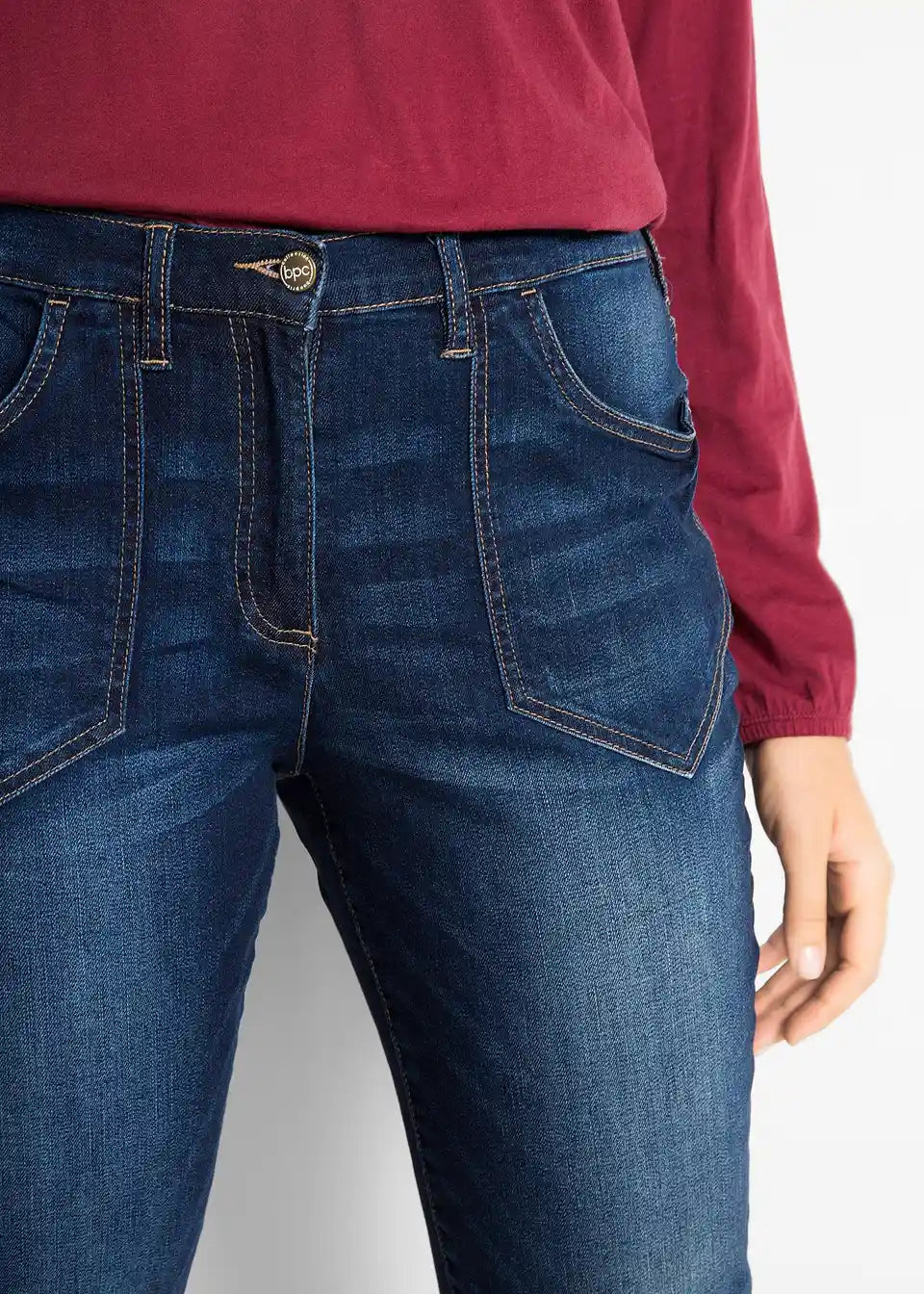Te sproščene raztegljive kavbojke z visokim pasom navdušuje kombinacija ohlapnega kroja in finega bombažnega raztegljivega materiala. Stranski vstavki elastičnega materiala v pasu zagotavljajo udobje. Udobno krojeni visok pas subtilno oblikuje in prispeva k izjemnemu udobju pri nošenju. Za manjše poudarke je pri kavbojkah bpc mogoče enostavno zavihati robove.