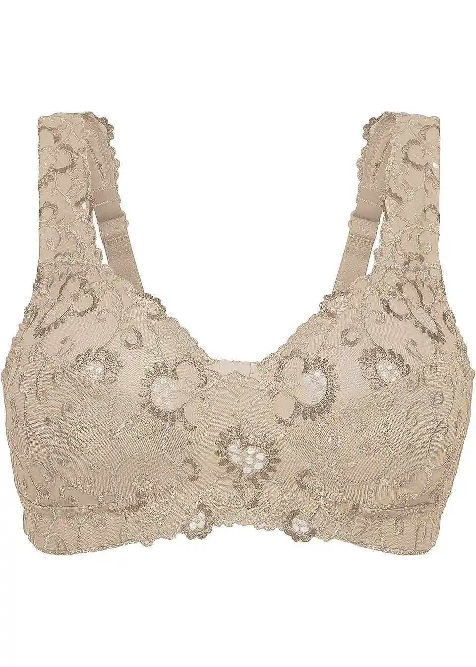 Klasično-eleganten, a predvsem udoben – tako se predstavlja ta prefinjen razbremenilni nedrček z okrasno pentljo na sredini. Dekorativno zaviti vzorci kot vezenina krasijo sprednji del in mu dajejo čudovit ženski značaj. Krojen kroj z oblikovalnimi šivi ima prijetno razbremenilno funkcijo. Podložene naramnice in zadnje zapenjanje so pri večjih velikostih širše za optimalno izkušnjo nošenja. Ta nedrček brez kosti združuje vse lastnosti, ki jih mora imeti ljubljen kos spodnjega perila!