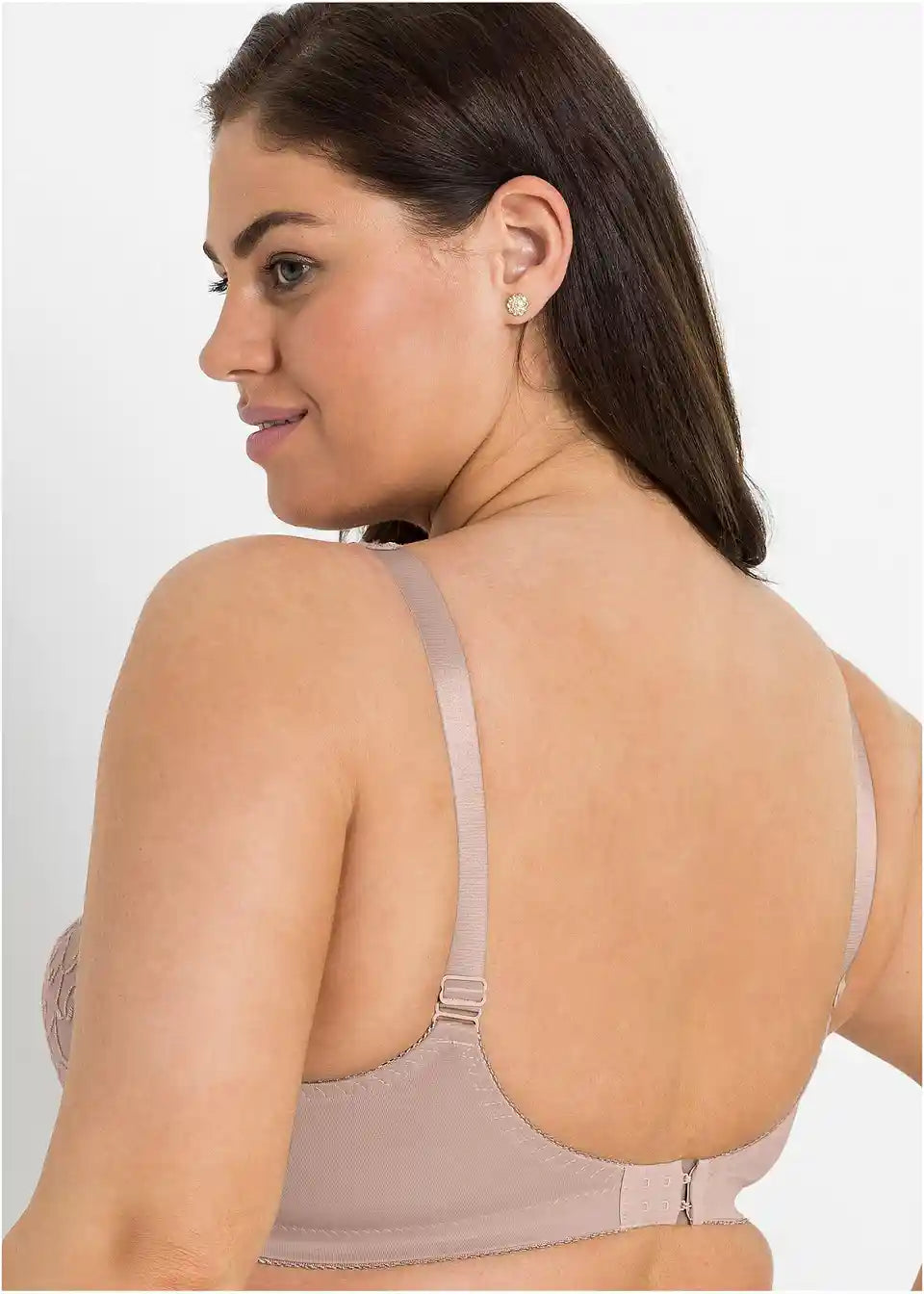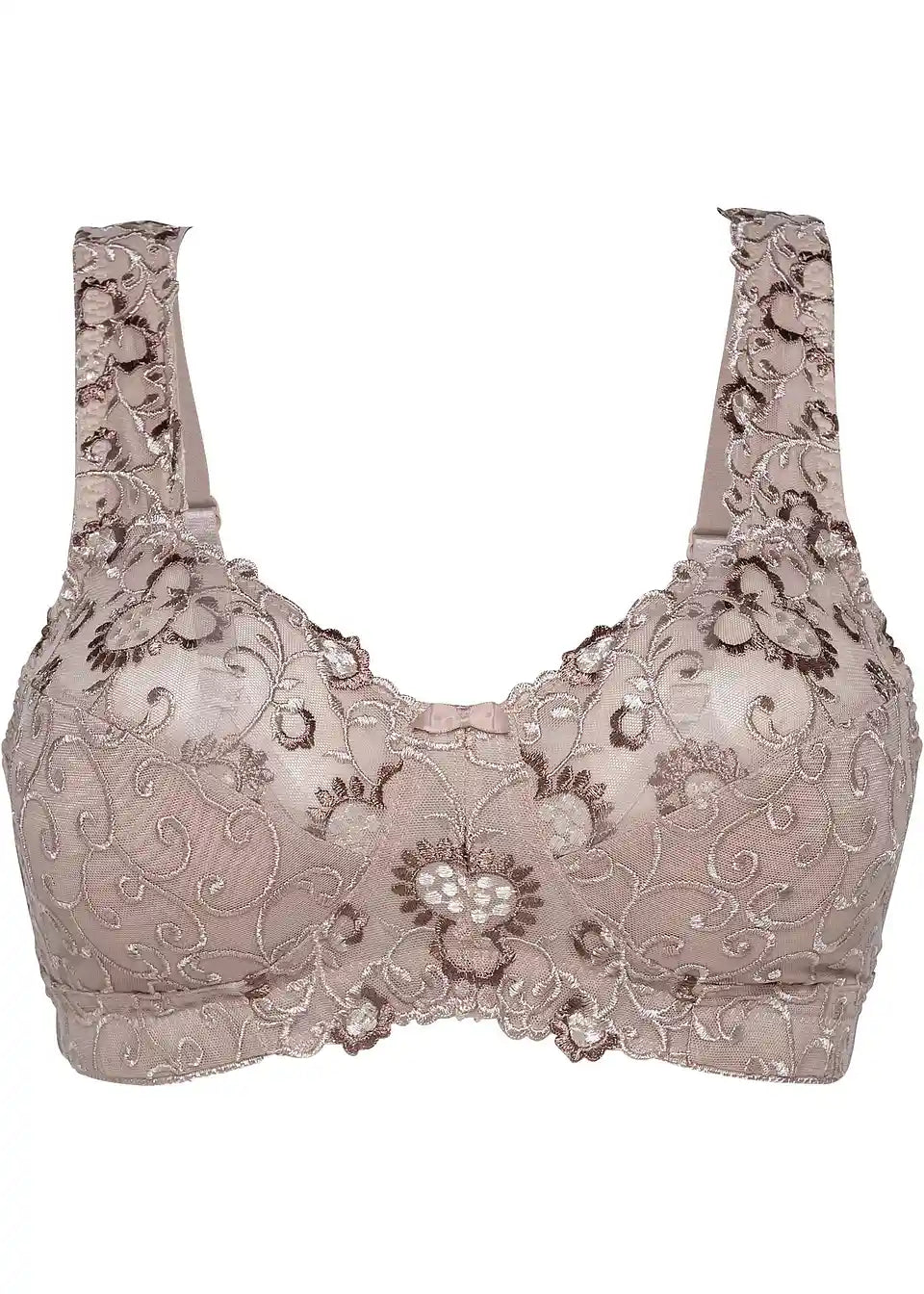 Klasično-eleganten, a predvsem udoben – tako se predstavlja ta prefinjen razbremenilni nedrček z okrasno pentljo na sredini. Dekorativno zavite veje krasijo vezenino na sprednji strani in mu dajejo čudovito ženstven videz. Pokrivna zasnova z oblikovalnimi šivi ima prijetno razbremenilno funkcijo. Podložene naramnice in zapenjanje na hrbtu sta pri večjih velikostih še širša za optimalno udobje. Ta nedrček brez kosti združuje lastnosti, ki jih mora imeti vsak najljubši kos perila!