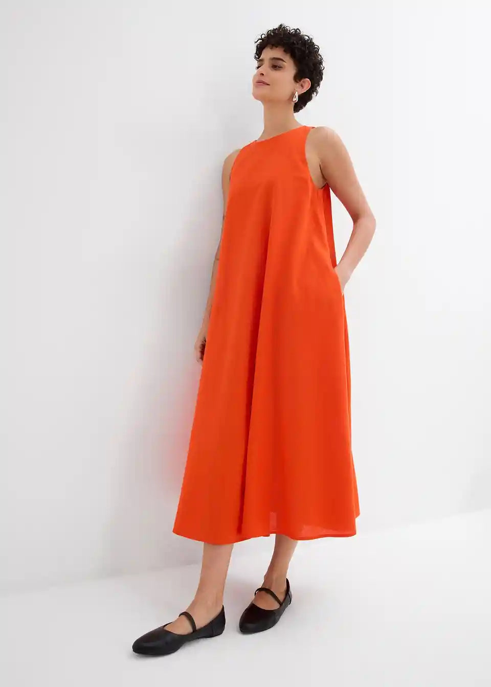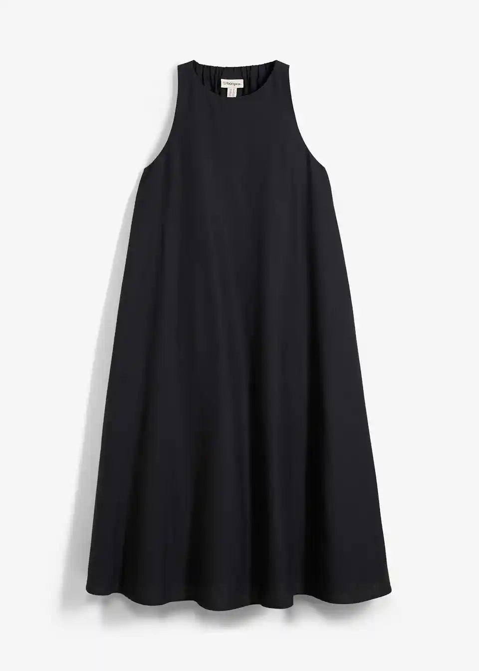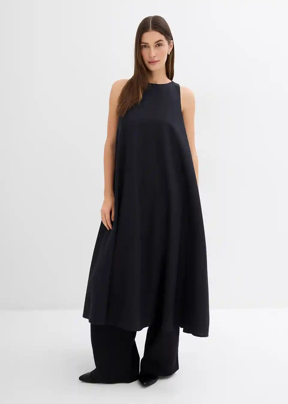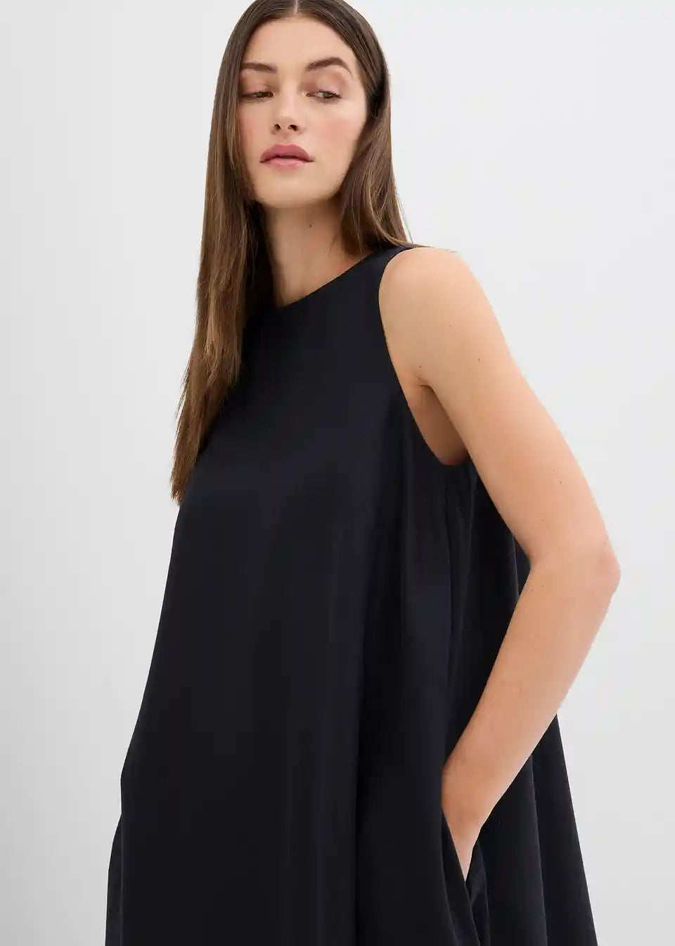 Midi obleka z ohlapnim krojem, elastičnim izrezom in stranskimi všitimi žepi