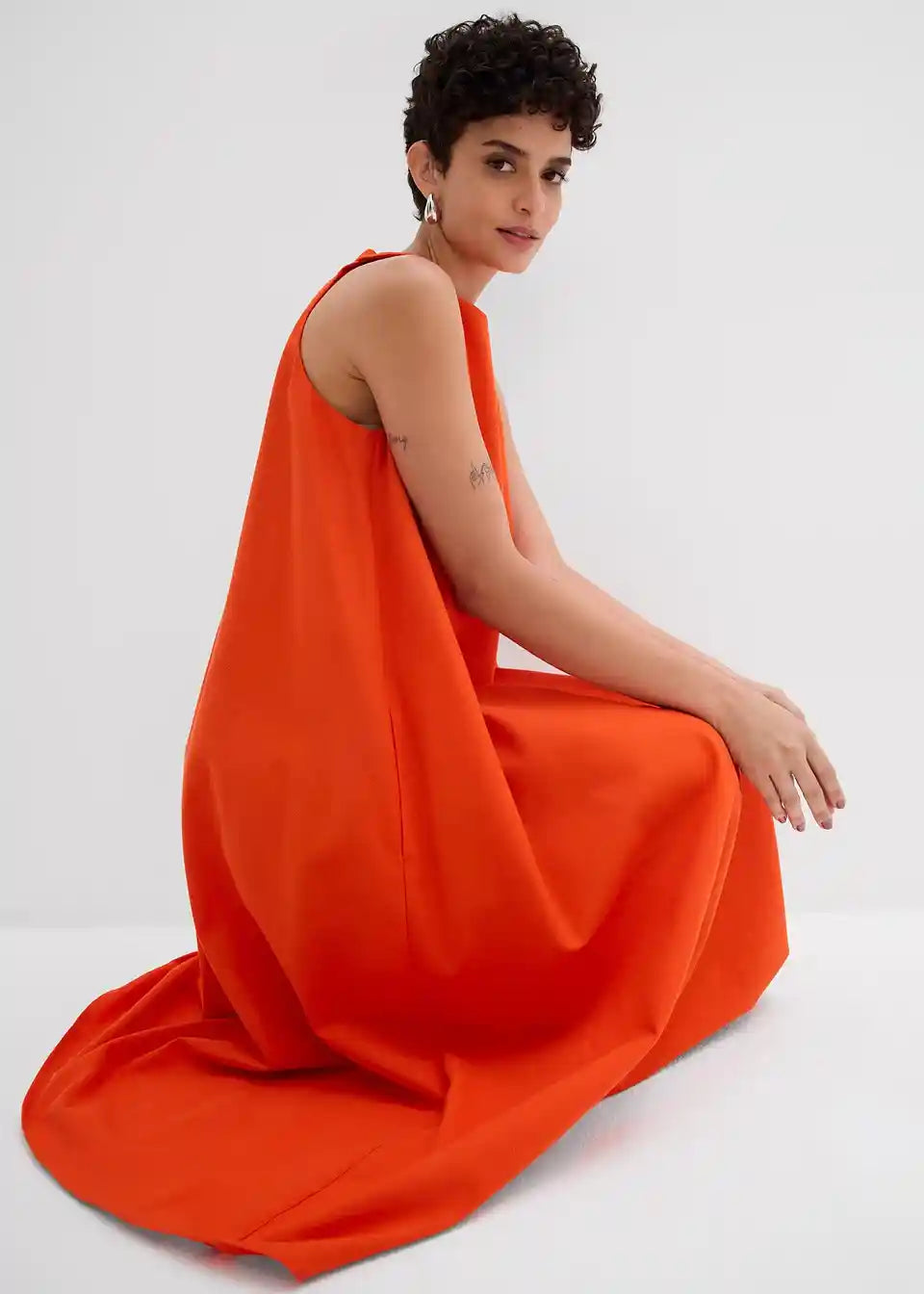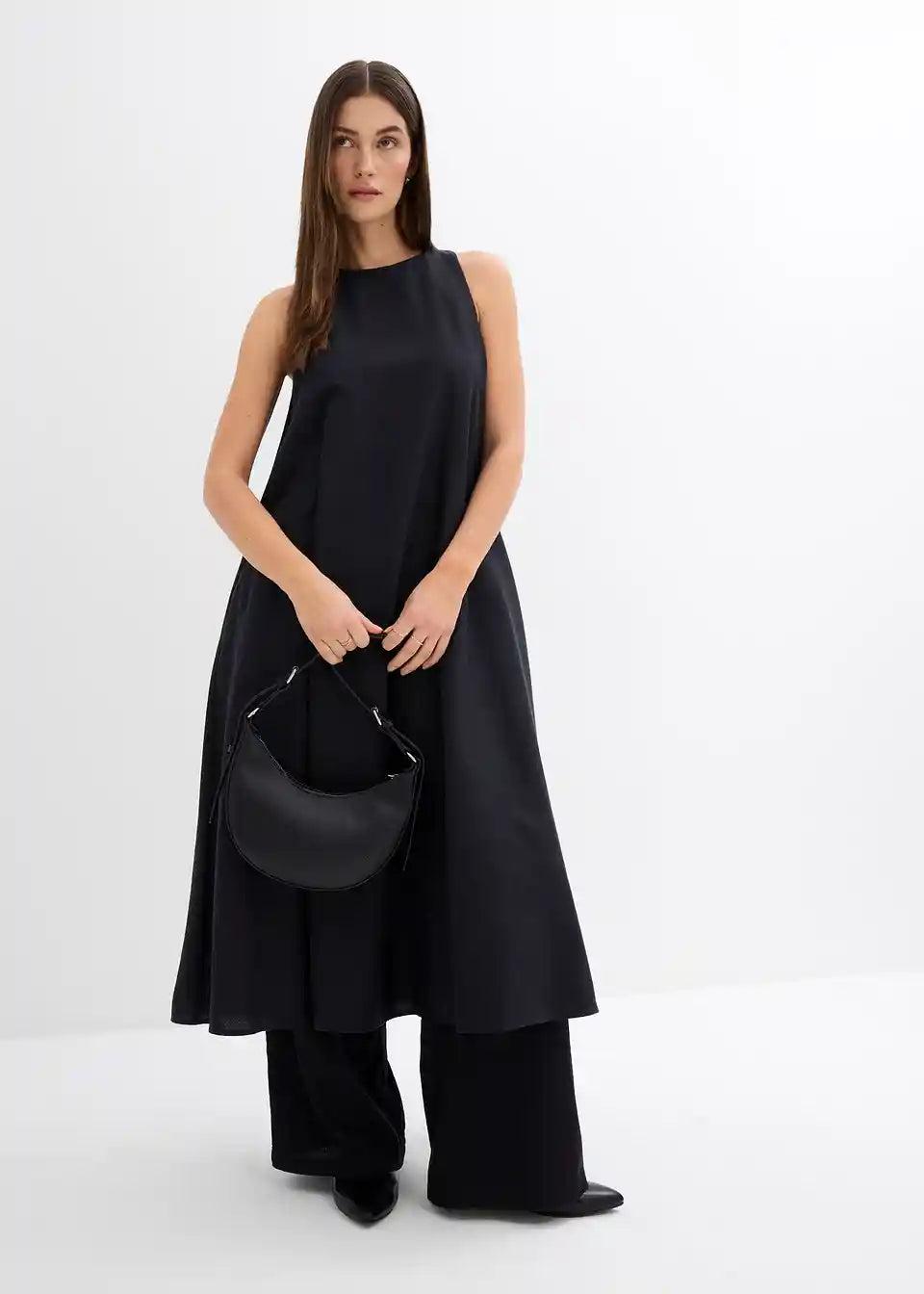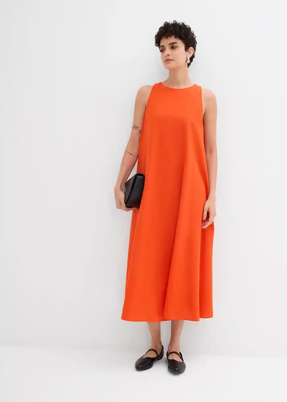 Midi obleka z ohlapnim krojem, elastičnim izrezom in stranskimi všitimi žepi