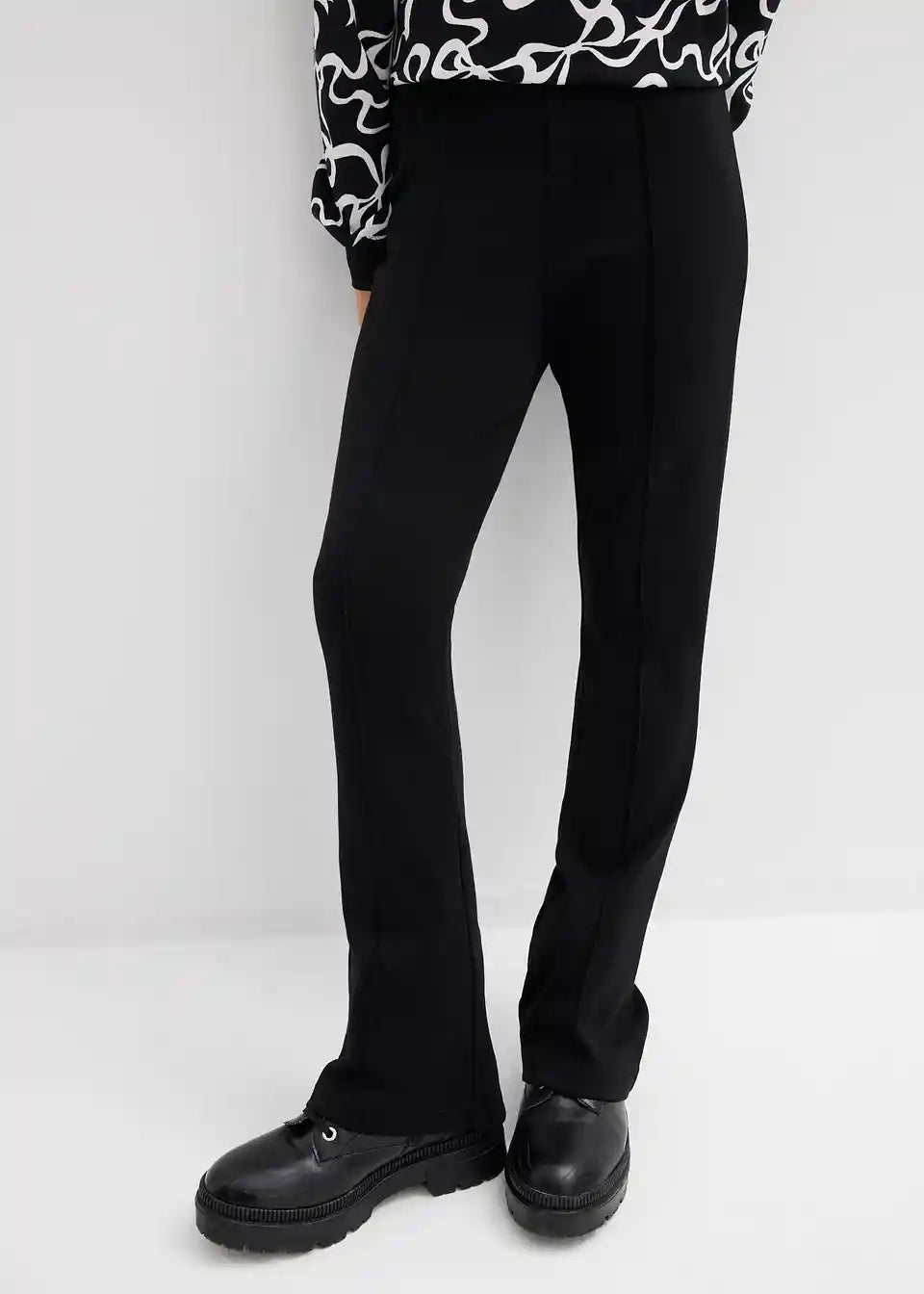 Te modne hlače iz čvrstega jerseya združujejo slog in udobje! Z ozkim krojem in udobnim, ravnim pasom zagotavljajo odlično prileganje. Dolge hlače imajo pri robu razširjen (flared) kroj, ki poskrbi za trendovski videz. Posebej lepe so prešite paspule na sprednji strani, ki dizajnu dodajo eleganten pridih. Idealne za vsakdan ali posebne priložnosti – preprosto obleči in zasijati!