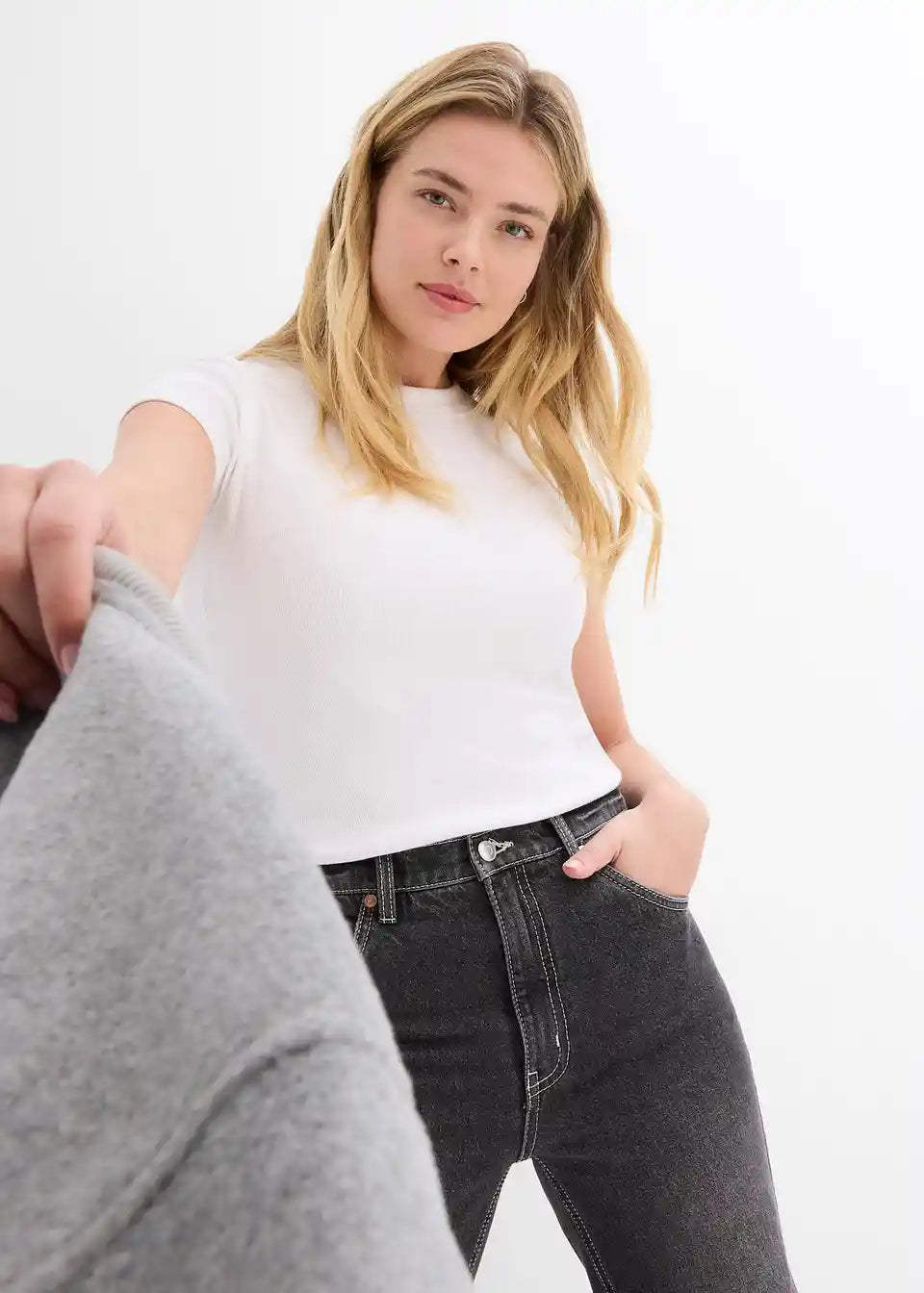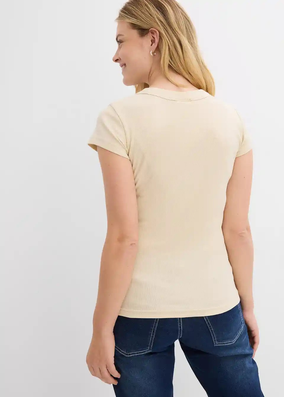 Udobna rebrasta majica s kratkimi rokavi iz organsko pridelanega bombaža z majhnim stoječim ovratnikom. Dolžina v št. 40/42 cca. 66 cm, pralna v pralnem stroju.