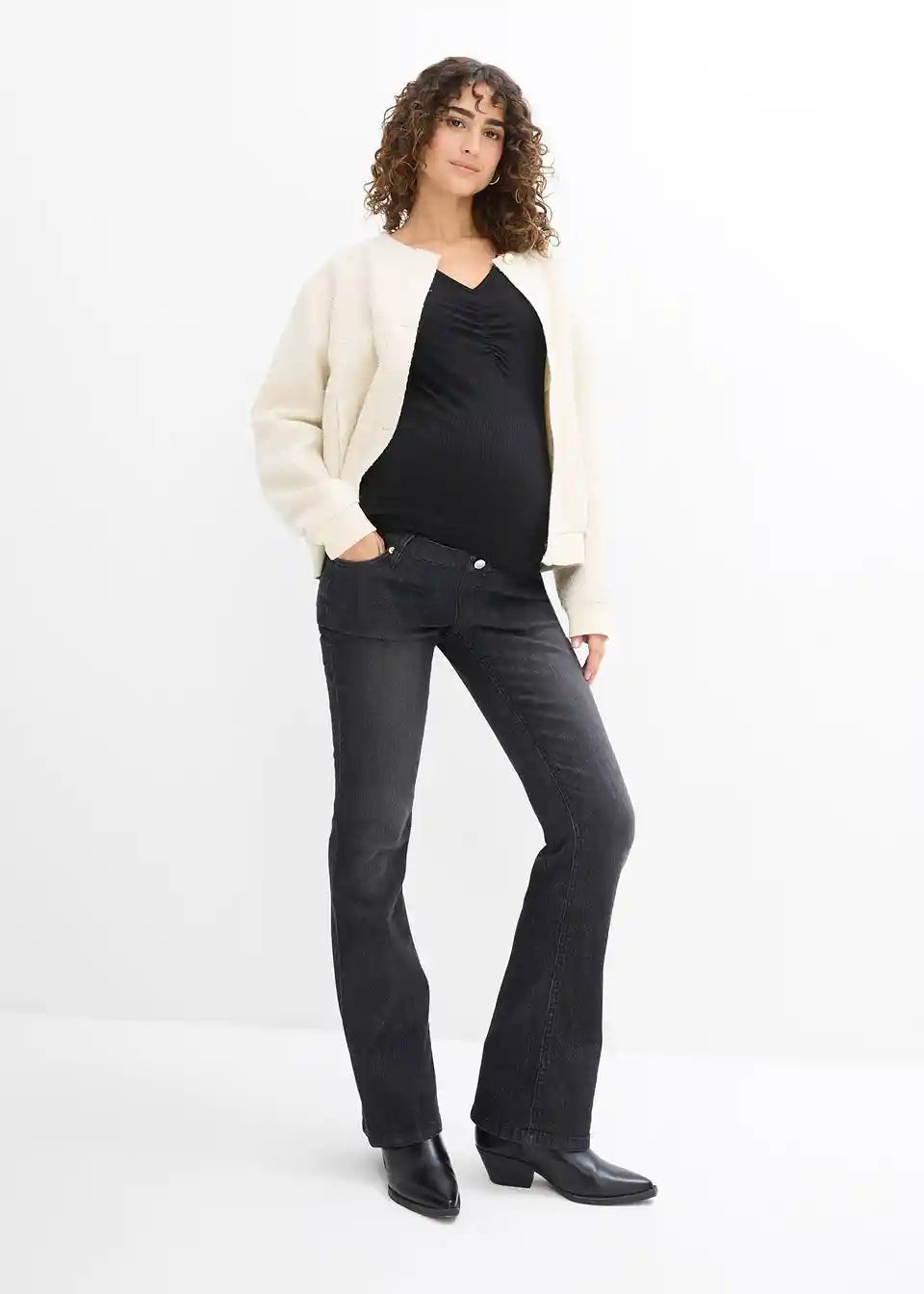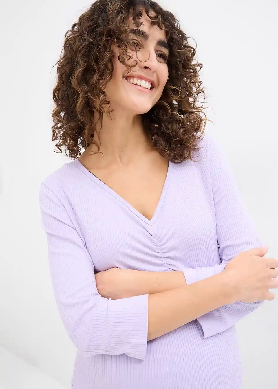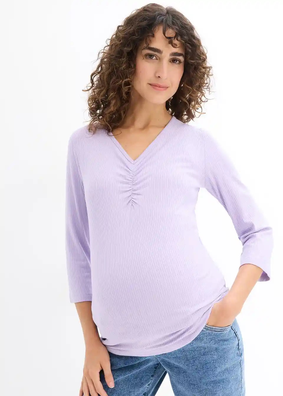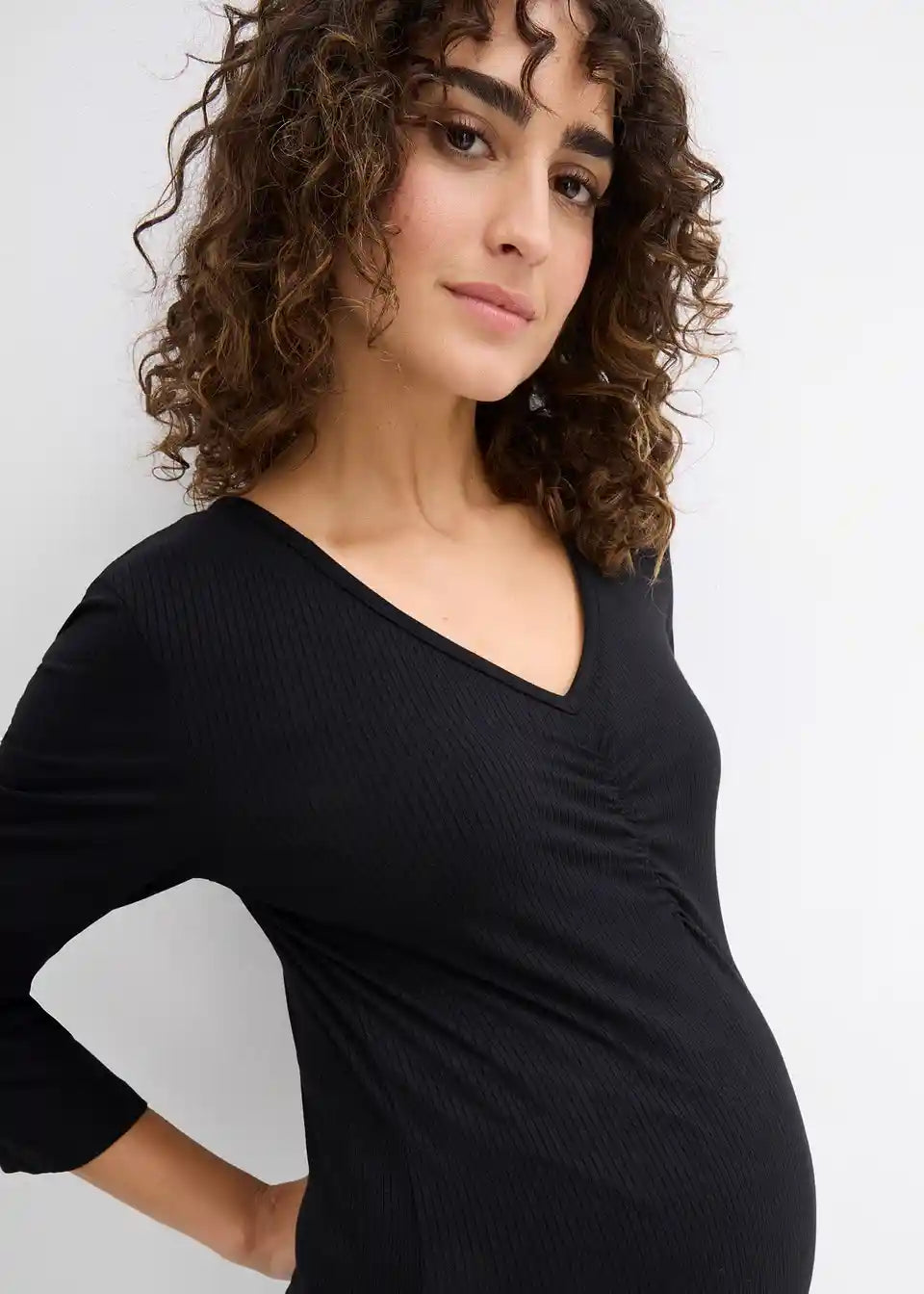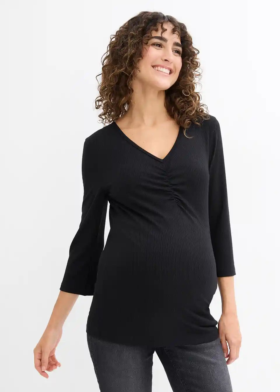Nosečniška majica z okrasnim nabiranjem ob V-izrezu iz mehke viskozne jerseyeve tkanine z raztegljivostjo za udobno nošenje. Elastična rebrasta tkanina se čudovito prilagodi rastočemu trebuščku in hkrati omogoča veliko svobode gibanja. S 3/4 rokavi in dolžino do bokov.