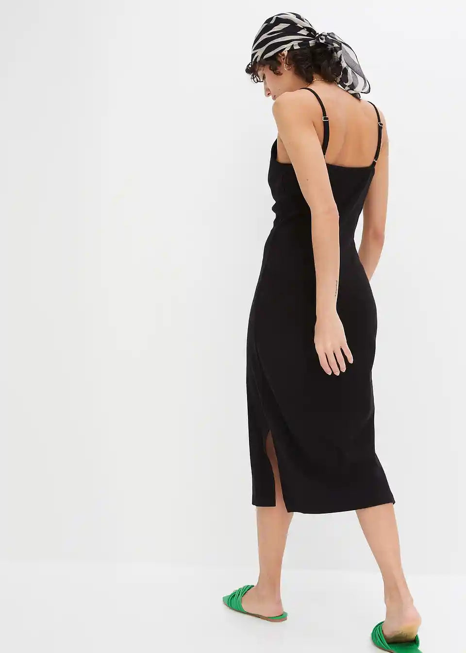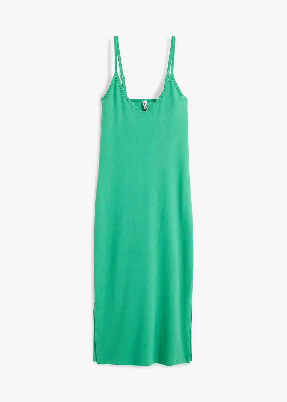 Oprijeta rebrasta obleka v modni midi dolžini in trendovski poletni barvi