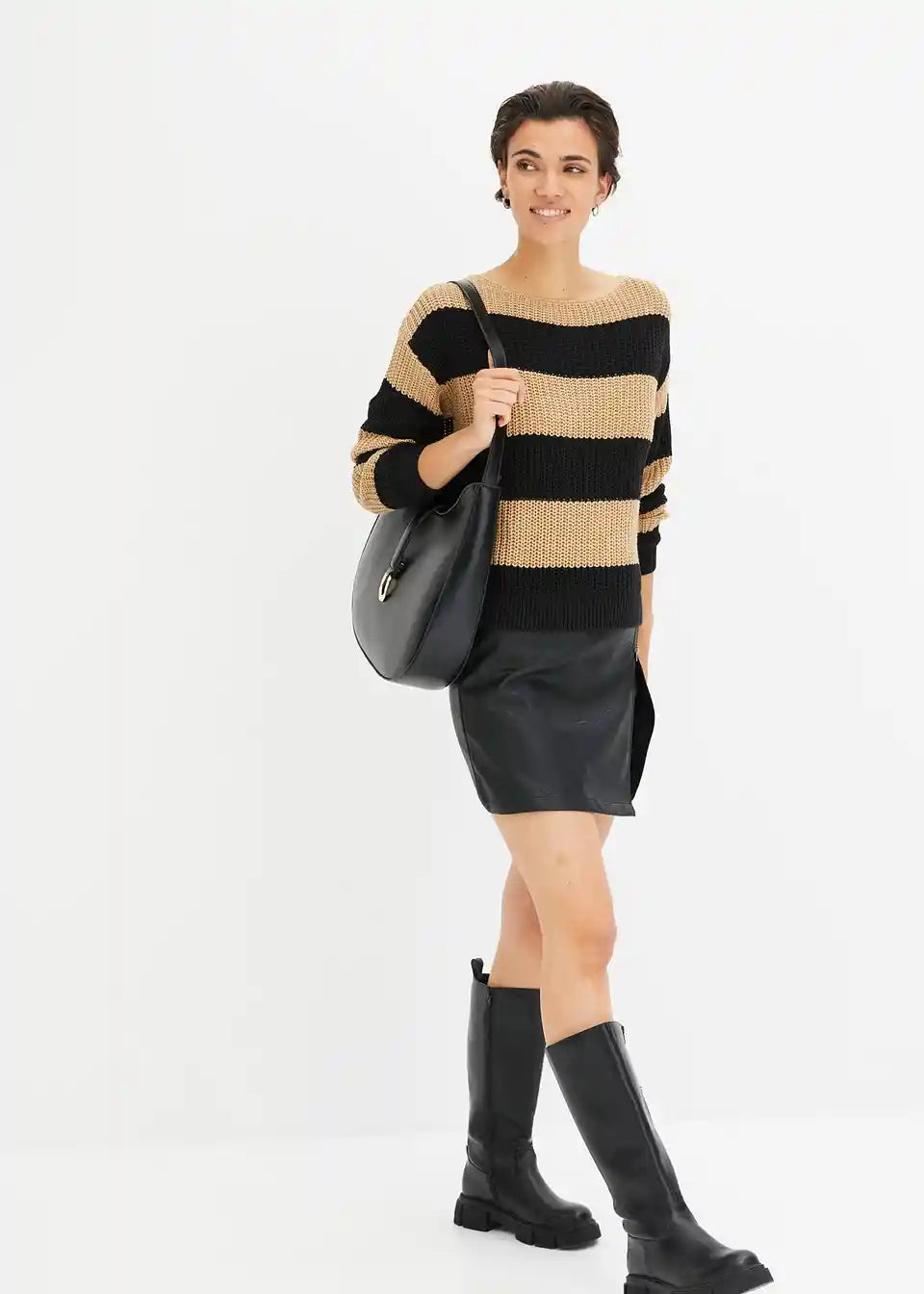 Ležeren pleteni pulover s črtami in čolniškim izrezom