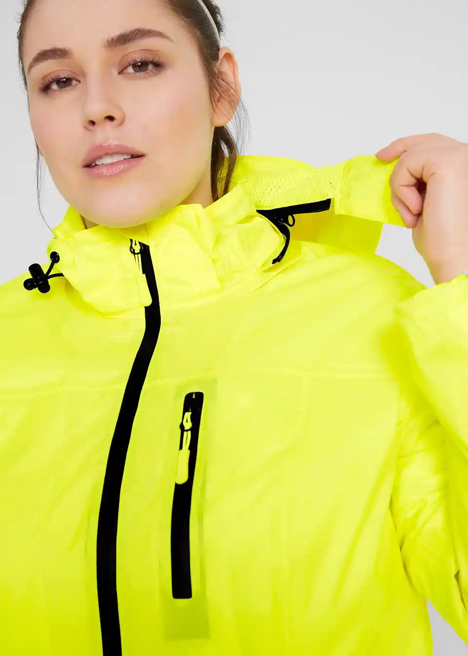 Funkcije:s snemljivo kapuco, iz zračnega materiala, z odsevnimi detajli, nastavljivo širino in za veter neprepustno vodoodporno površino
