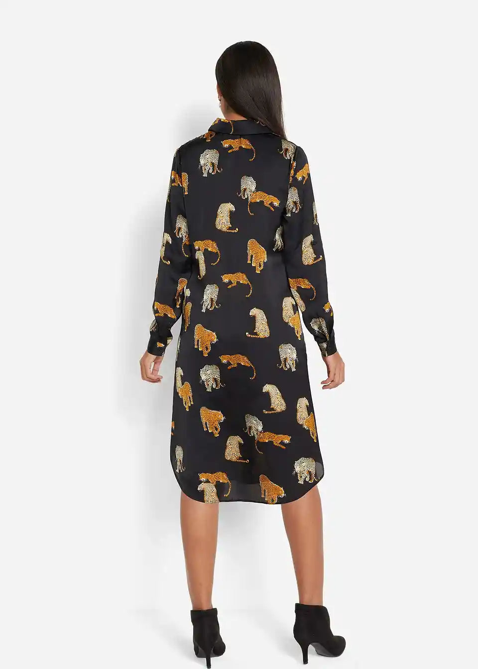 Čudovita satenasta Hemdblusenkleid z modernim leo-potiskom