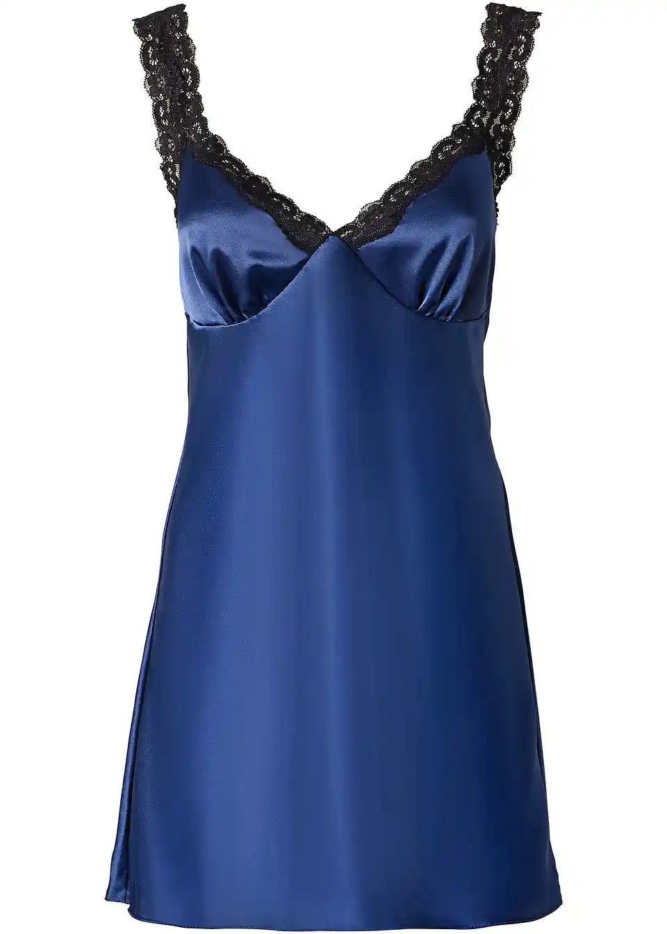 To negliže iz sijočega satena obljublja čisto zapeljivost. Krojen v oprijeti A-liniji popolnoma poudari žensko silhueto. Del modrca z volančki zagotavlja optimalno poudarjanje ženskega dekolteja. Prisrčni, romantični detajli vključujejo naramnice iz nežne čipke in čipkasti okras na izrezu seksi negližeja. Primerno do košarice D.