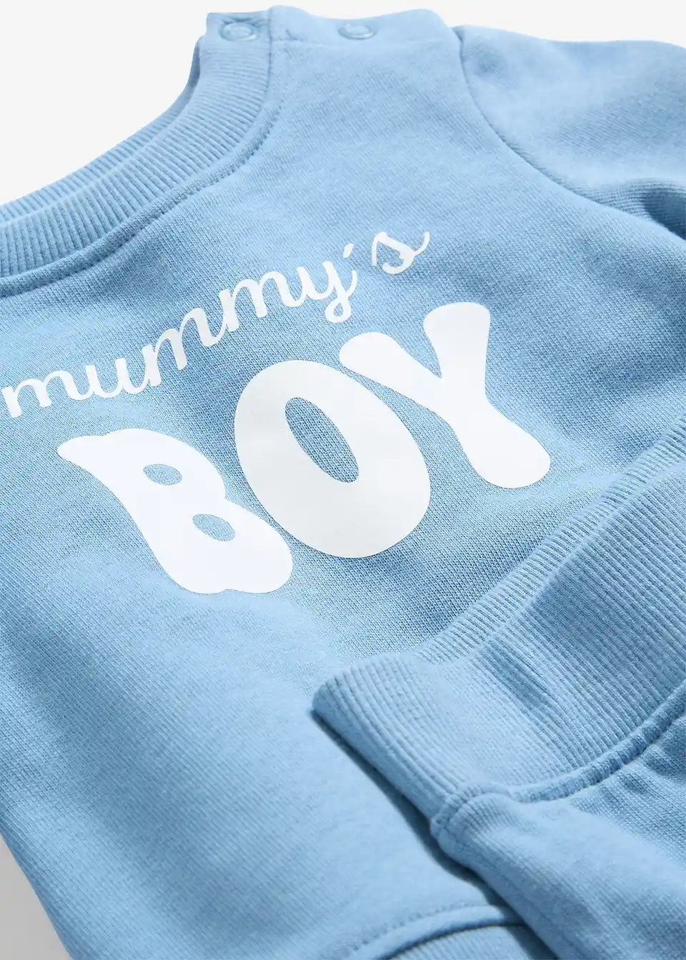 Pulover s potiskom "Mommys Boy" in ujemajoče se hlače iz trenirke z elastičnim pasom.