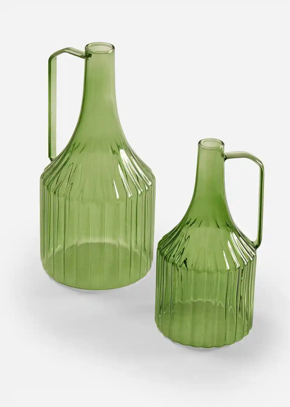 Ta eleganten set vaz je sestavljen iz dveh umetniško oblikovanih vaz v privlačnem zelenem odtenku, ki izstopata s svojo edinstveno obliko in strukturo. Mehke linije in eleganten sijaj stekla vsakemu prostoru dodajo svež in moderen pridih. Idealne za posamezne rože ali kot dekorativni element, te vaze ustvarjajo harmonične poudarke in prinašajo naravno eleganco v prostor. Ta set je popolna dopolnitev vsakega doma in je prav tako odlično darilo.
