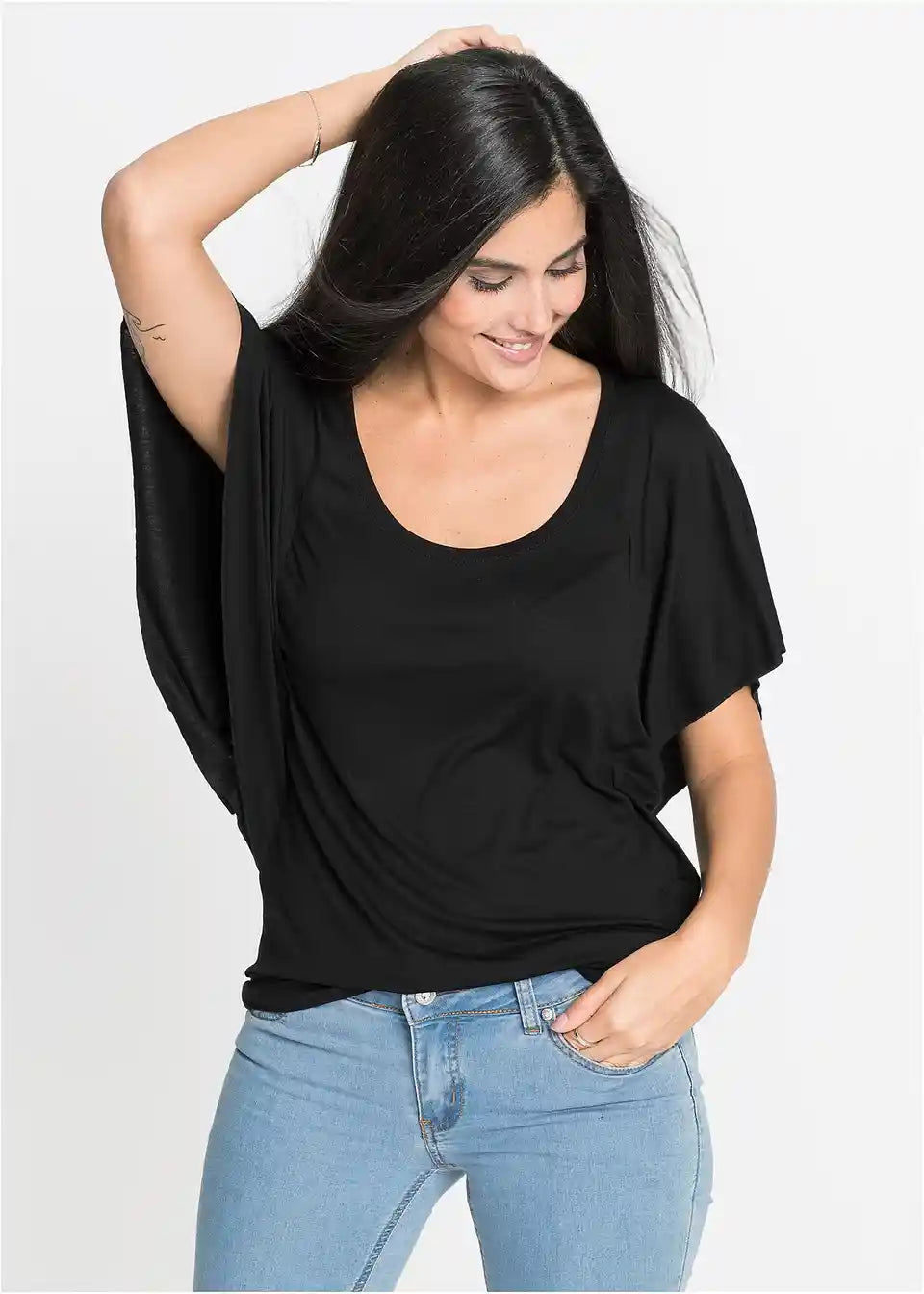 Eleganten Shirt z netopirskimi rokavi in okroglim izrezom